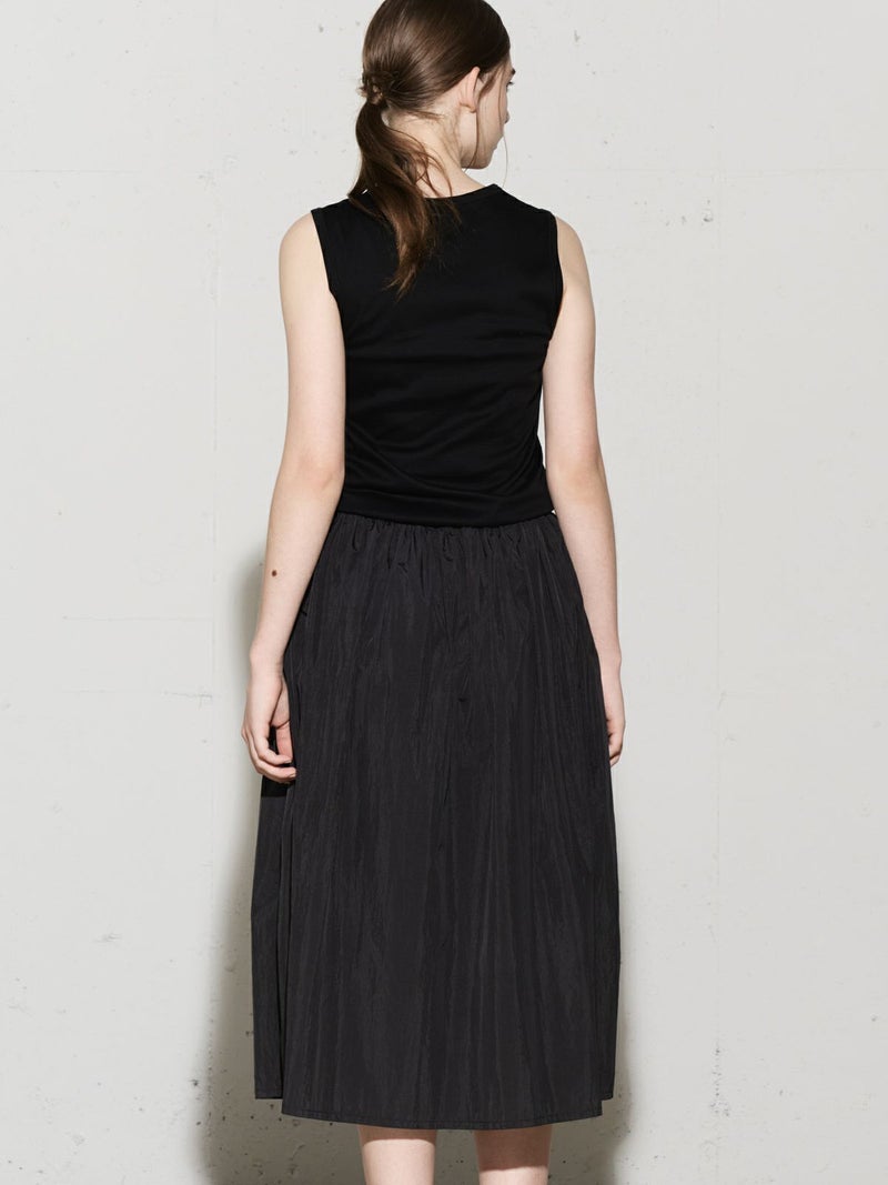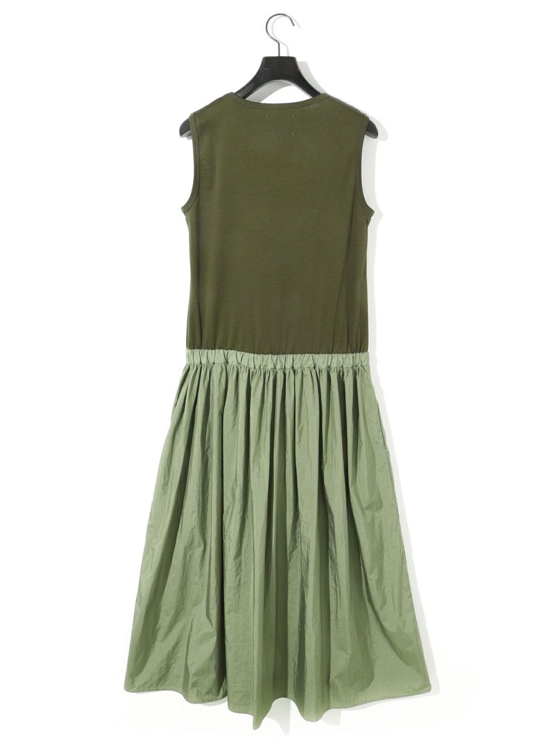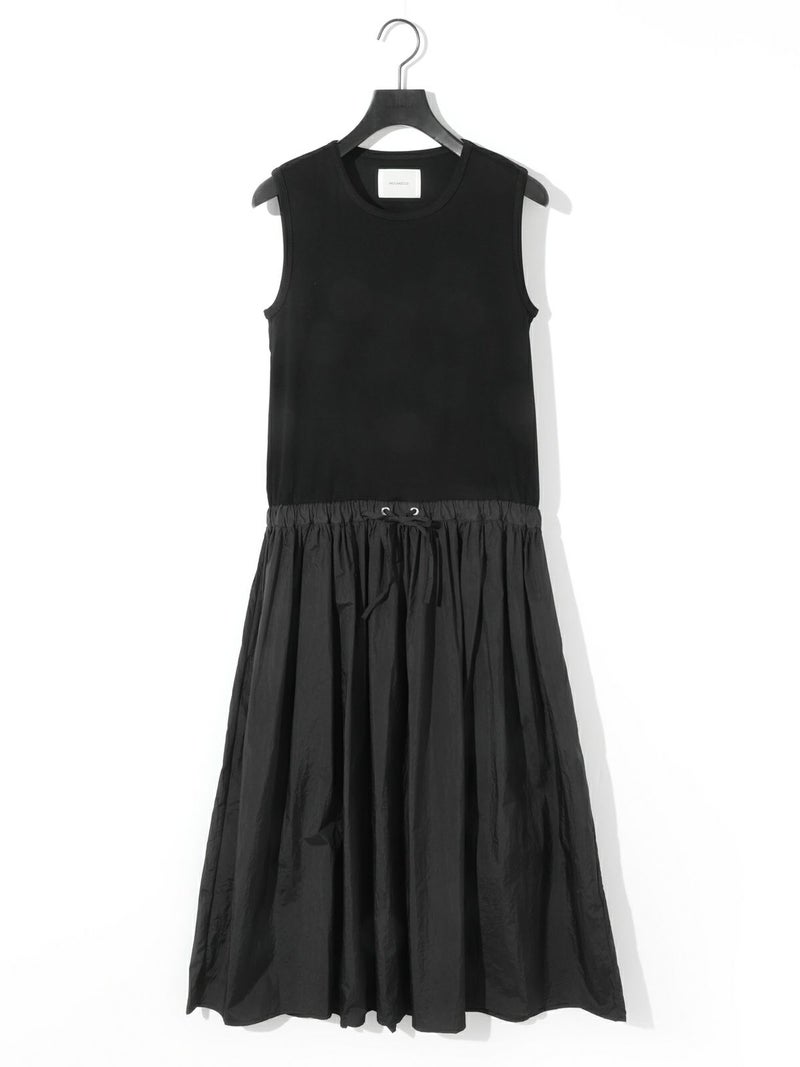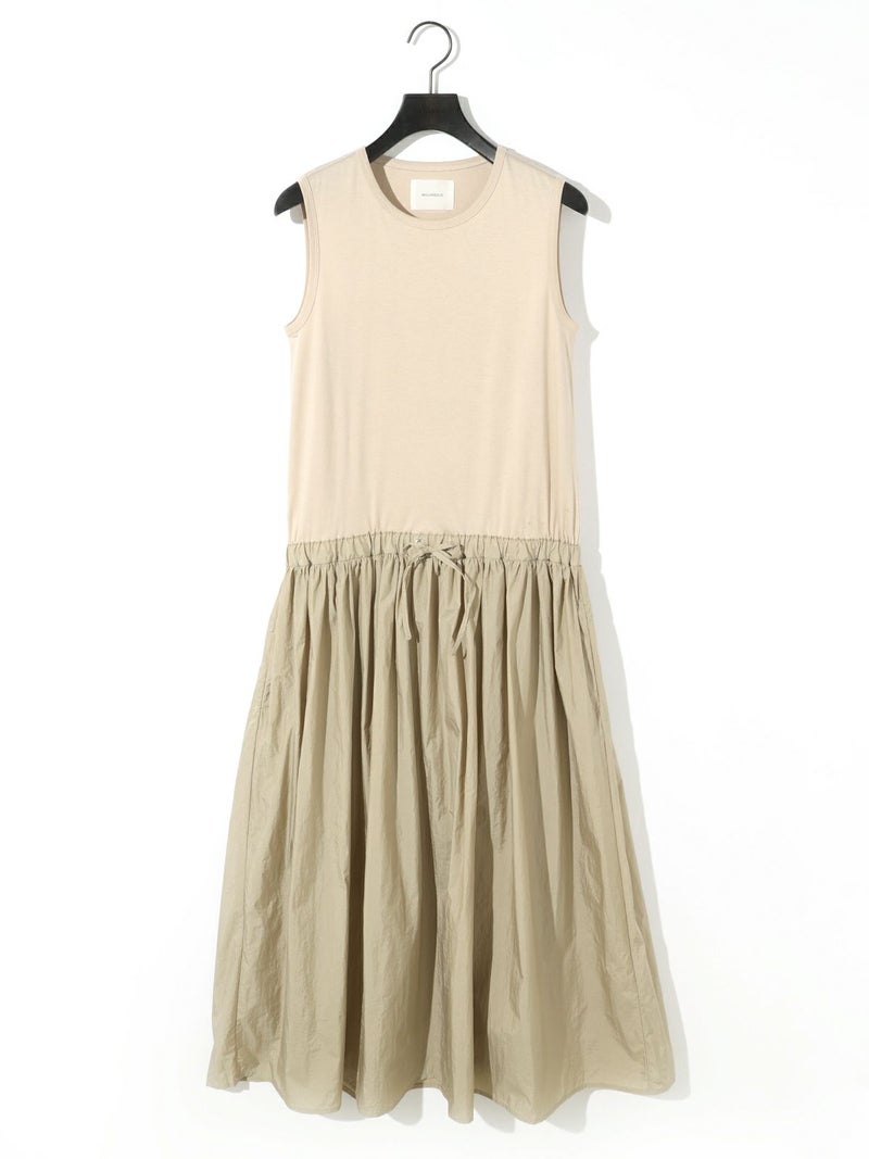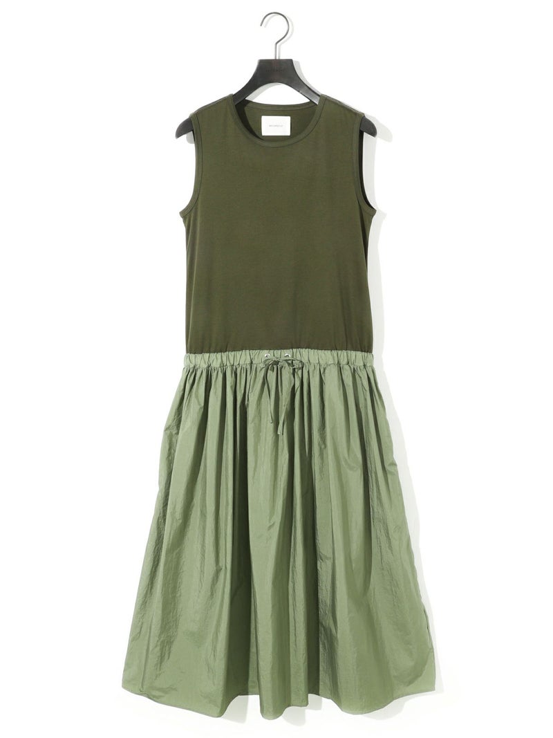 カットソー×布帛を使用したナイロン切替ワンピースです。ノースリーブのタンクトップからフンワリ感のナイロンスカートをウエスト調整紐で腰位置をキープしていただけるデザイン。ナイロン生地のスカートはシワ感があり生地の風合いも魅力的。スポーティーでかっこよくもあり女性らしい雰囲気を印象付ける1枚です。夏場は涼しく秋口まで長く着こなせるワンピースです。