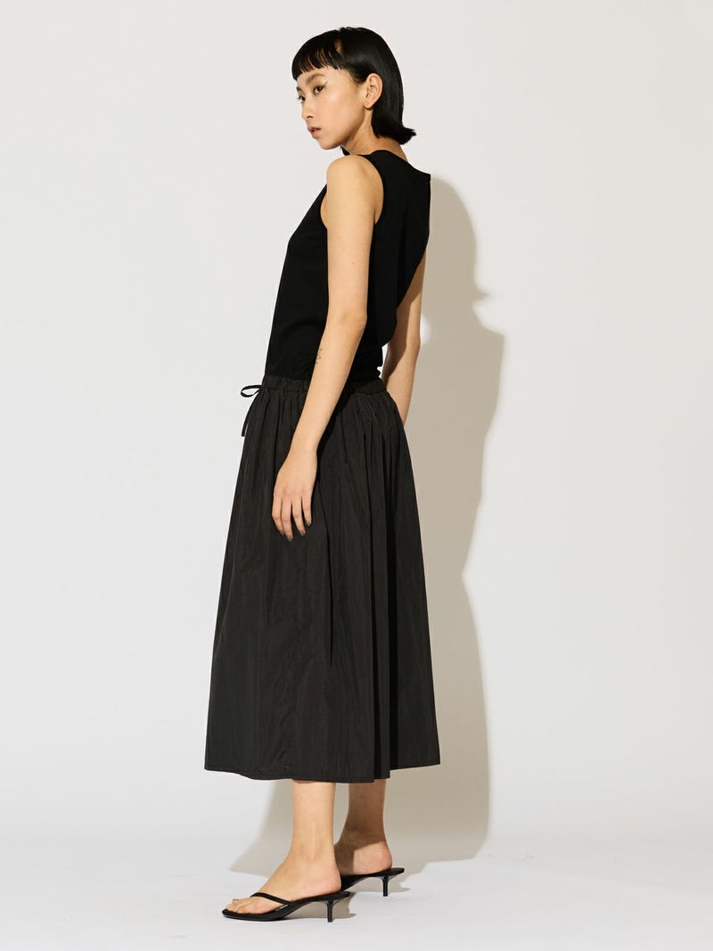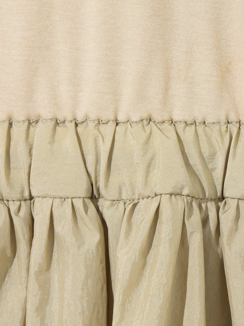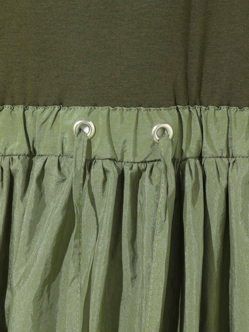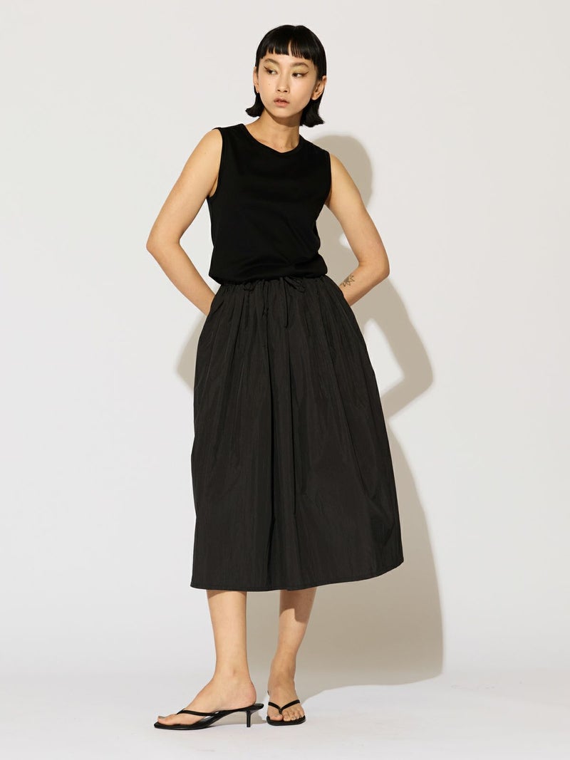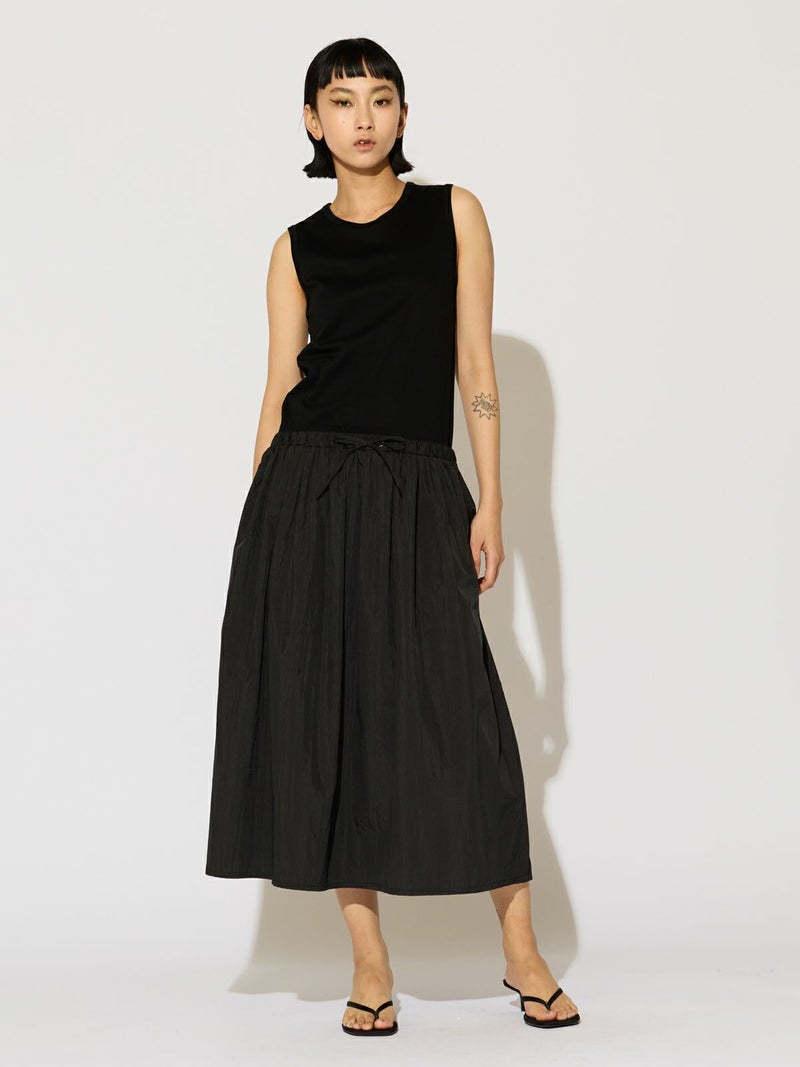 カットソー×布帛を使用したナイロン切替ワンピースです。ノースリーブのタンクトップからフンワリ感のナイロンスカートをウエスト調整紐で腰位置をキープしていただけるデザイン。ナイロン生地のスカートはシワ感があり生地の風合いも魅力的。スポーティーでかっこよくもあり女性らしい雰囲気を印象付ける1枚です。夏場は涼しく秋口まで長く着こなせるワンピースです。