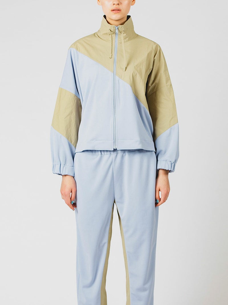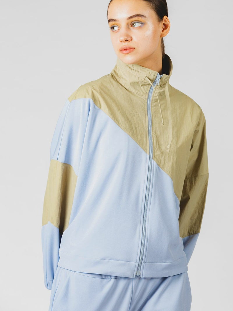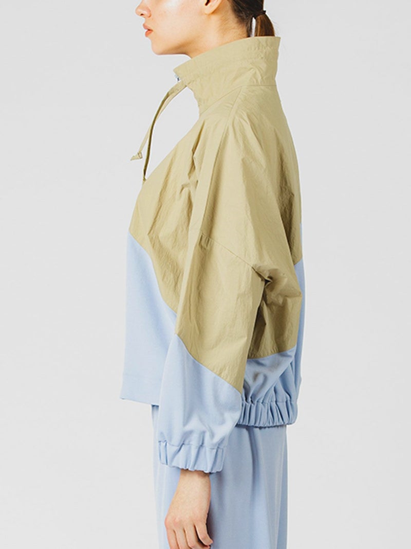 春の柔らかい色合いが印象的なバイカラートラックジャケットです。前後へ続く配色と生地をあえて変化させたスポーティなデザイン。淡い色合いがしまりのあるかっこいい1枚に仕上がっています。ジップアップ使用で首を覆うスタンドネックがシャープな印象を表現しています。首紐付。手首とバックの裾部分はゴムが入っています。風を通しにくく、袖を上げやすいのもポイント。同素材を使用した1-165004(バイカラートラックパンツ)と上下で着ても素敵です。