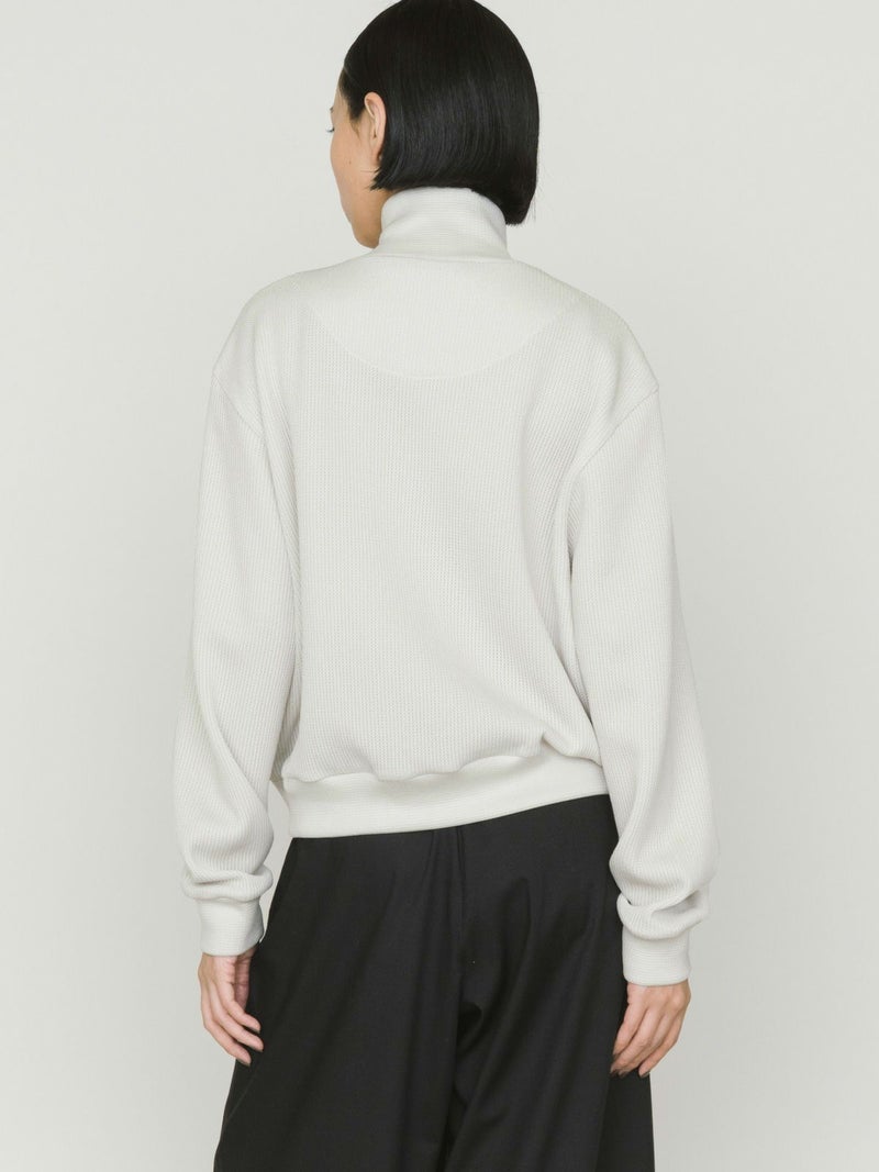 編み柄はジャージ素材、表8ゲージ/裏32ゲージのボンディングニット調の暖かなドライバーズブルゾンです。ショート丈のすっきりとしたデザインですがワイド感のある着やすいサイズ感が特徴。Wファスナー使用。アウターの下に着用でき保温効果の高い1枚です。ハイネックの首元はしっかりと寒さ対策もできます。ユニセックスで着用可能。