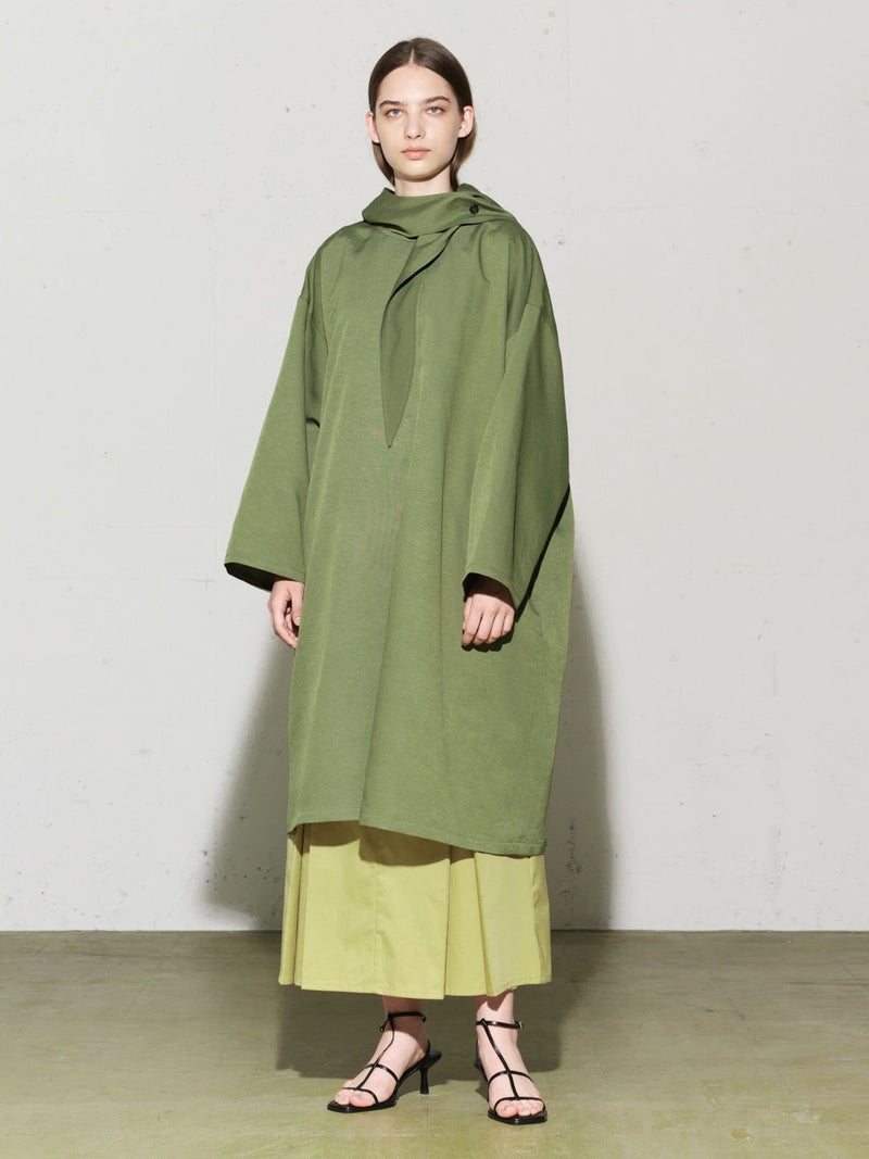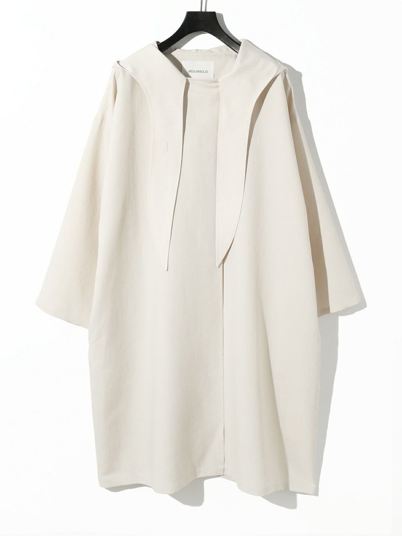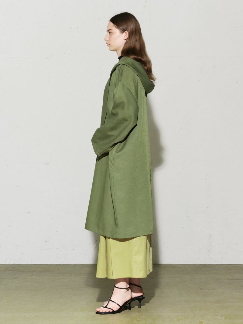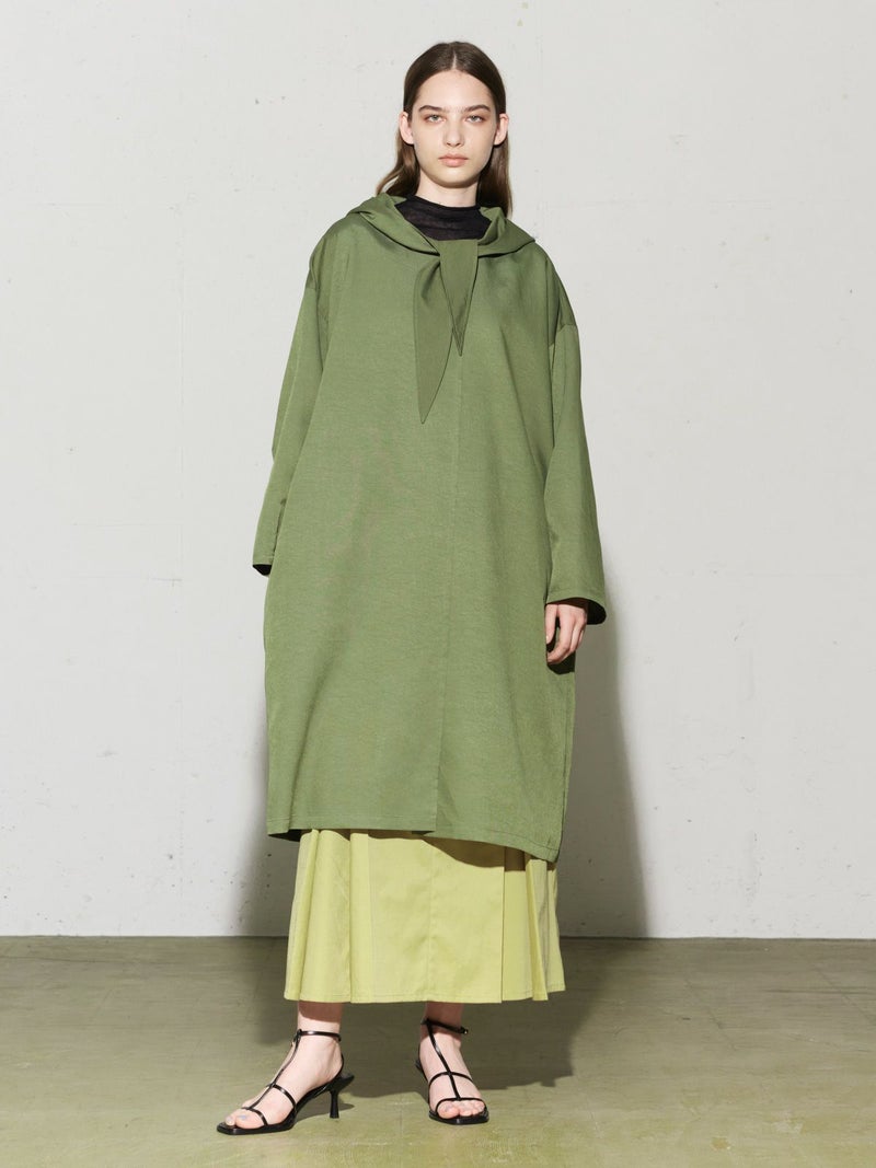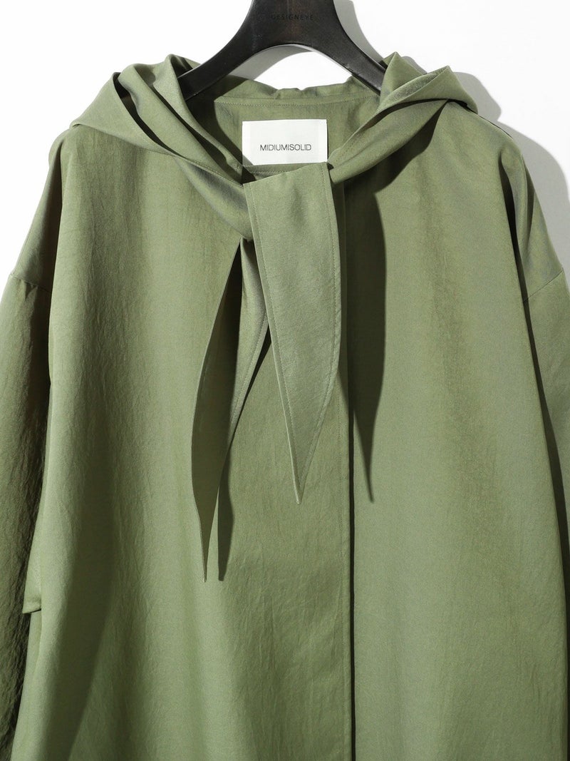 MIDIUMISOLIDのスプリングコートでもあるフード付きオーバーコートです。ゆとりのあるオーバーサイズに仕上げました。フードとタイカラーが特徴的。襟元のタイは女性らしい雰囲気もありながら小ぶりなフードがカジュアル感も表現した魅力的なデザインです。結んで垂らしてボタン留めても素敵です。落ち着きのある3色のカラー展開となっています。