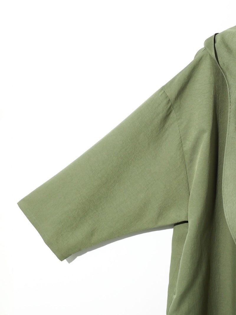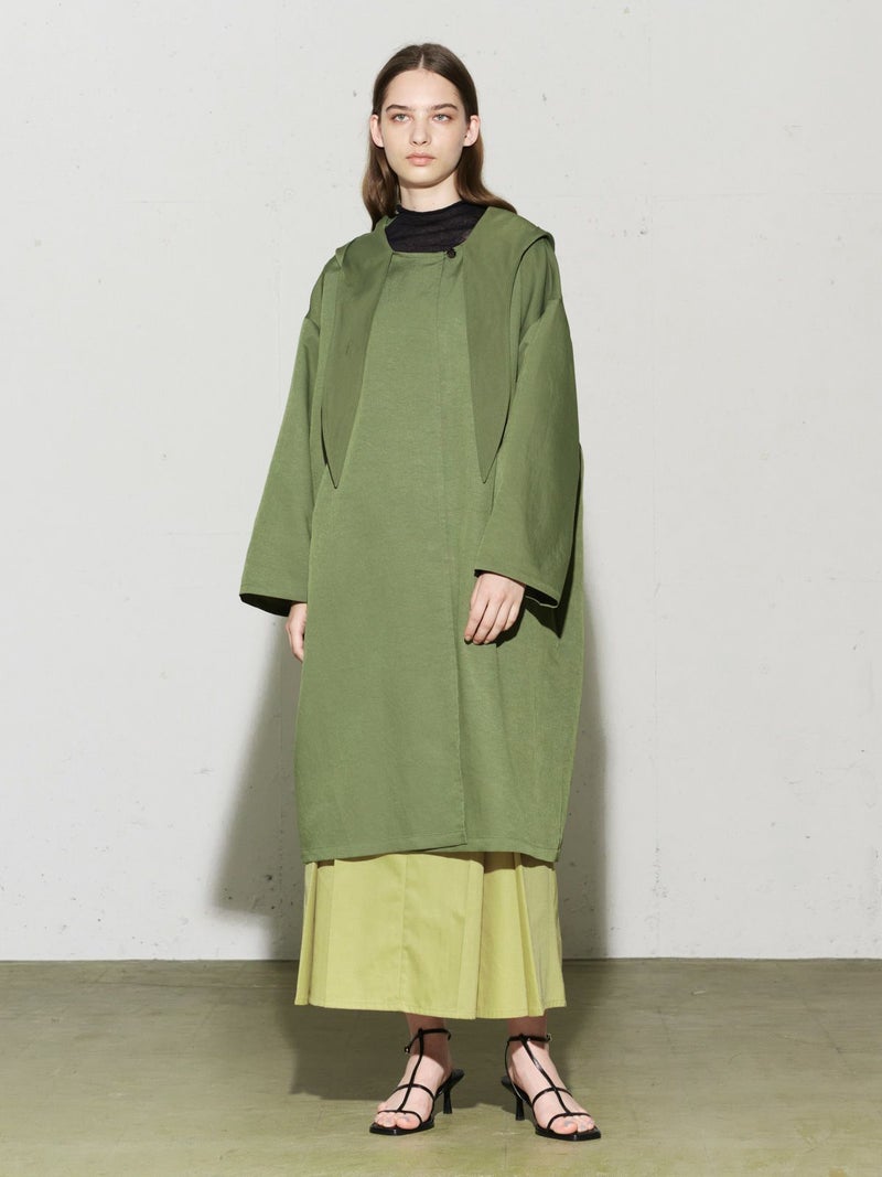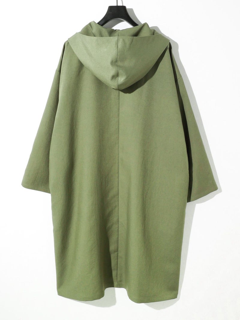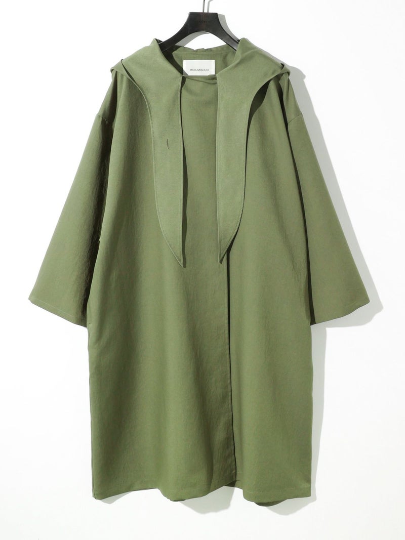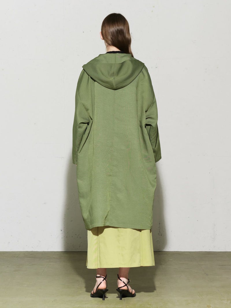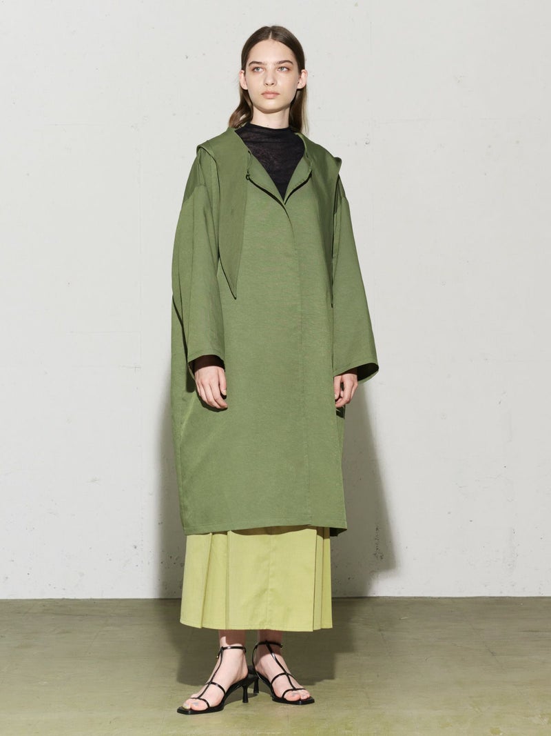MIDIUMISOLIDのスプリングコートでもあるフード付きオーバーコートです。ゆとりのあるオーバーサイズに仕上げました。フードとタイカラーが特徴的。襟元のタイは女性らしい雰囲気もありながら小ぶりなフードがカジュアル感も表現した魅力的なデザインです。結んで垂らしてボタン留めても素敵です。落ち着きのある3色のカラー展開となっています。