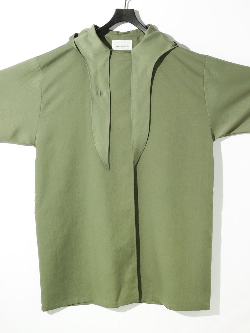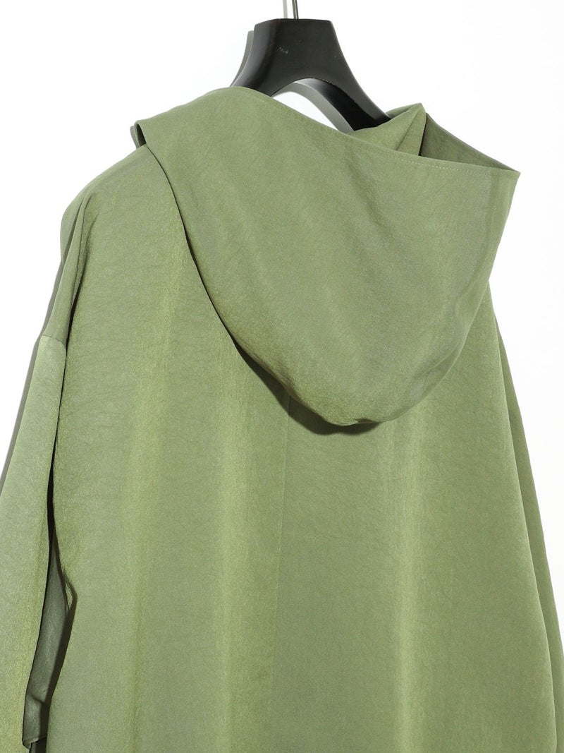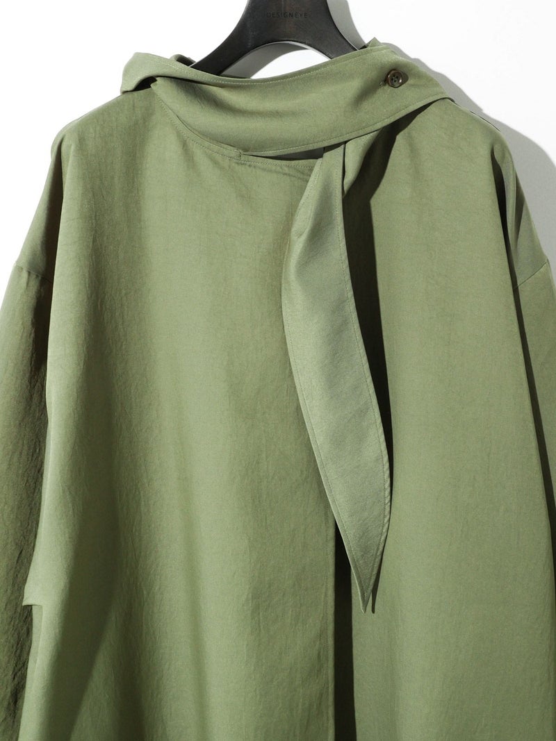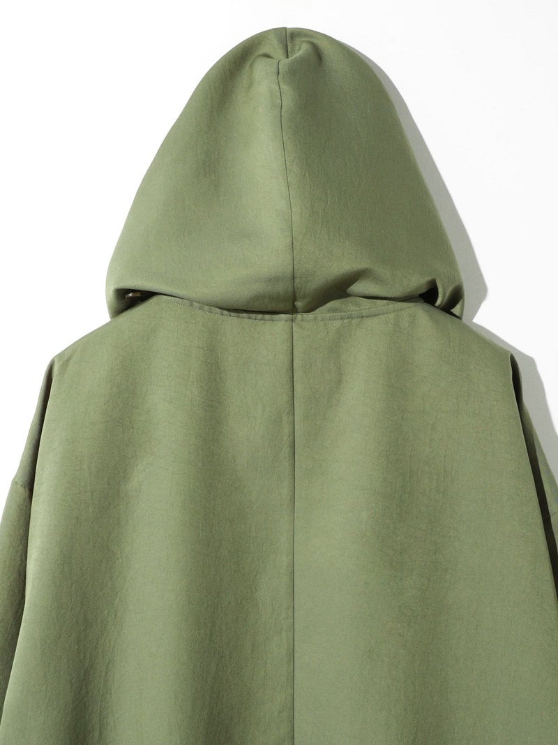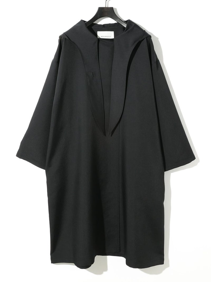 MIDIUMISOLIDのスプリングコートでもあるフード付きオーバーコートです。ゆとりのあるオーバーサイズに仕上げました。フードとタイカラーが特徴的。襟元のタイは女性らしい雰囲気もありながら小ぶりなフードがカジュアル感も表現した魅力的なデザインです。結んで垂らしてボタン留めても素敵です。落ち着きのある3色のカラー展開となっています。