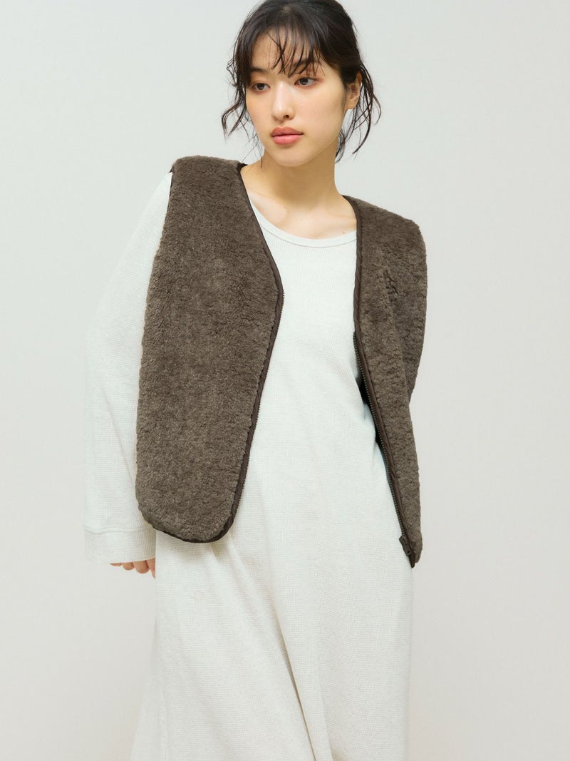 身長152cmでヒップ下約10cmのミドル丈、身長160cmでヒップがしっかり隠れる丈感です。全体的にゆったりとしたシルエットで、特に袖にゆとりを持たせた丸みのあるフォルムが印象的。裾やネック部分を絞ることでシルエットに変化をつけられ、裾を絞ってコクーンのような丸みを出して着るのもおすすめです。ライナーのボアはふっくらと柔らかく、とても暖かで肌あたりも快適。ベストは取り外したり、コートの上から重ねて着用するなど、季節や気分に合わせてさまざまな着こなしが楽しめる一枚です。ボリュームのあるシルエットですがミドル丈でボトムス問わずバランスが取りやすくロングシーズン飽きずにコーディネートで活躍してくれそうな1枚です。
