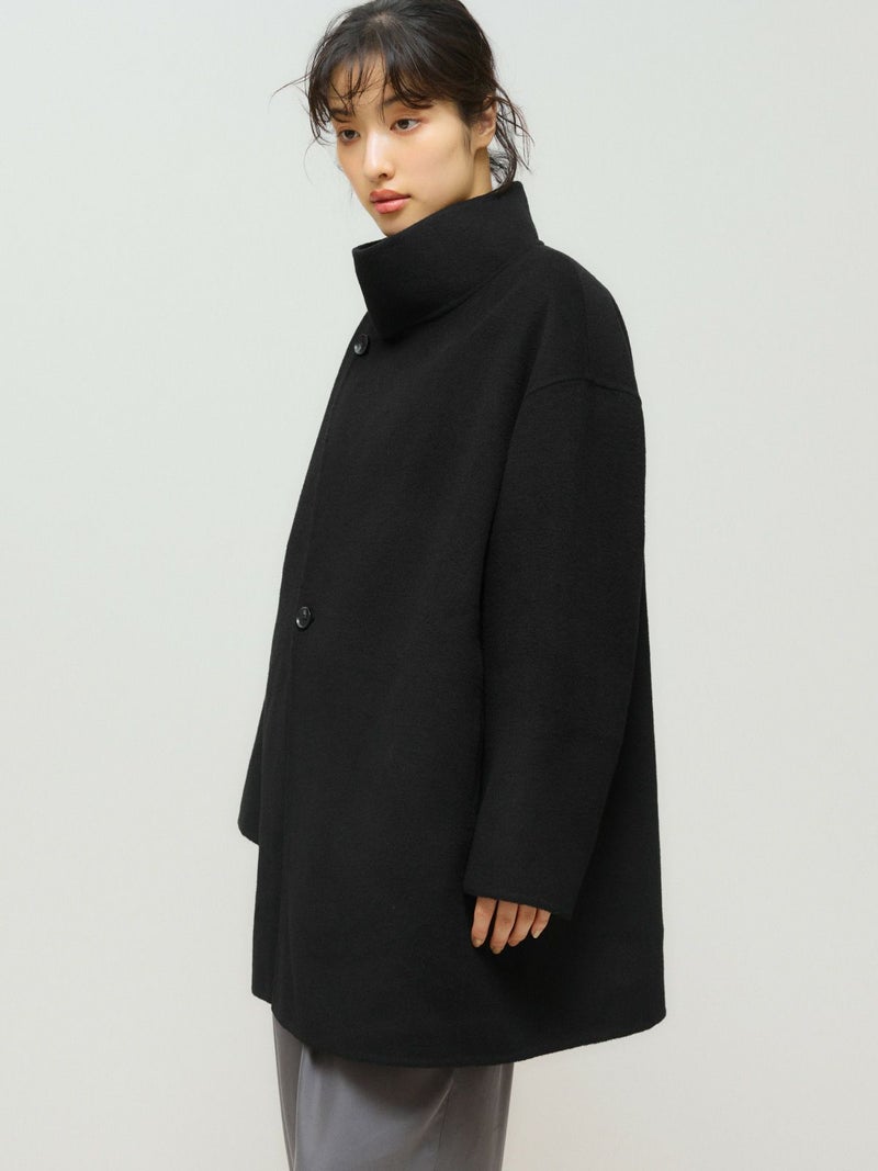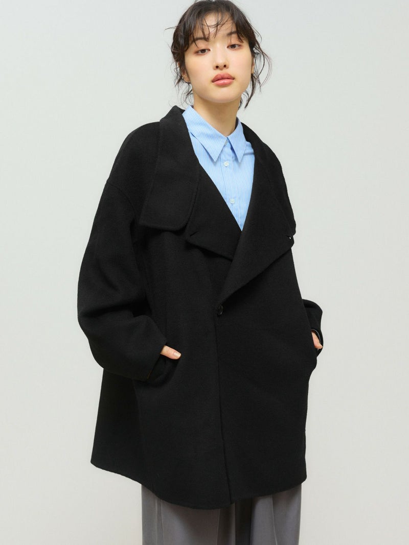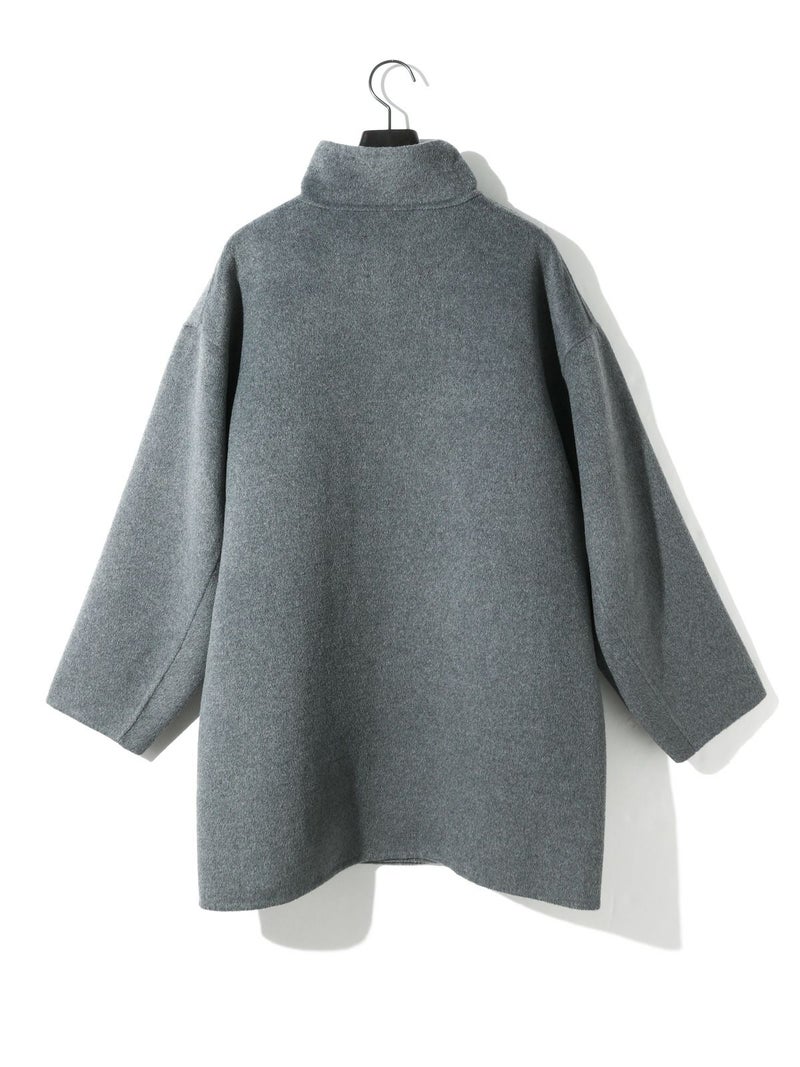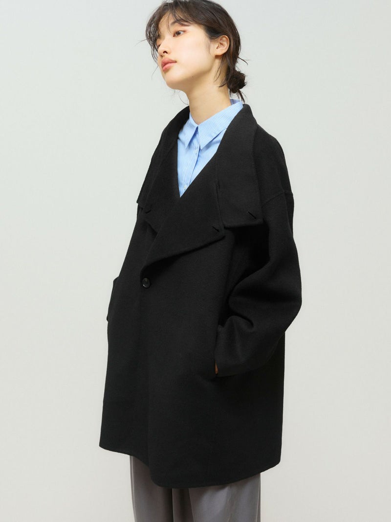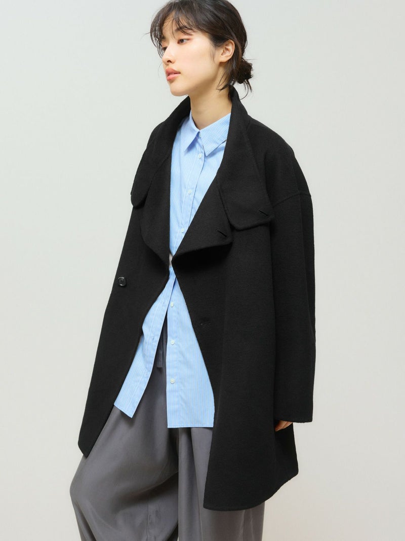 身長152cmでちょうどひざ上の丈感、身長160cmで太ももが半分ほど隠れる丈感です。ゆったりとしたシルエットながら、柔らかく軽やかなリバー素材の落ち感で、すっきりとした印象で着用できます。ボタンを外すと大きめのテーラードカラーに、ボタンを留めると幅広のスタンドネックになり、着こなしの印象を変えて楽しめます。上質な素材ならではの軽さとあたたかさがあり、ボトムスを選ばず幅広いコーディネートにマッチ。中にもしっかり着込めるため、ロングシーズンコーディネートで活躍します。