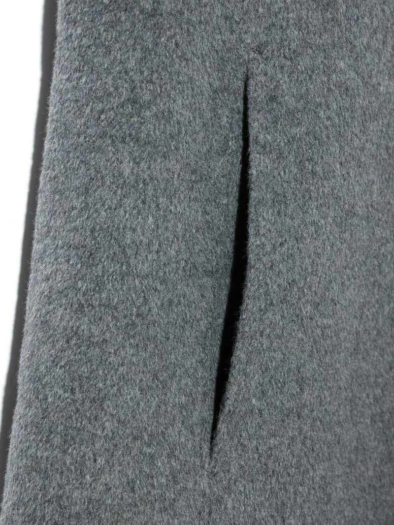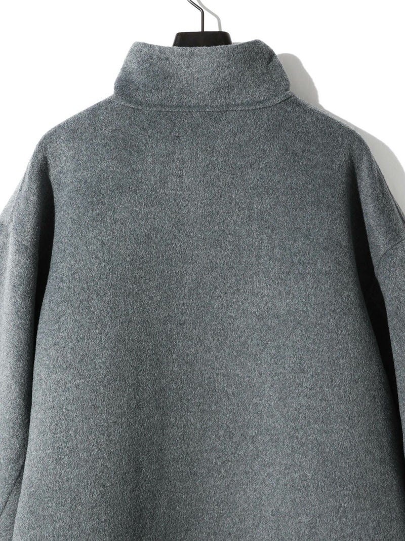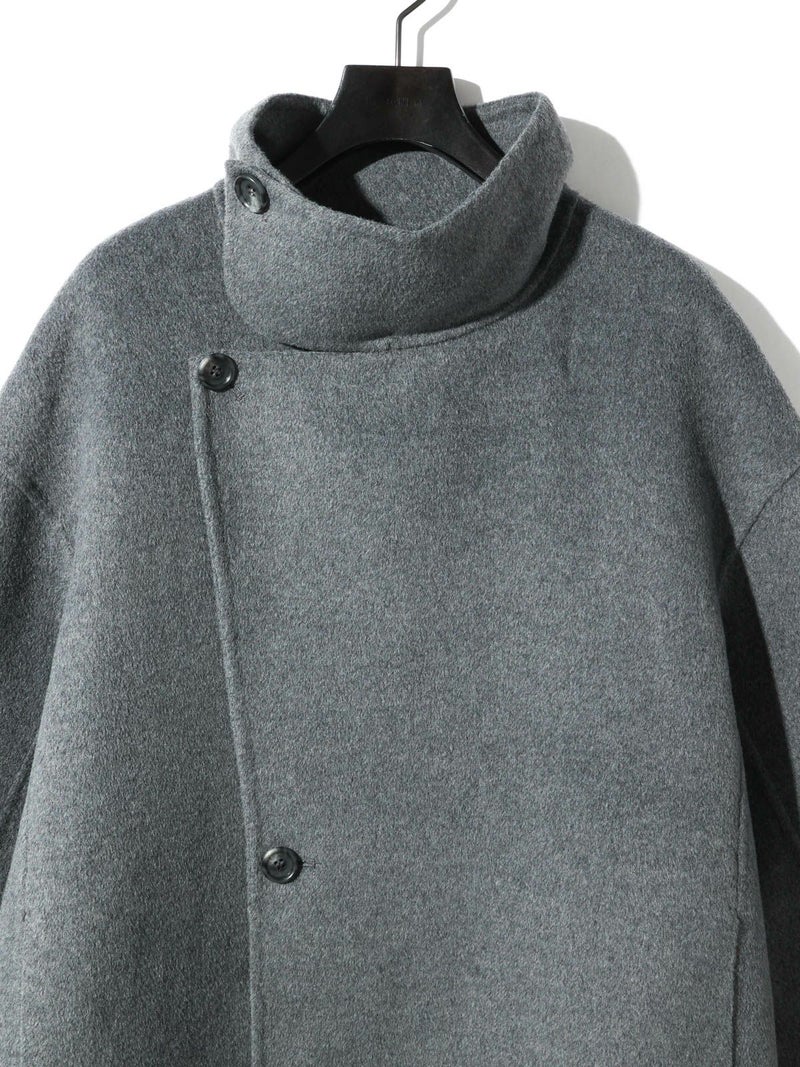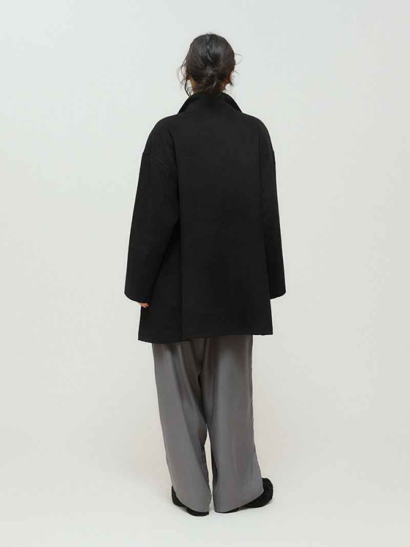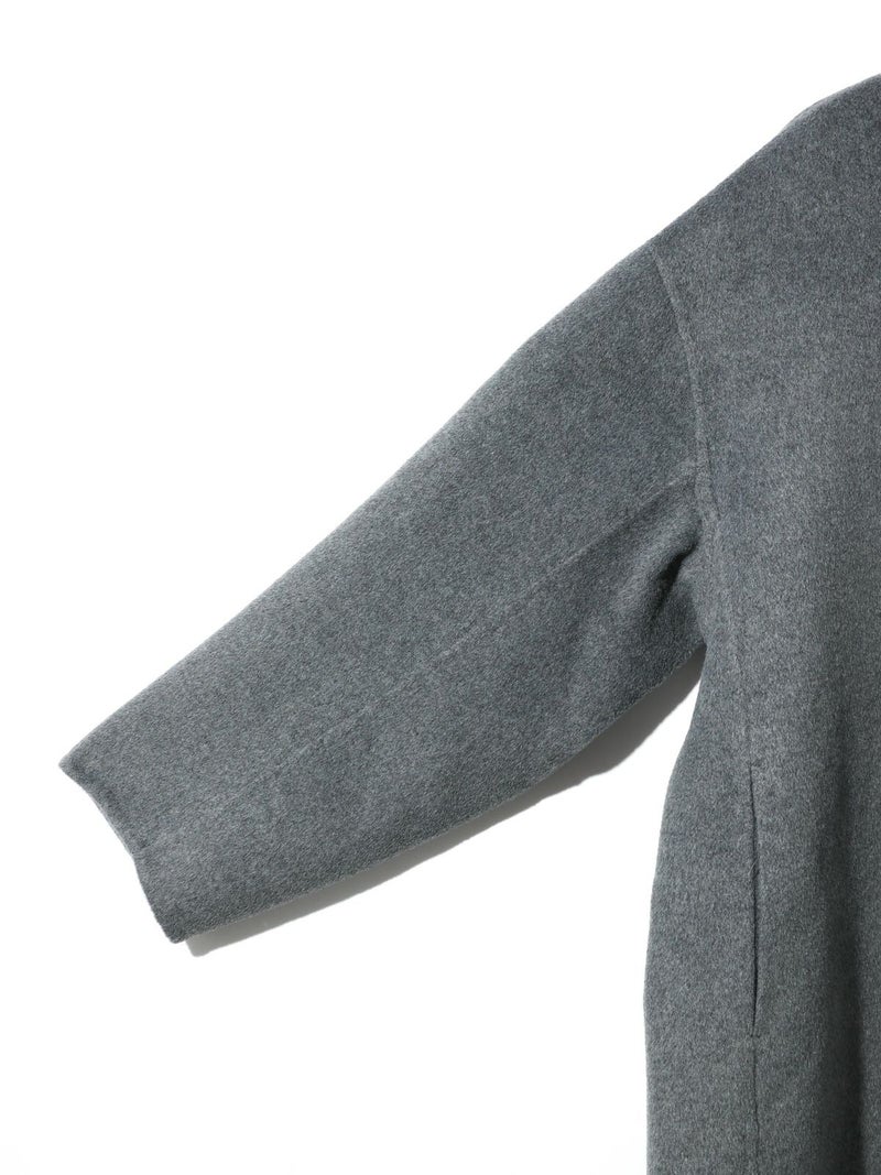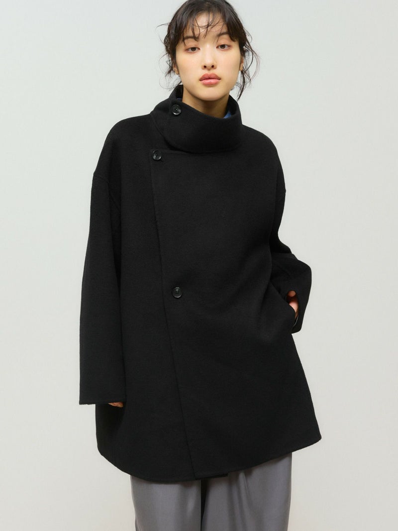 身長152cmでちょうどひざ上の丈感、身長160cmで太ももが半分ほど隠れる丈感です。ゆったりとしたシルエットながら、柔らかく軽やかなリバー素材の落ち感で、すっきりとした印象で着用できます。ボタンを外すと大きめのテーラードカラーに、ボタンを留めると幅広のスタンドネックになり、着こなしの印象を変えて楽しめます。上質な素材ならではの軽さとあたたかさがあり、ボトムスを選ばず幅広いコーディネートにマッチ。中にもしっかり着込めるため、ロングシーズンコーディネートで活躍します。