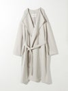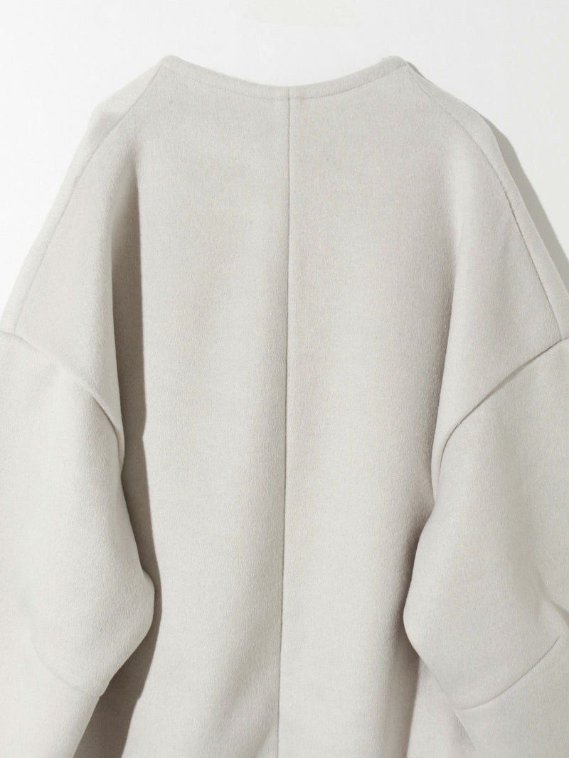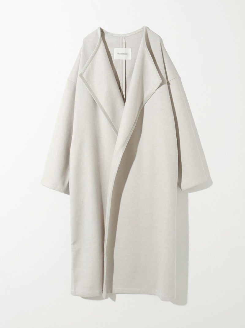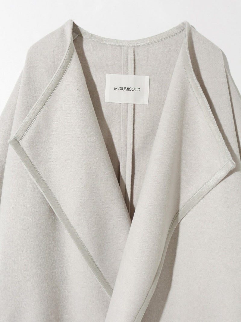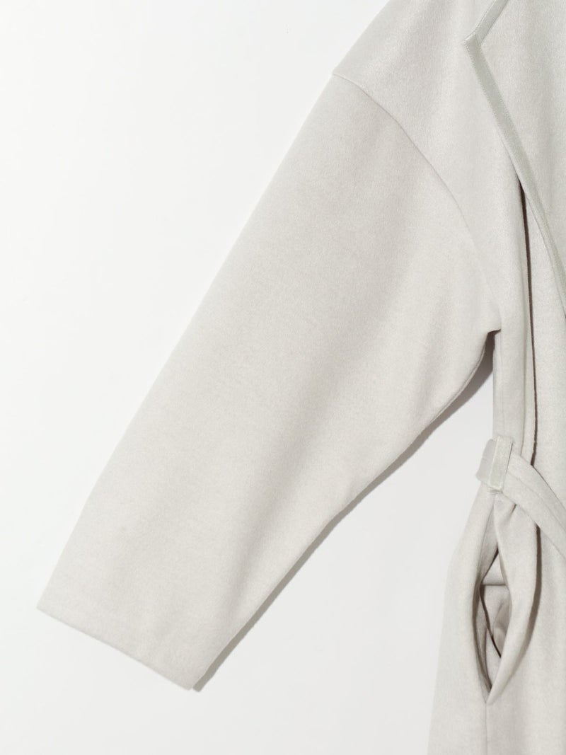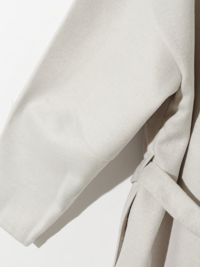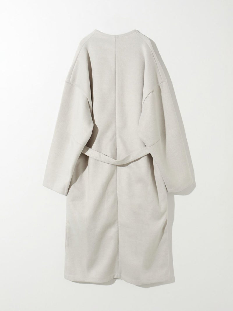 両面起毛のふんわりとしたエアリーなバービー生地を使用したベルト付ロングドレープコートです。柔らかい手触りが特徴で大人の魅力を演出した1枚。ガウンのようにサラッと羽織れ腰ベルトで縛ってコーディネートができる女性らしいデザインに仕上がっています。カジュアルにもフォーマルにも着こなせる幅広いドレープコートで着回しのきく4色のカラー展開。ボタン使いはしていないため、ベルトのみフロントを閉めるような仕様。足さばきが良いのもポイントです。