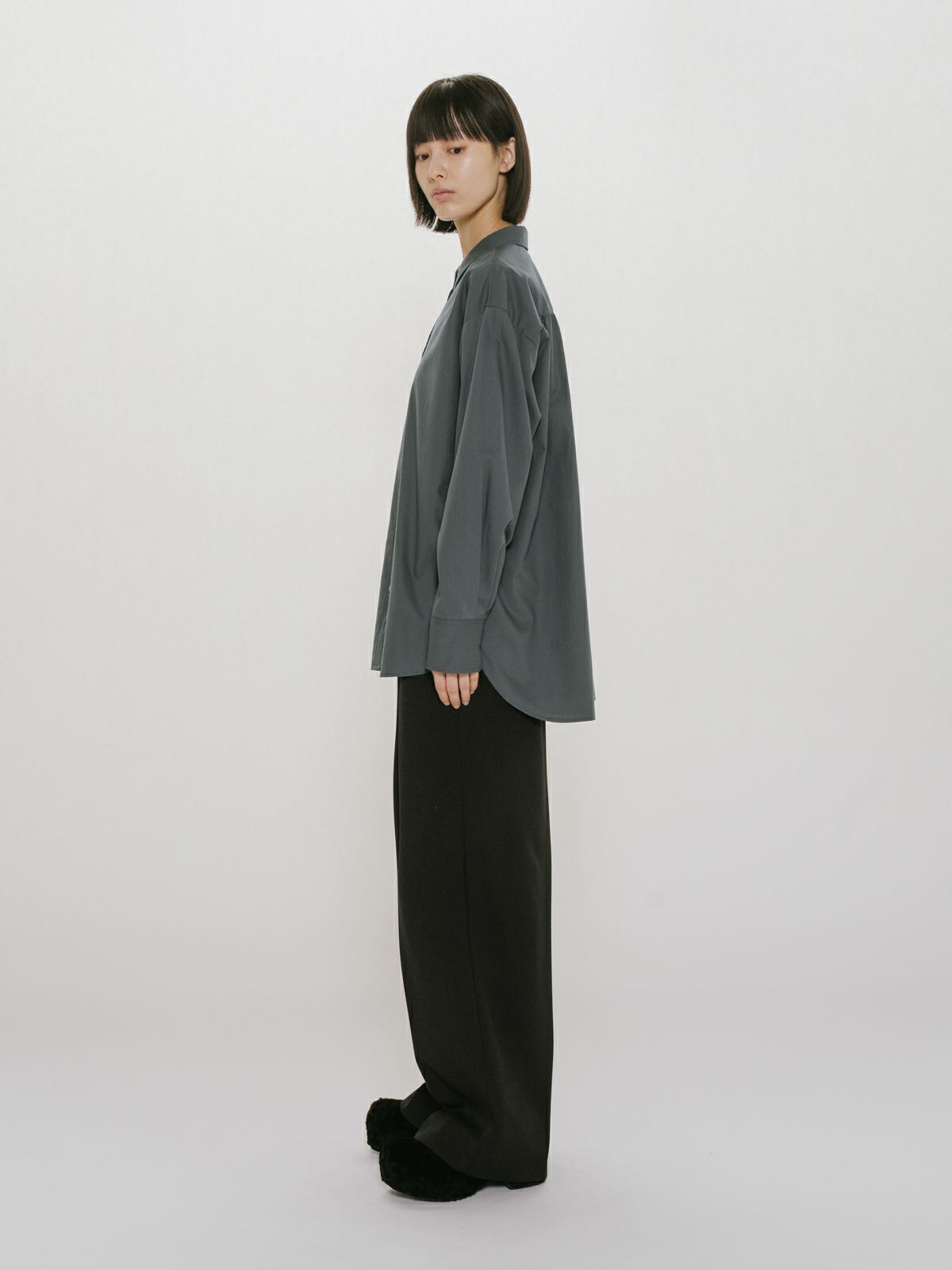 長いシーズンで愛用していただきやすい、ベーシックバックギャザーシャツです。ワイドな身幅でゆったりと着用していただきやすいデザインです。フロント面はベーシックなデザイン、バックはギャザーが入っていることでふんわりとしたシルエットを演出します。若干の前後差が付いています。落ち着きのある色合いなのでシックに決まる1枚です。