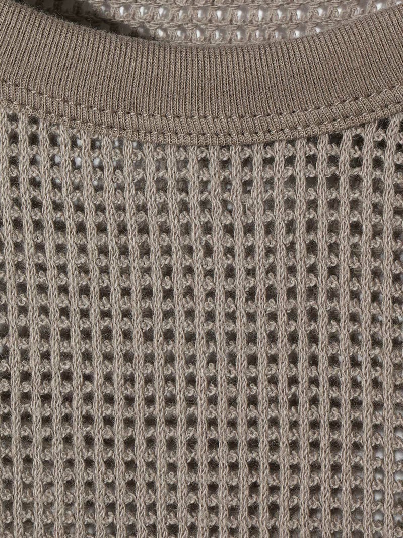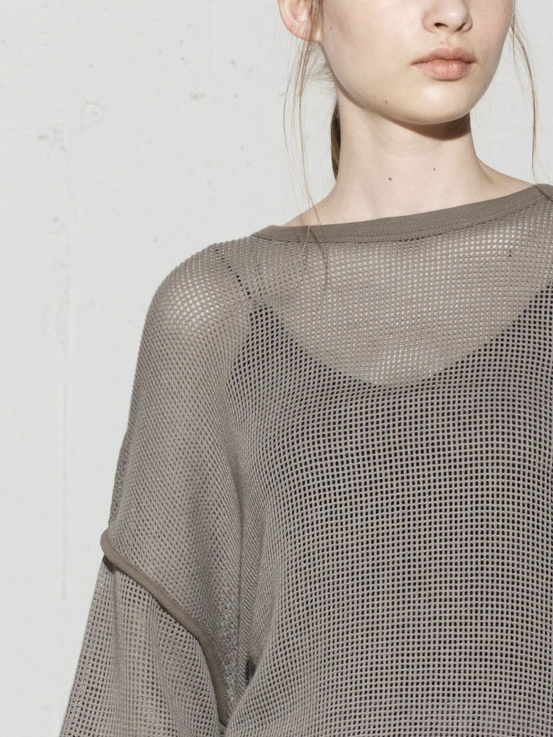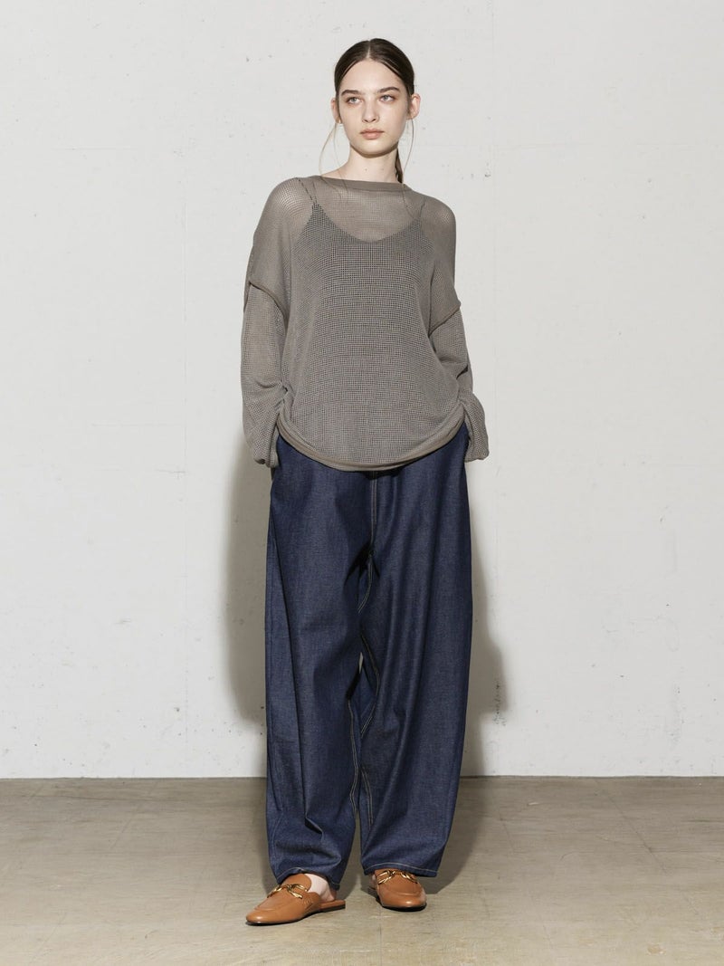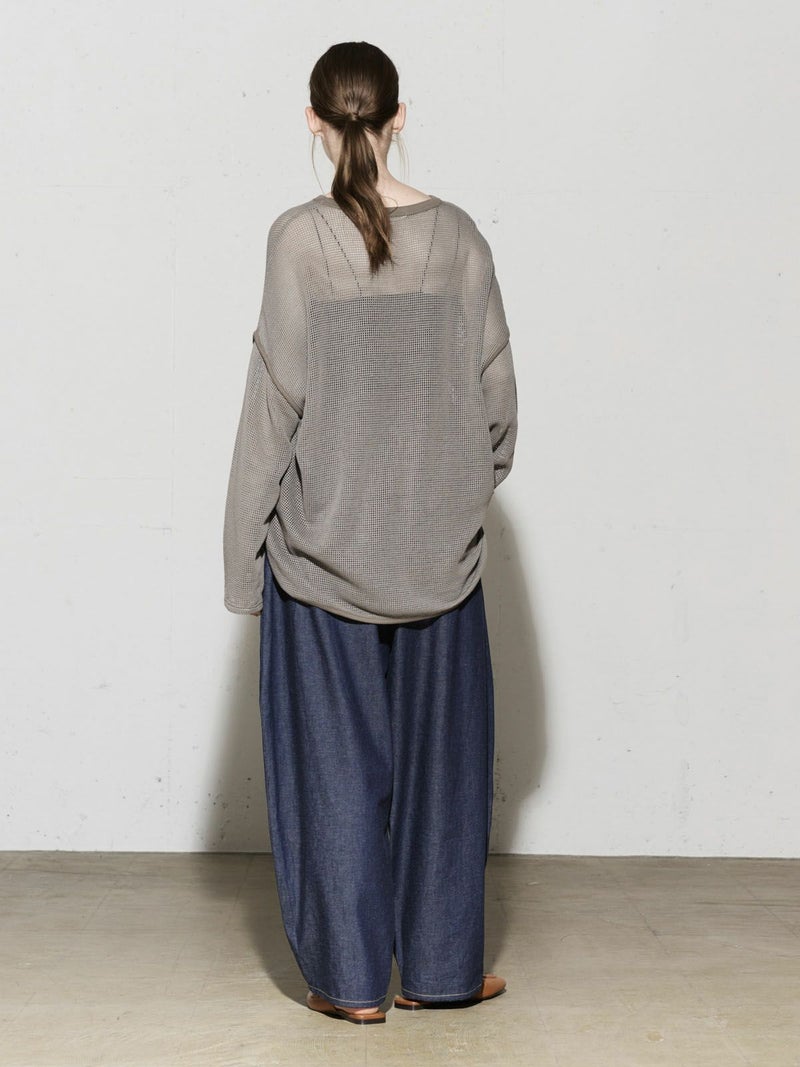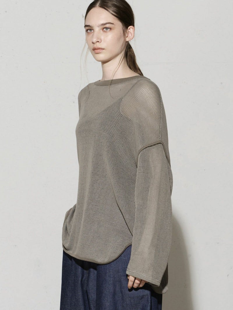 MIDIUMISOLID実績のあるデザインでもあるラウンドメッシュプルオーバーです。バスケットメッシュのサーマルっぽい印象を表現しました。カジュアルにもモードにも着こなせるアイテムです。裾や袖のつなぎ部分などパイピング仕立てにしたデザインもポイントです。ザックリとしてラフに着こなせます。透け感が女性らしい雰囲気もあって魅力的な1枚です。