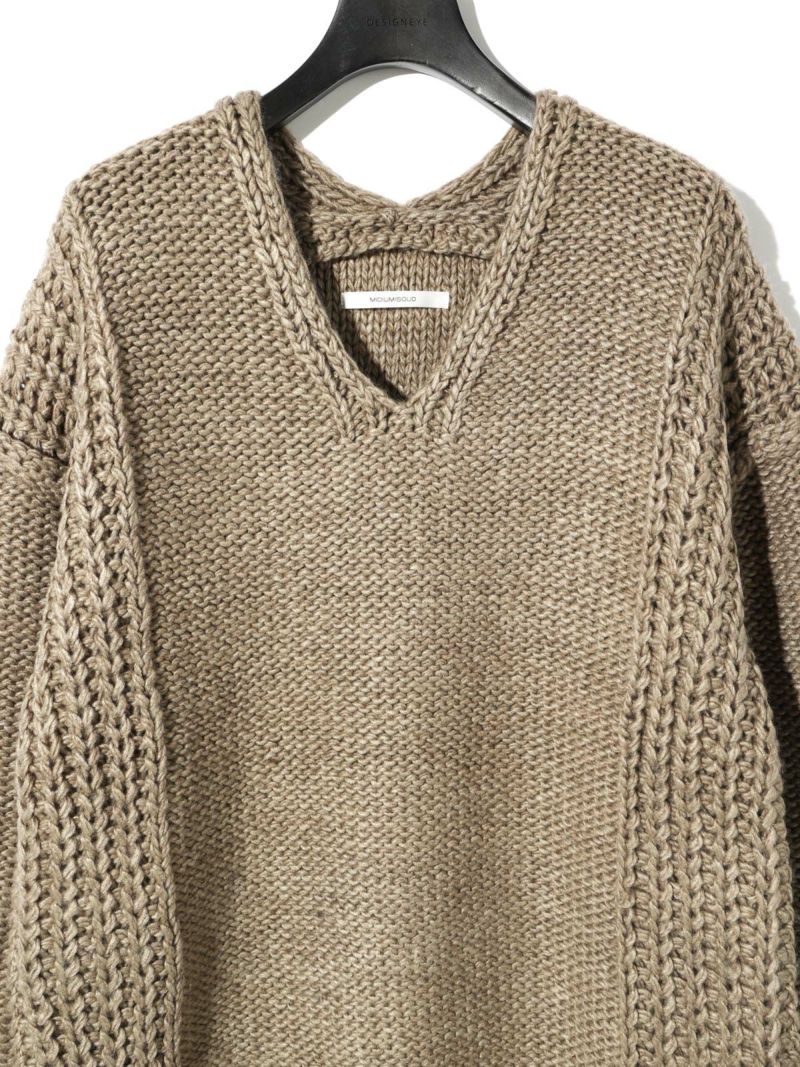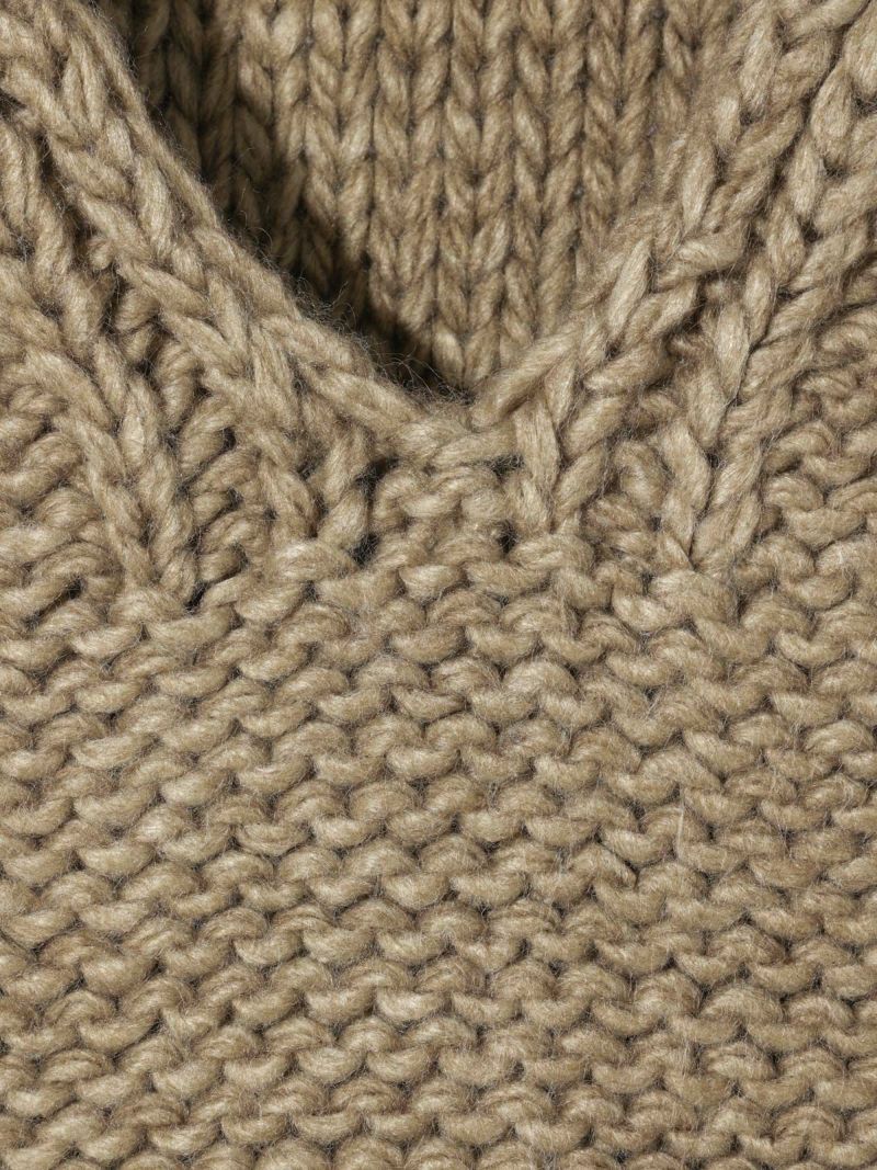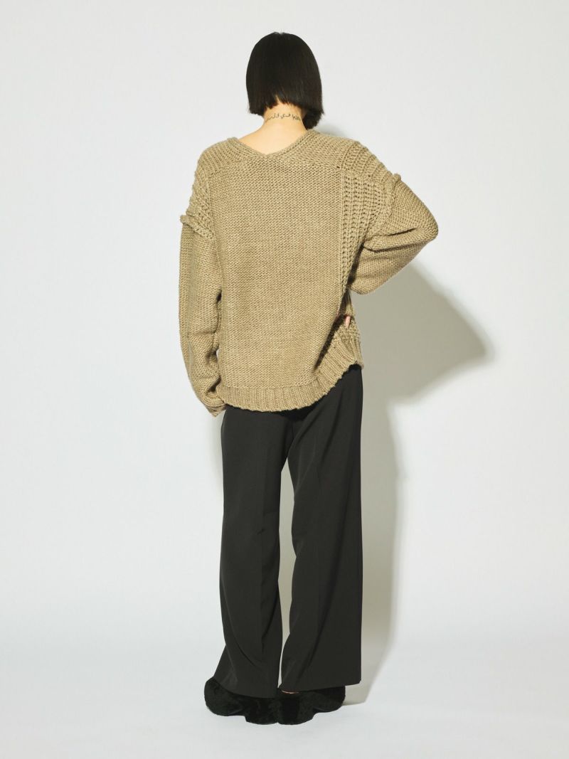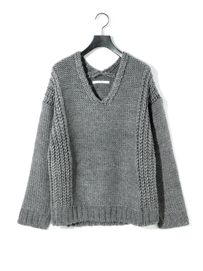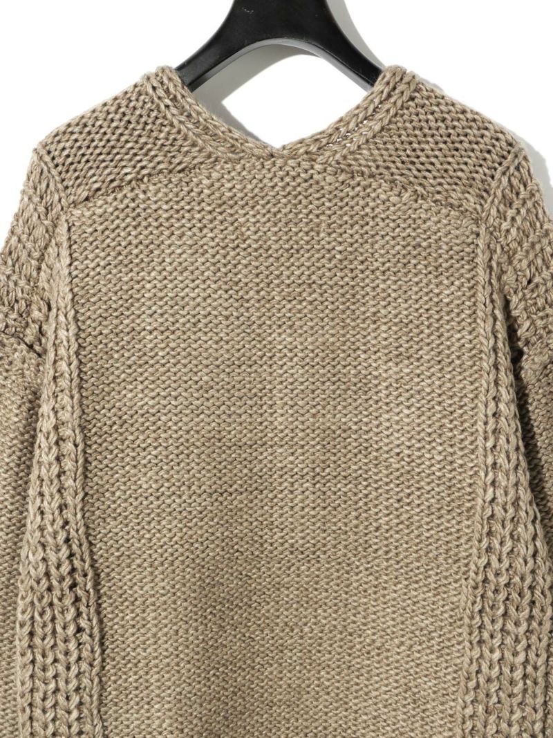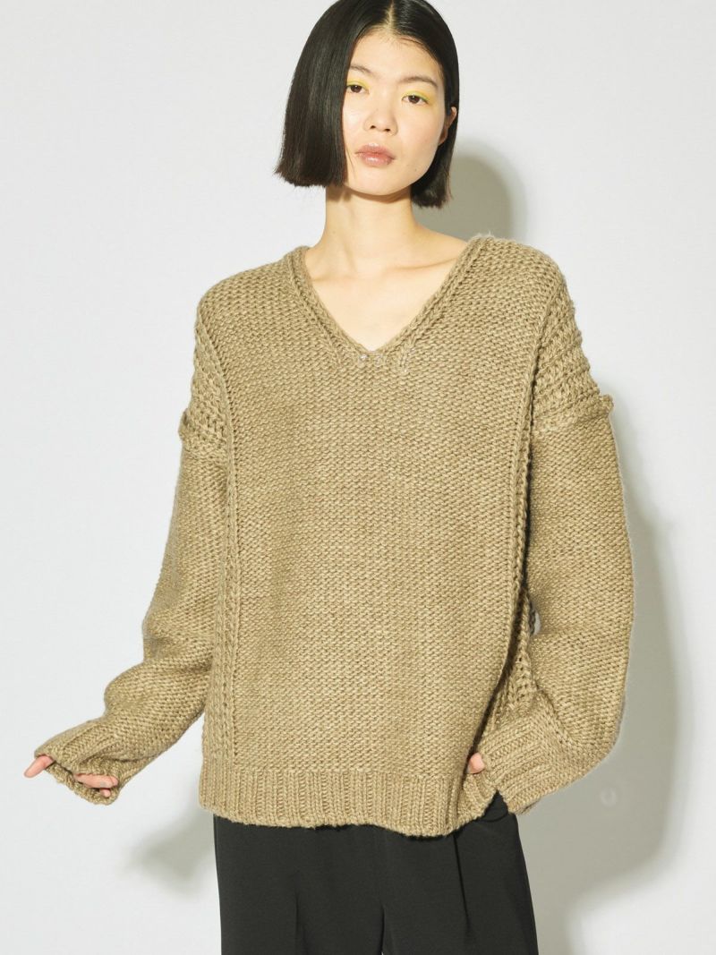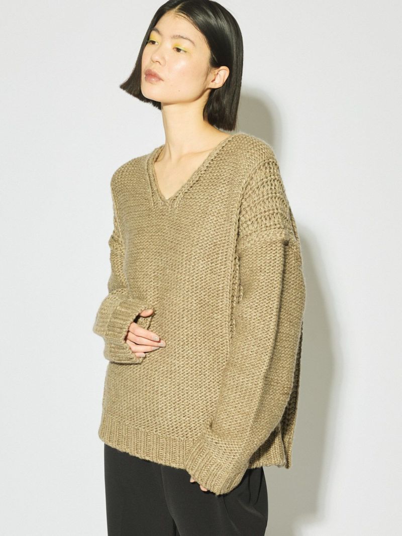 ネックの空き方に特徴のあるローゲージVネックプルオーバーです。アクセサリーをつけても一番きれいにみえるネックライン。ゆったりとしたシルエットで着用しやすく、編地を変えることで過度なデザインがなくても一枚で決まるシンプルなニットです。ベーシックカラーで揃えておりザックリと着用できるコーディネートのしやすい1枚です。