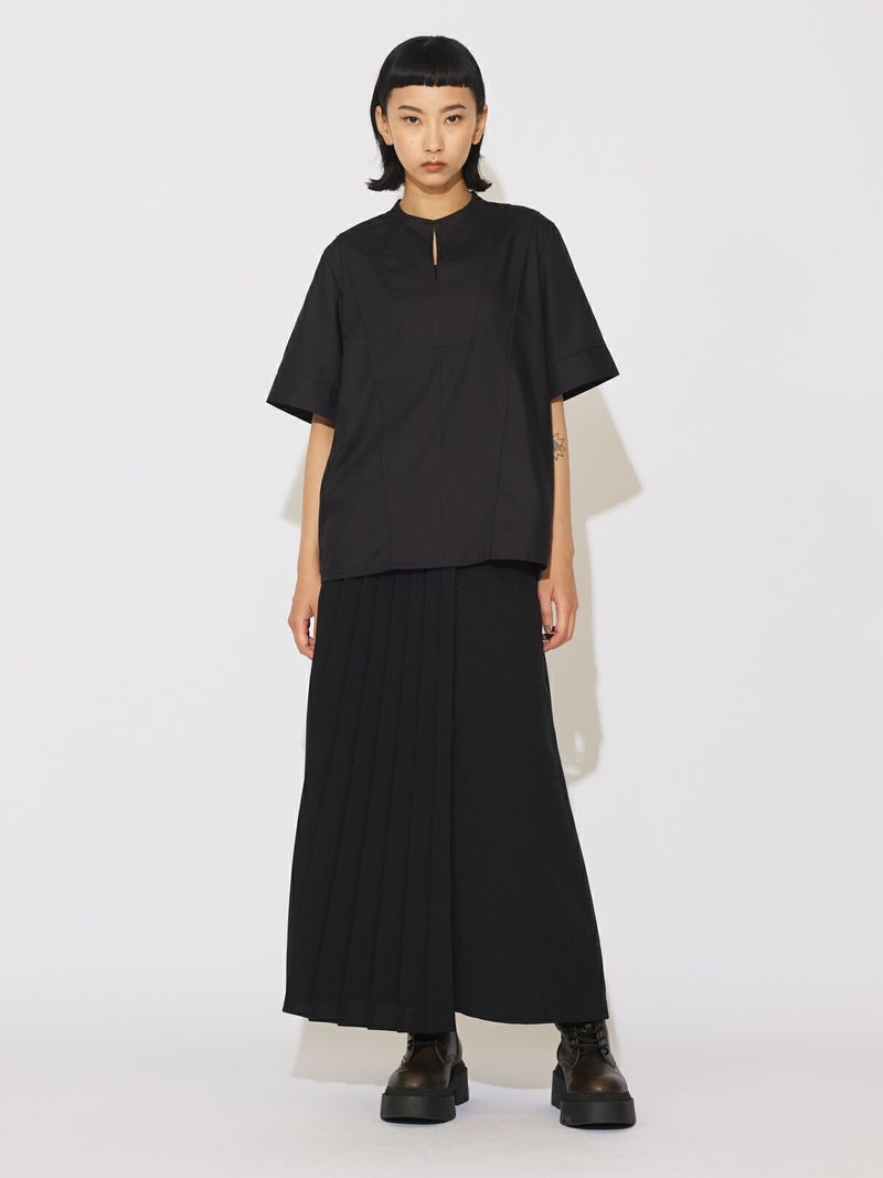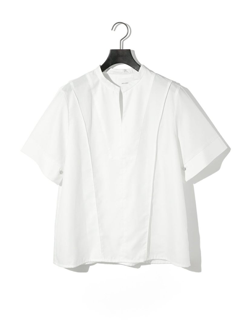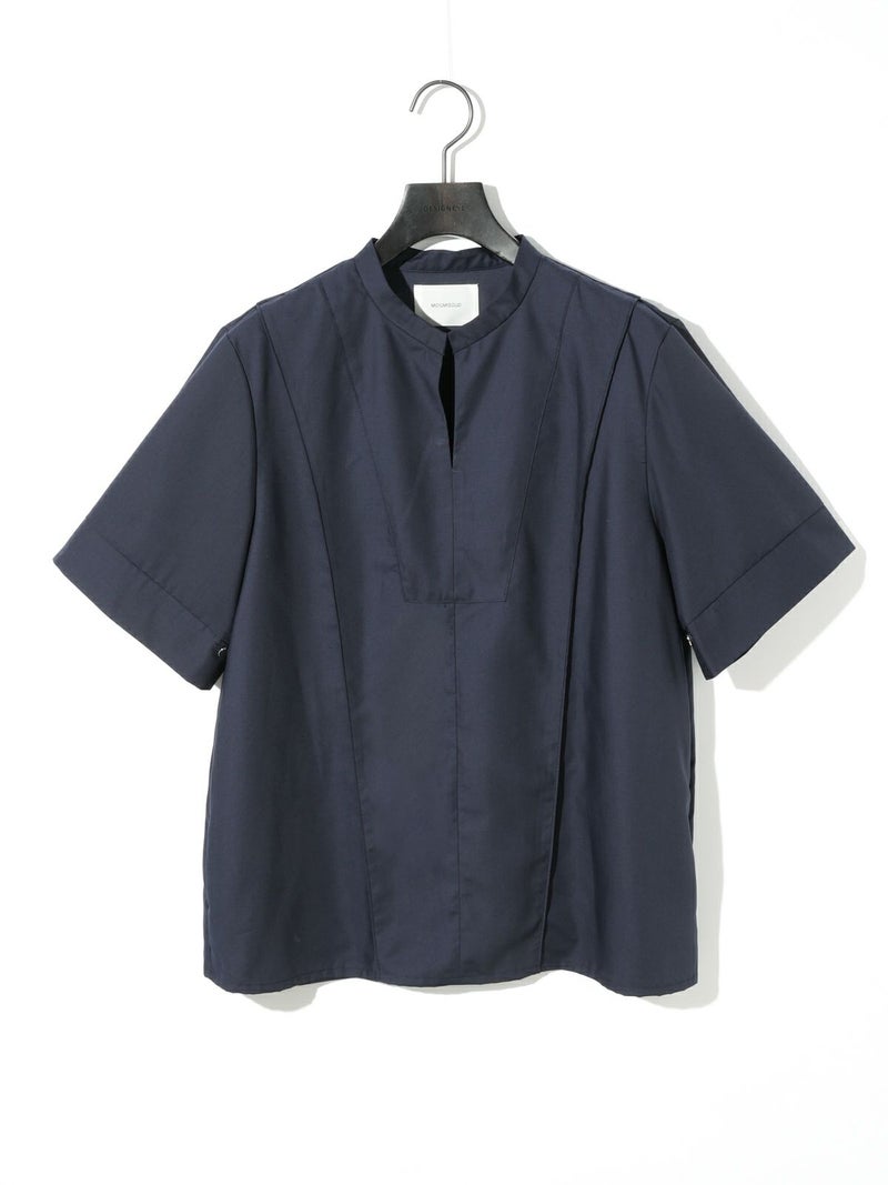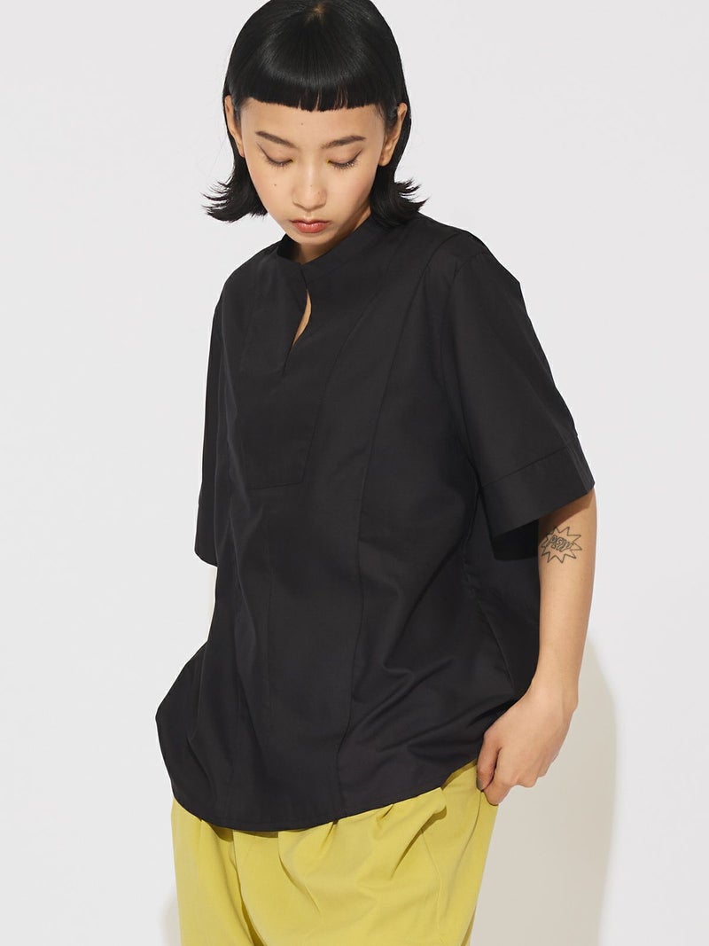 シンプルに1枚でコーディネートができる2WAYネックブラウスです。光沢のある合繊できちんと感もありながらカジュアルな着こなしを表現できる1枚。合わせるボトムによっても雰囲気を変えオシャレを楽しんでもらえるシャツです。スタンドカラーにホックが付いているのがポイントで外して着こなすとスキッパーになり、軽さを出したデザインが特徴的。前後で縫い目に切り替えを施しているので、シンプルな中にメリハリのついたデザインに仕上げています。着回しのきく3色のカラー展開はベーシックに着こなせる1枚となっています。
