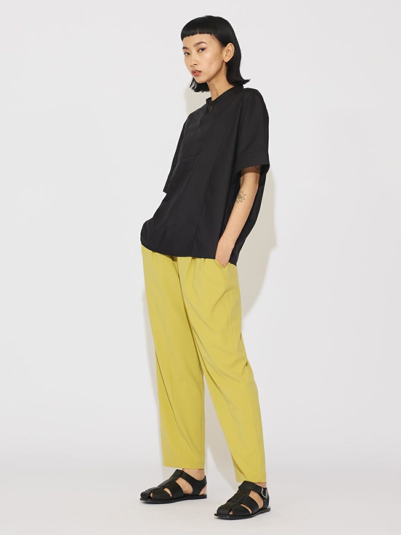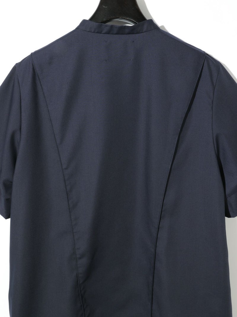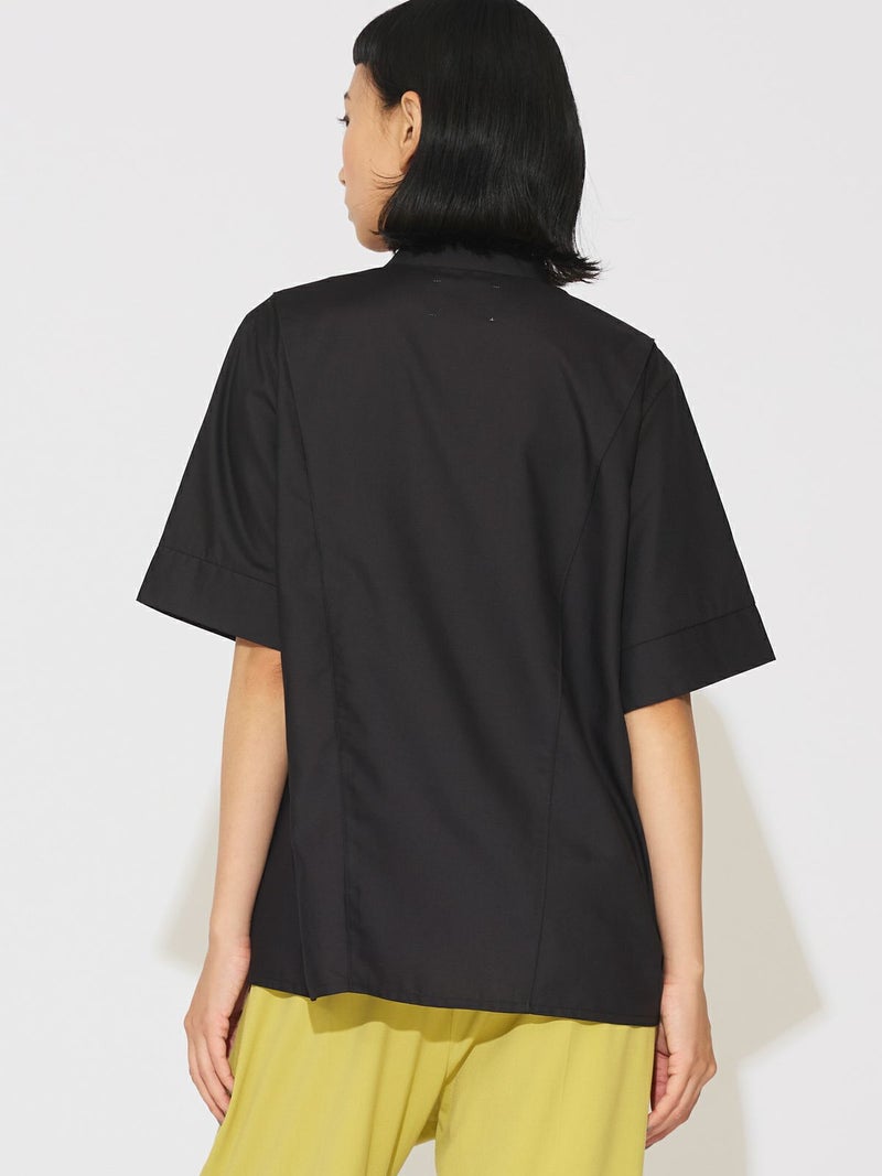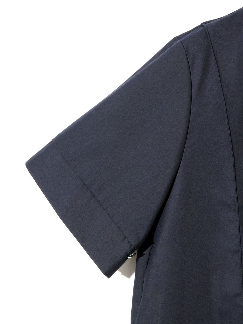 シンプルに1枚でコーディネートができる2WAYネックブラウスです。光沢のある合繊できちんと感もありながらカジュアルな着こなしを表現できる1枚。合わせるボトムによっても雰囲気を変えオシャレを楽しんでもらえるシャツです。スタンドカラーにホックが付いているのがポイントで外して着こなすとスキッパーになり、軽さを出したデザインが特徴的。前後で縫い目に切り替えを施しているので、シンプルな中にメリハリのついたデザインに仕上げています。着回しのきく3色のカラー展開はベーシックに着こなせる1枚となっています。