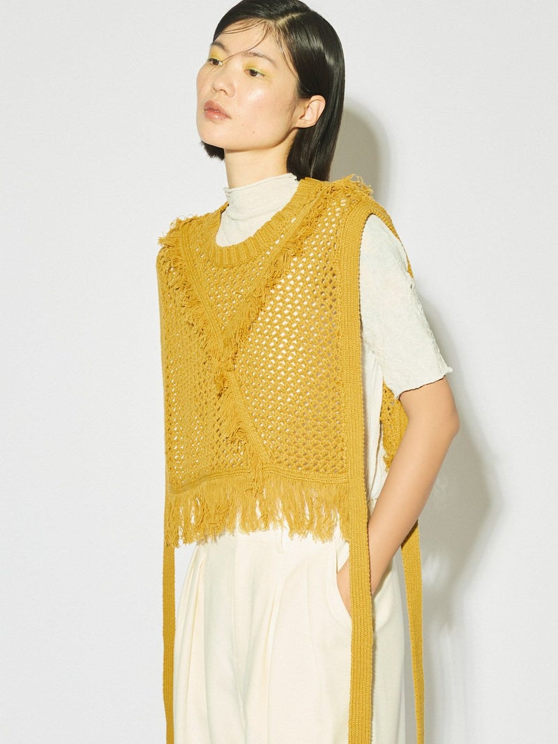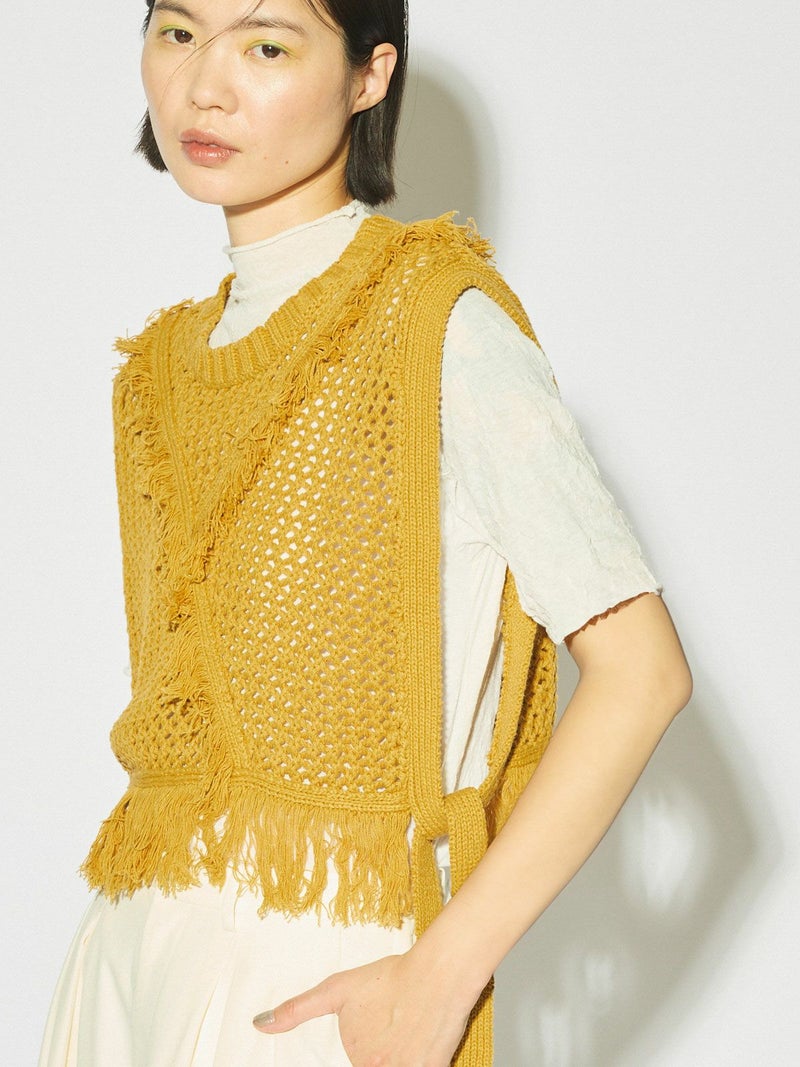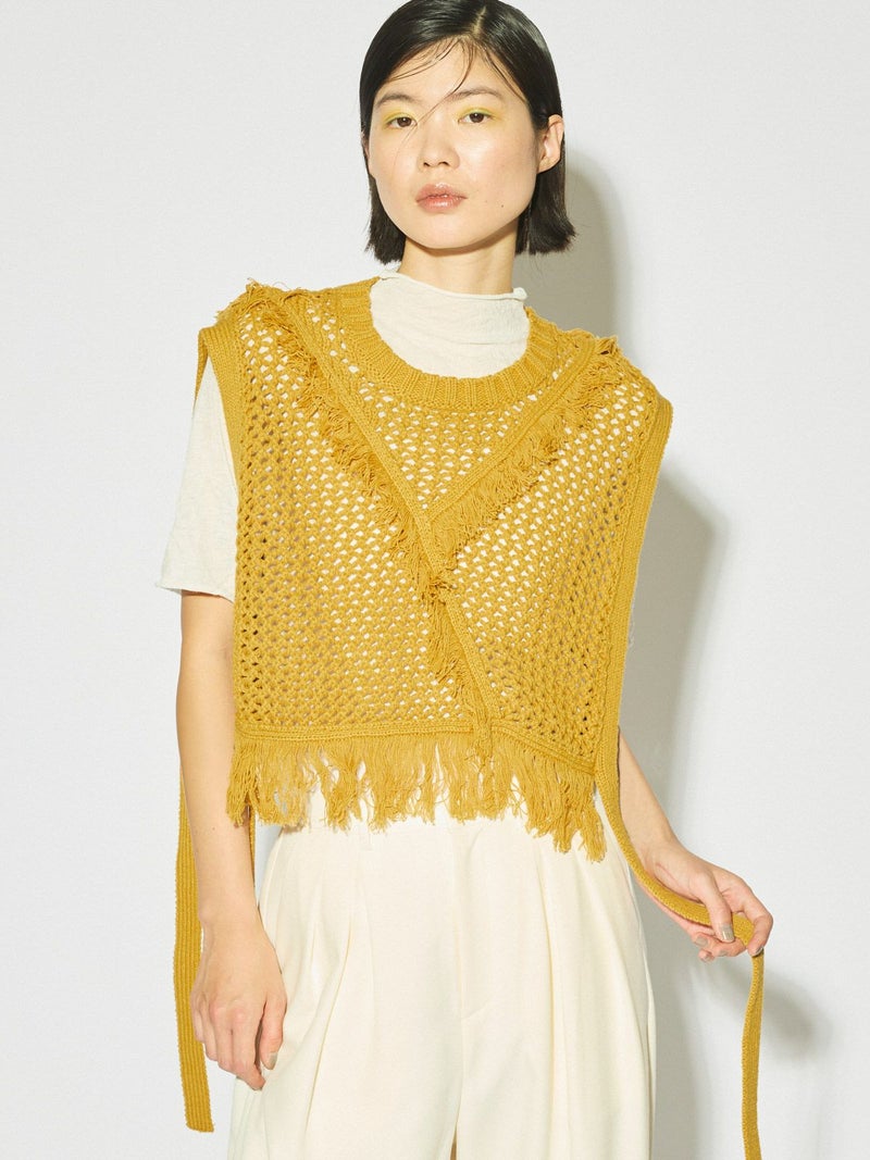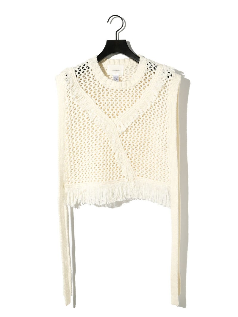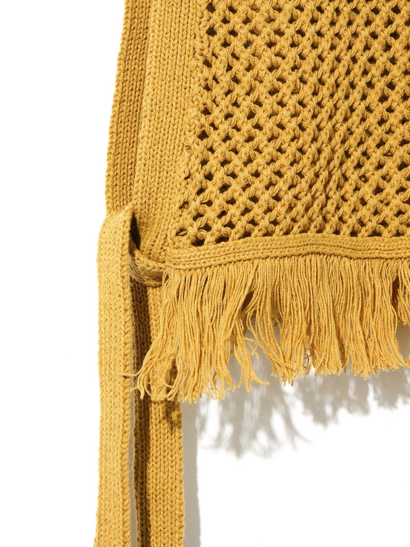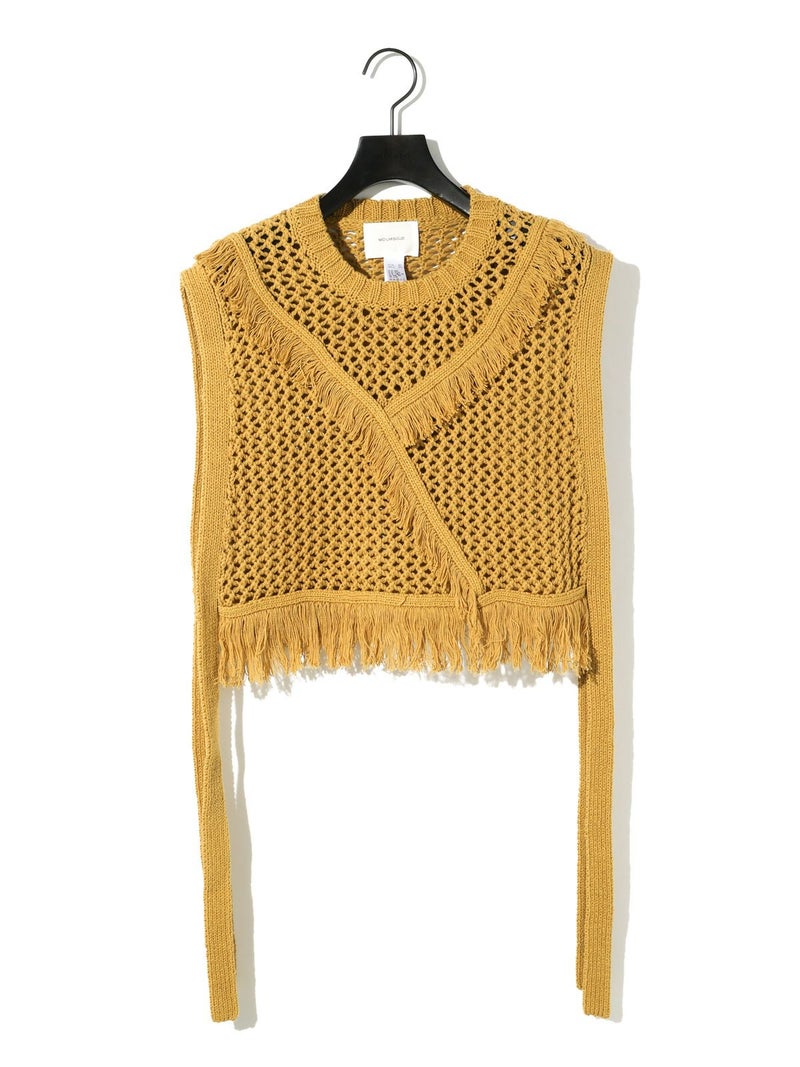 メッシュニットにフリンジを取り入れたデザインでモード風な雰囲気が魅力のフリンジメッシュプルオーバーです。サイドリボンを着こなしに合わせてアレンジしていただけるデザインです。カットソーやキャミソールと合わせた着こなしがお勧め。樹脂加工でだれないように且つ軽さが特徴。季節の進み具合や気温の変化によって重ね着を楽しんでいただける1枚です。同シリーズ1-122133/フリンジメッシュプルオーバーも展開。