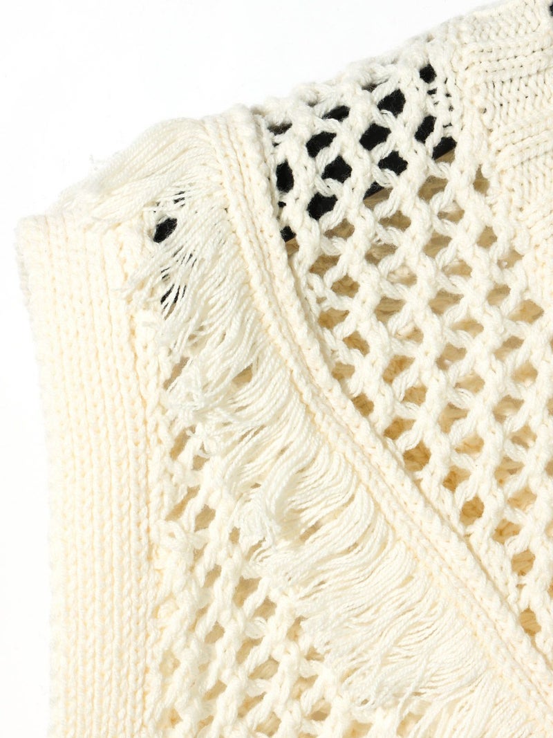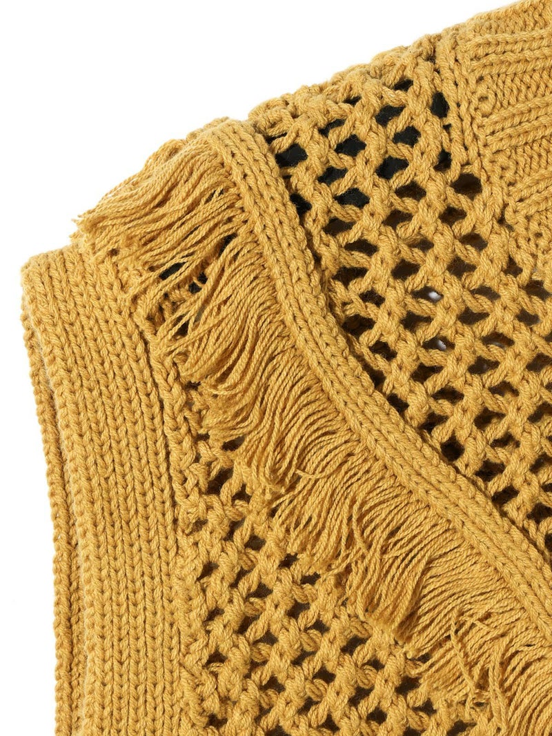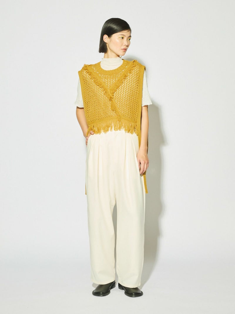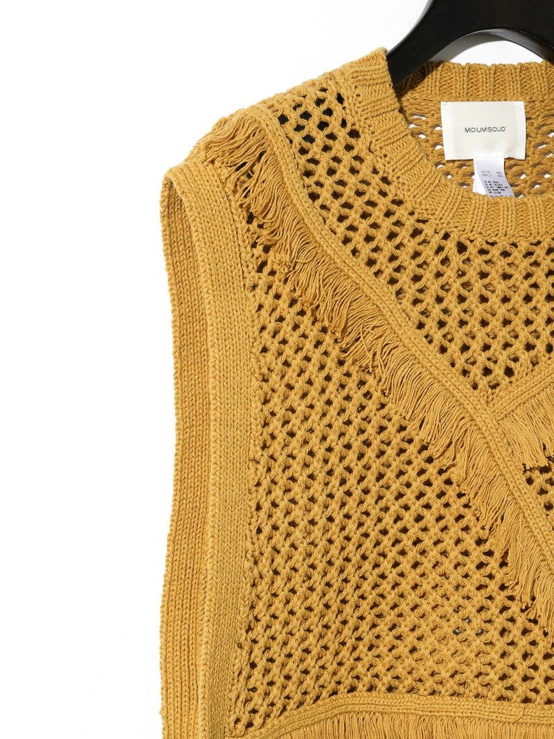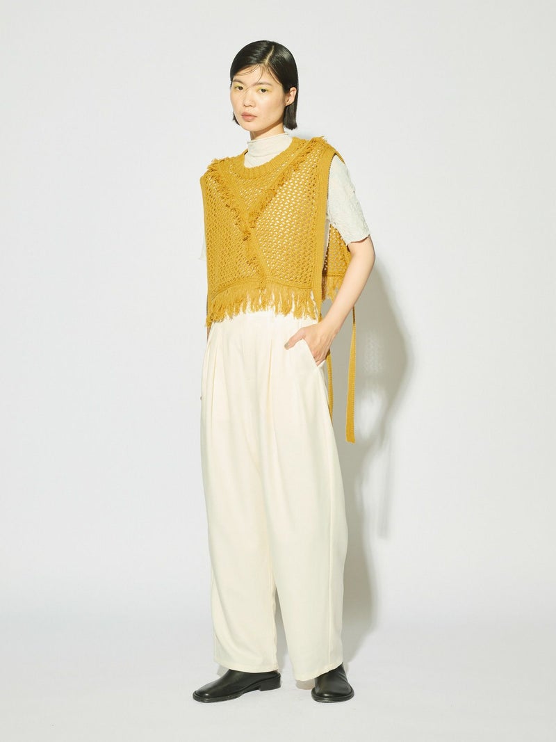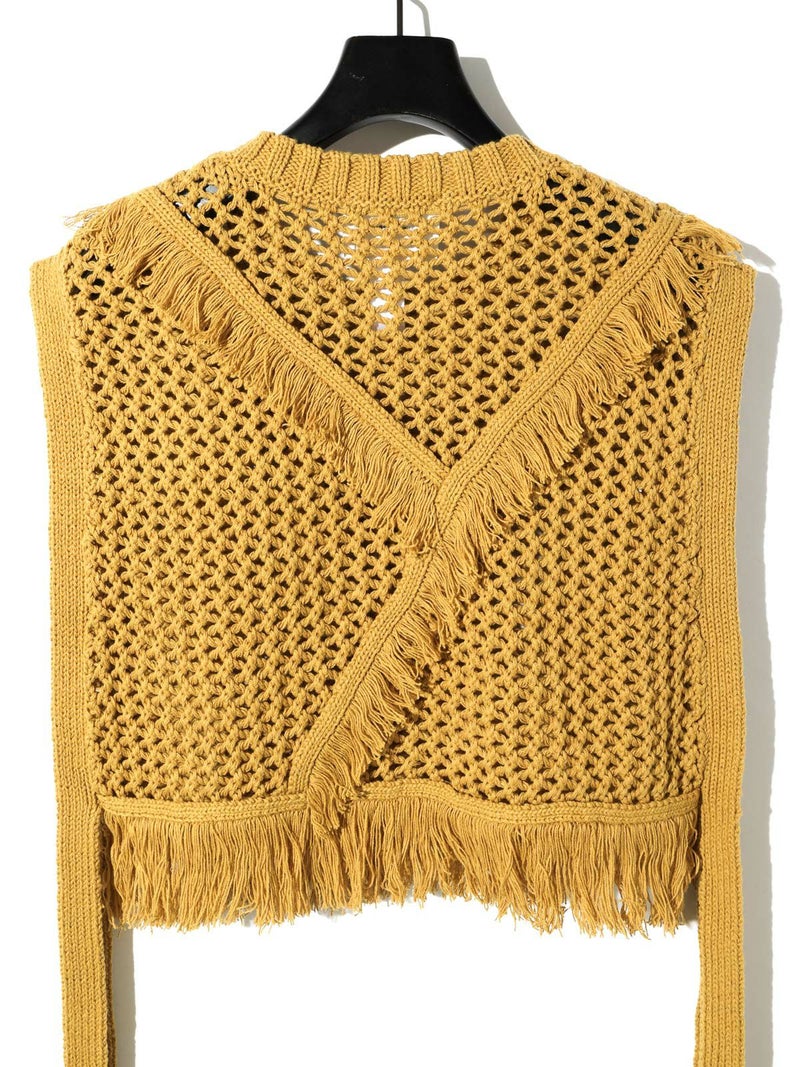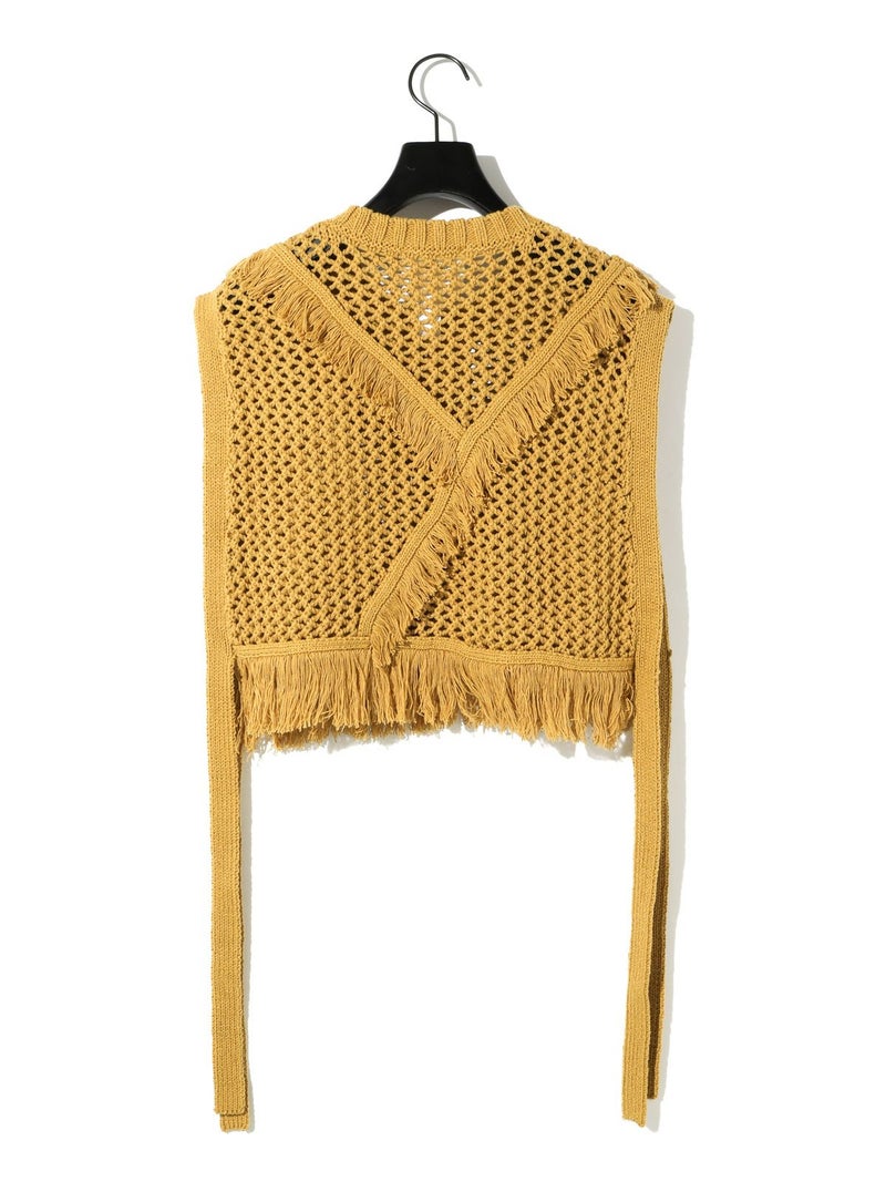 メッシュニットにフリンジを取り入れたデザインでモード風な雰囲気が魅力のフリンジメッシュプルオーバーです。サイドリボンを着こなしに合わせてアレンジしていただけるデザインです。カットソーやキャミソールと合わせた着こなしがお勧め。樹脂加工でだれないように且つ軽さが特徴。季節の進み具合や気温の変化によって重ね着を楽しんでいただける1枚です。同シリーズ1-122133/フリンジメッシュプルオーバーも展開。