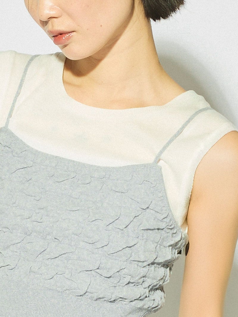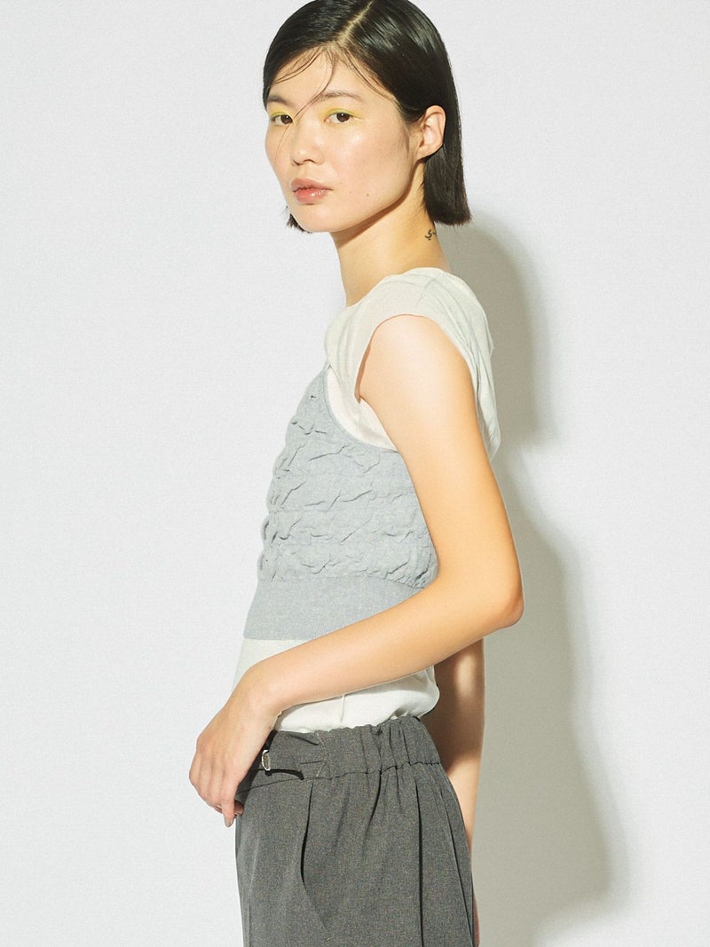 膨れジャガードの表情感のあるニットアイテム、ジャカードビスチェです。胸のジャカードが特徴的でベーシックなアイテムをより印象的に重ね着スタイルを演出します。体にフィットしたタイトなシルエット仕上げ。長く愛用していただけるアイテムです。同シリーズ1-122136/パフスリーブジャカードプルオーバーも展開。