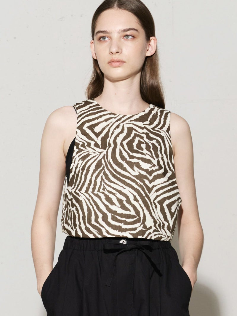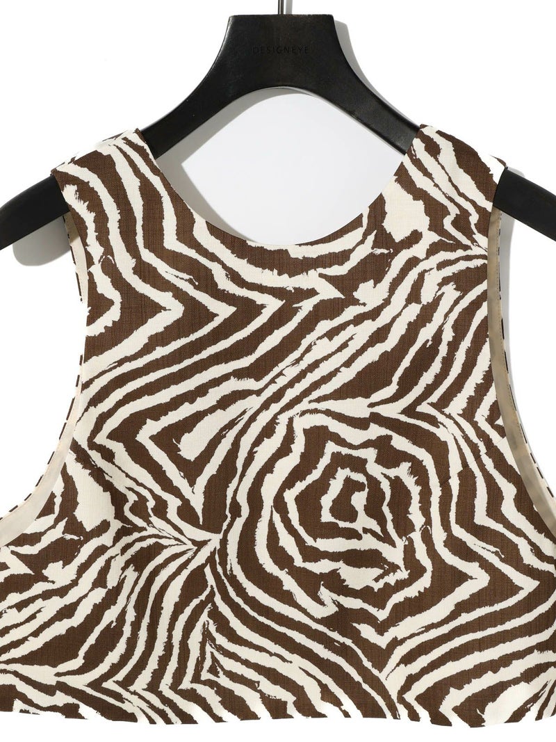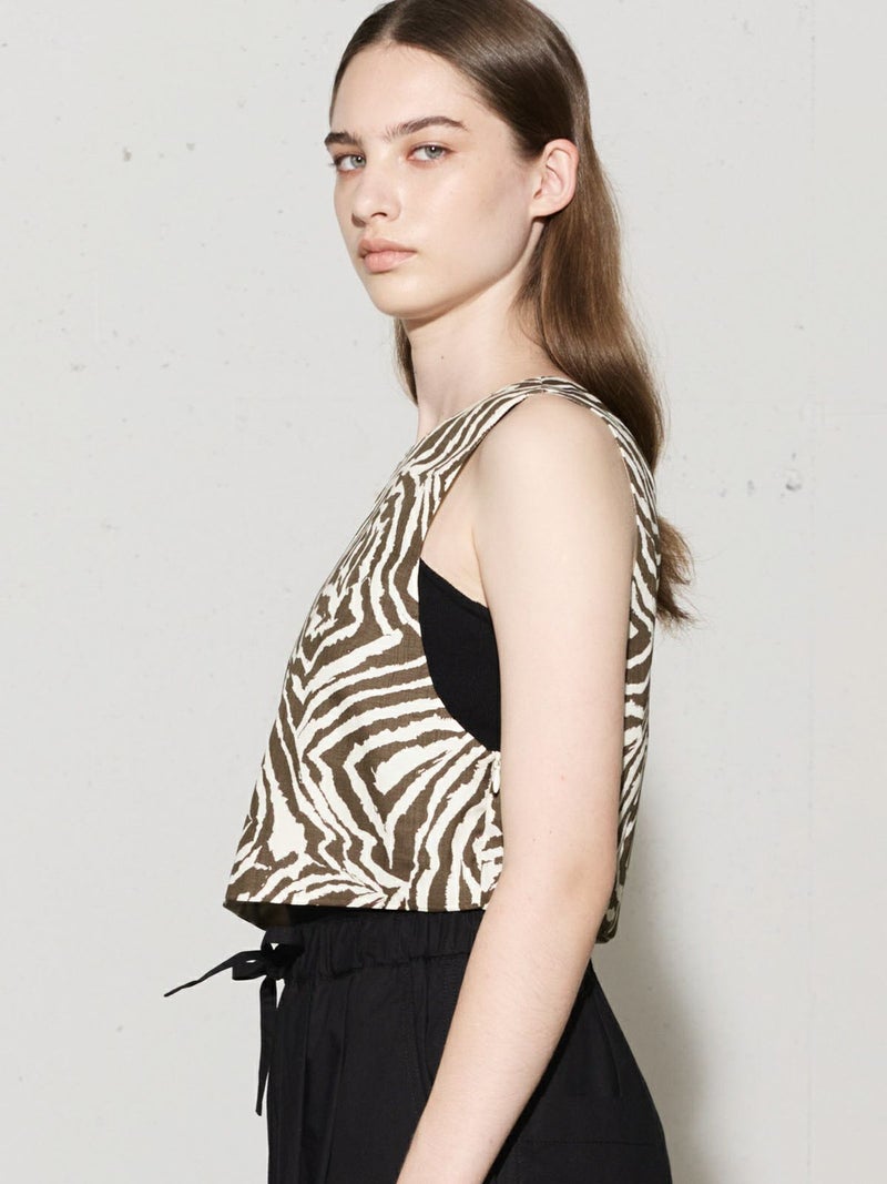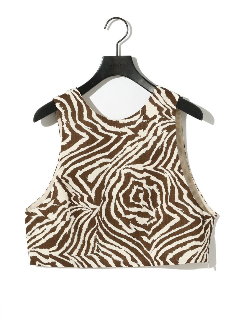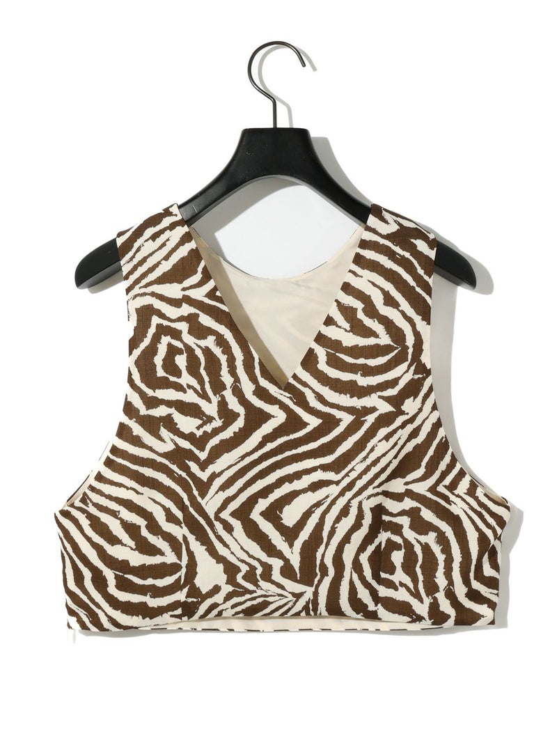 麻調ゼブラプリントのビスチェです。すっきりとしたショート丈で袖通しのよいアームの広いデザインが特徴。レイヤードもお勧めですがノースリーブでの着こなしも素敵です。背中はVに開いたワイルドなデザインとゼブラの柄が印象的な1枚。大人の魅力を表現したビスチェです。