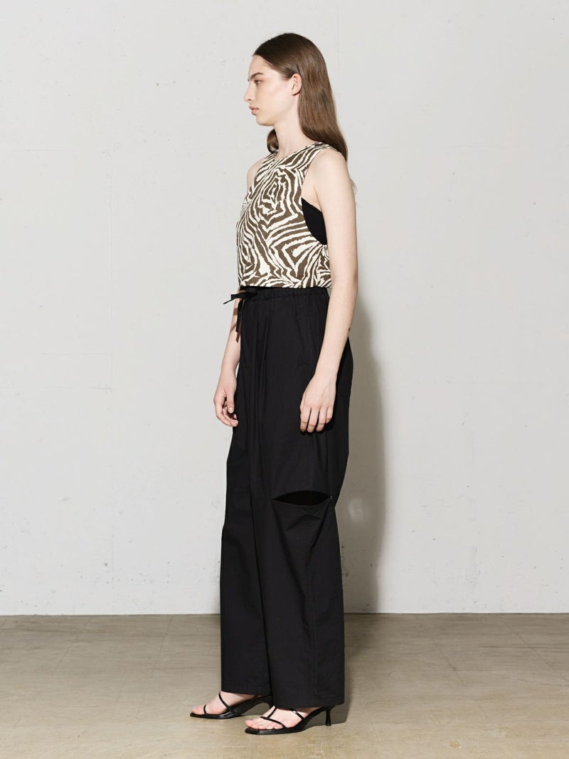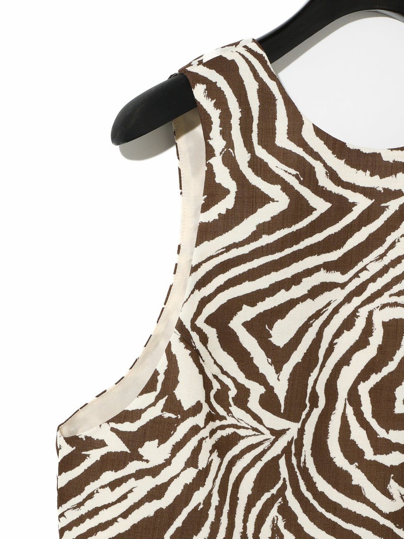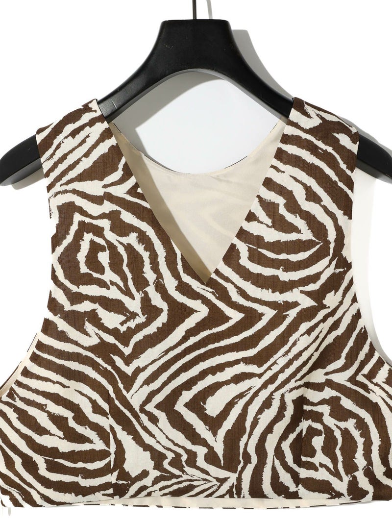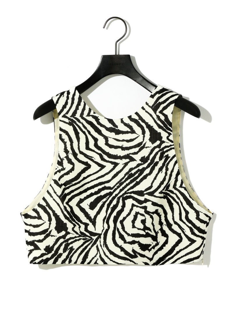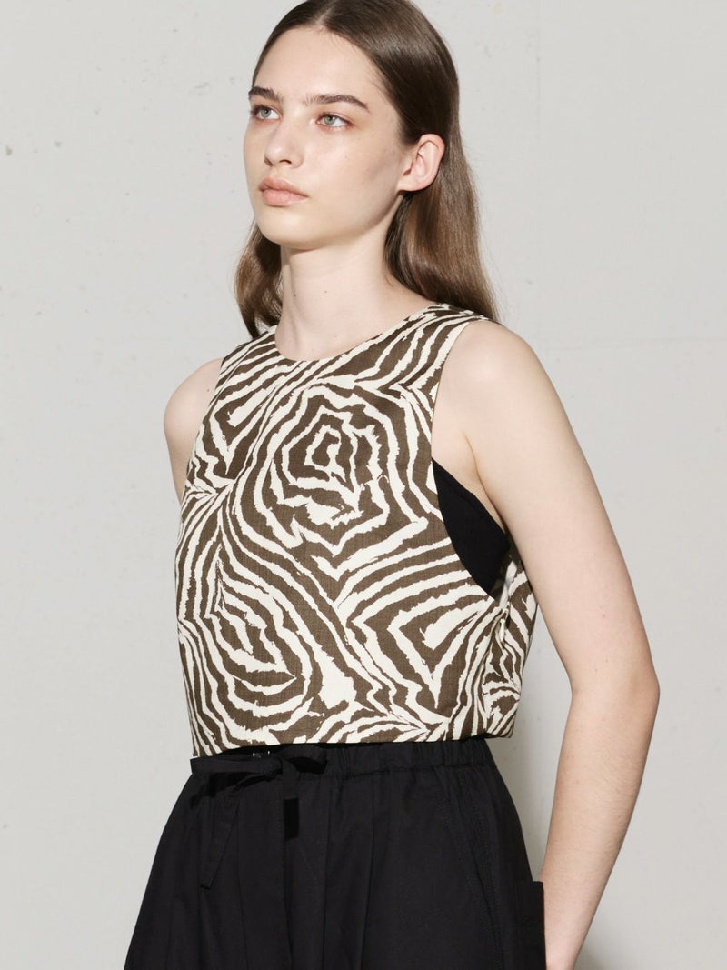 麻調ゼブラプリントのビスチェです。すっきりとしたショート丈で袖通しのよいアームの広いデザインが特徴。レイヤードもお勧めですがノースリーブでの着こなしも素敵です。背中はVに開いたワイルドなデザインとゼブラの柄が印象的な1枚。大人の魅力を表現したビスチェです。