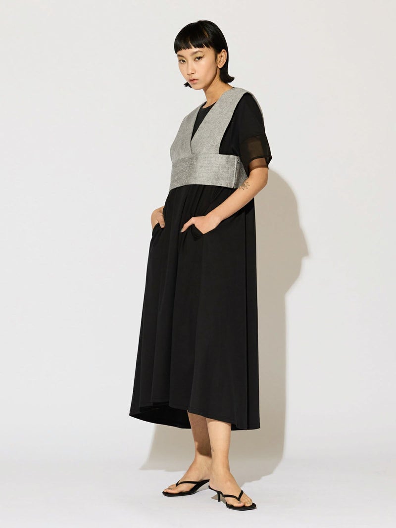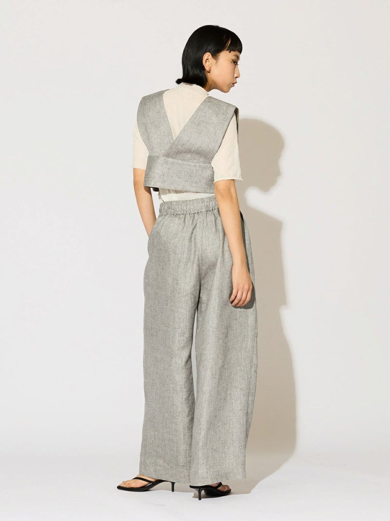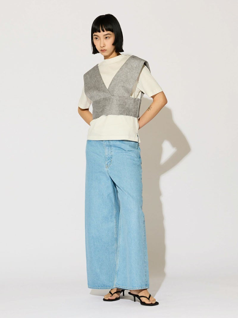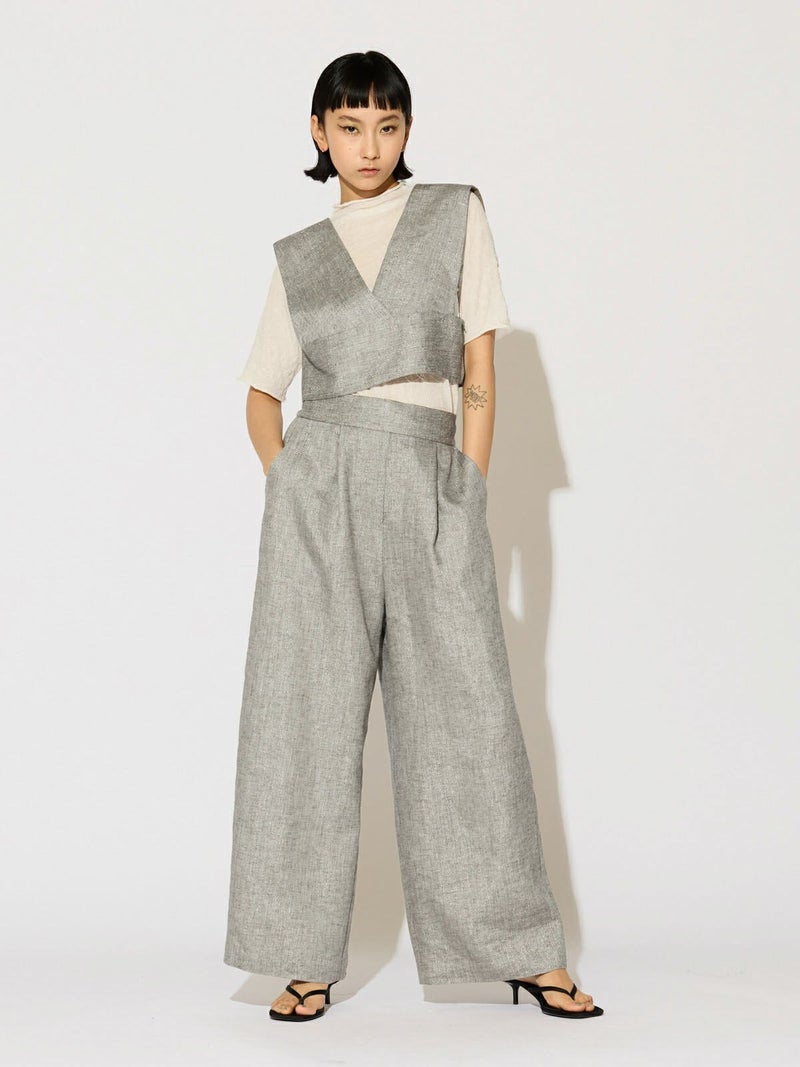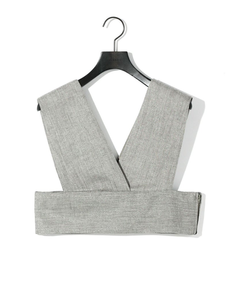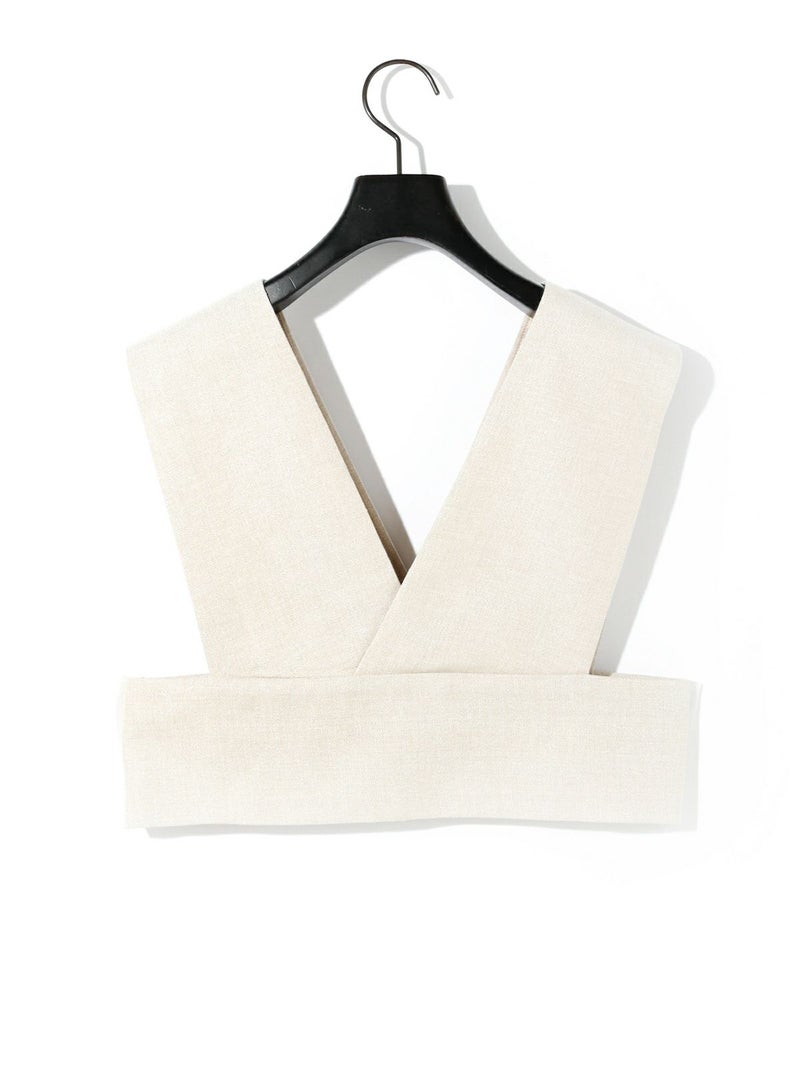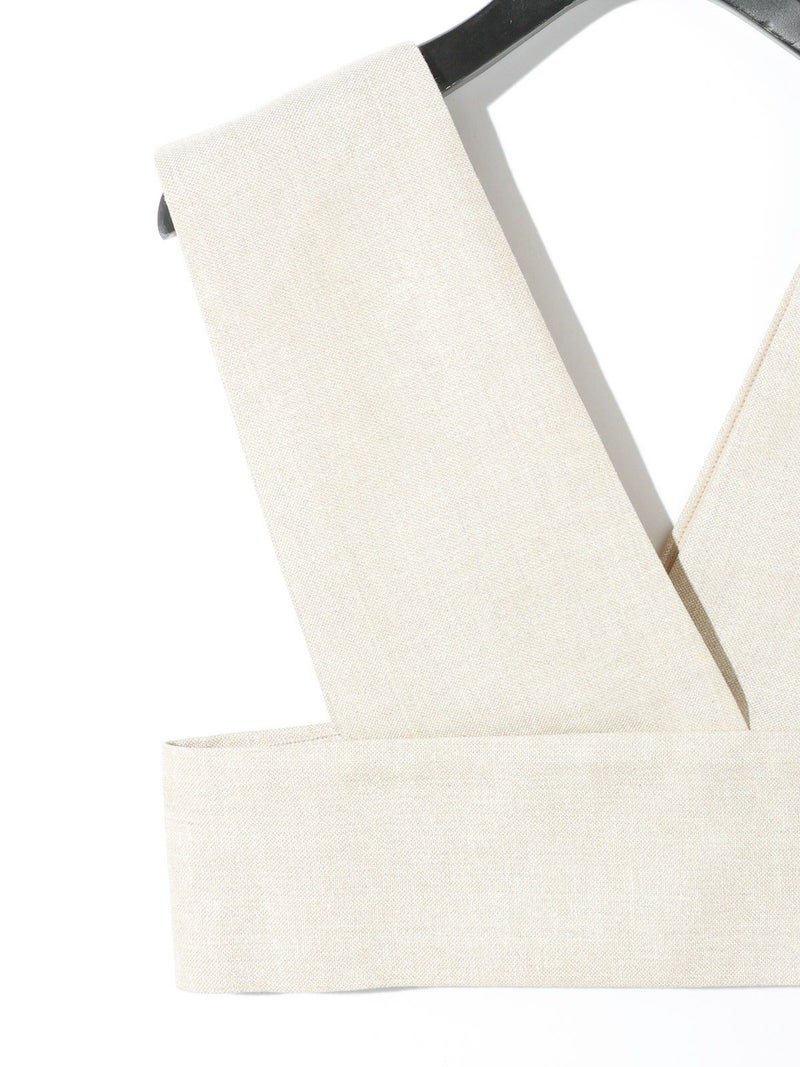 夏のシンプルなTシャツと合わせた着こなしにおすすめのVネックビスチェです。ラメ感・リネン混の素材を使用した清涼感あるアイテムです。サイドにファスナーが付いているので着脱がしやすいデザインです。Tシャツ以外にもワンピースやシャツで合わせることで雰囲気の異なる着こなしを演出できるレイヤードアイテムとなっています。