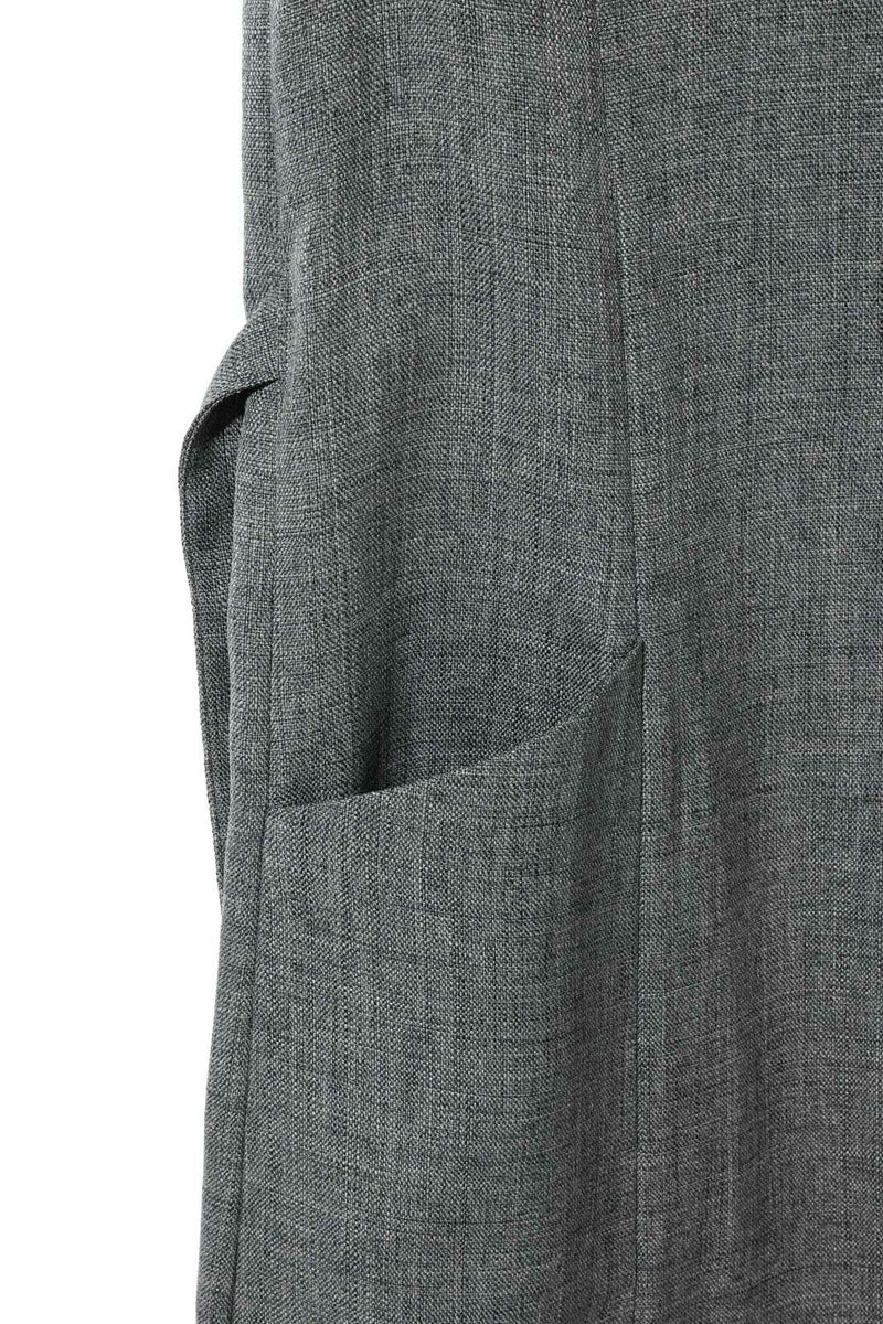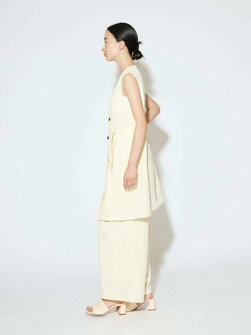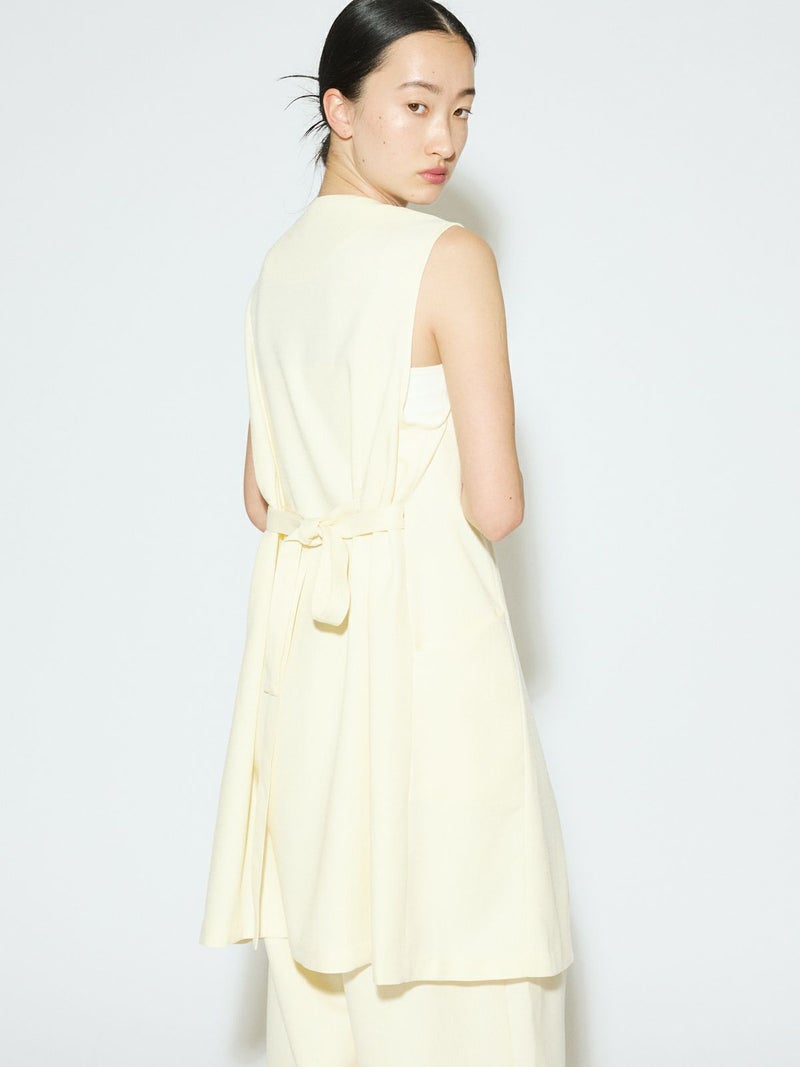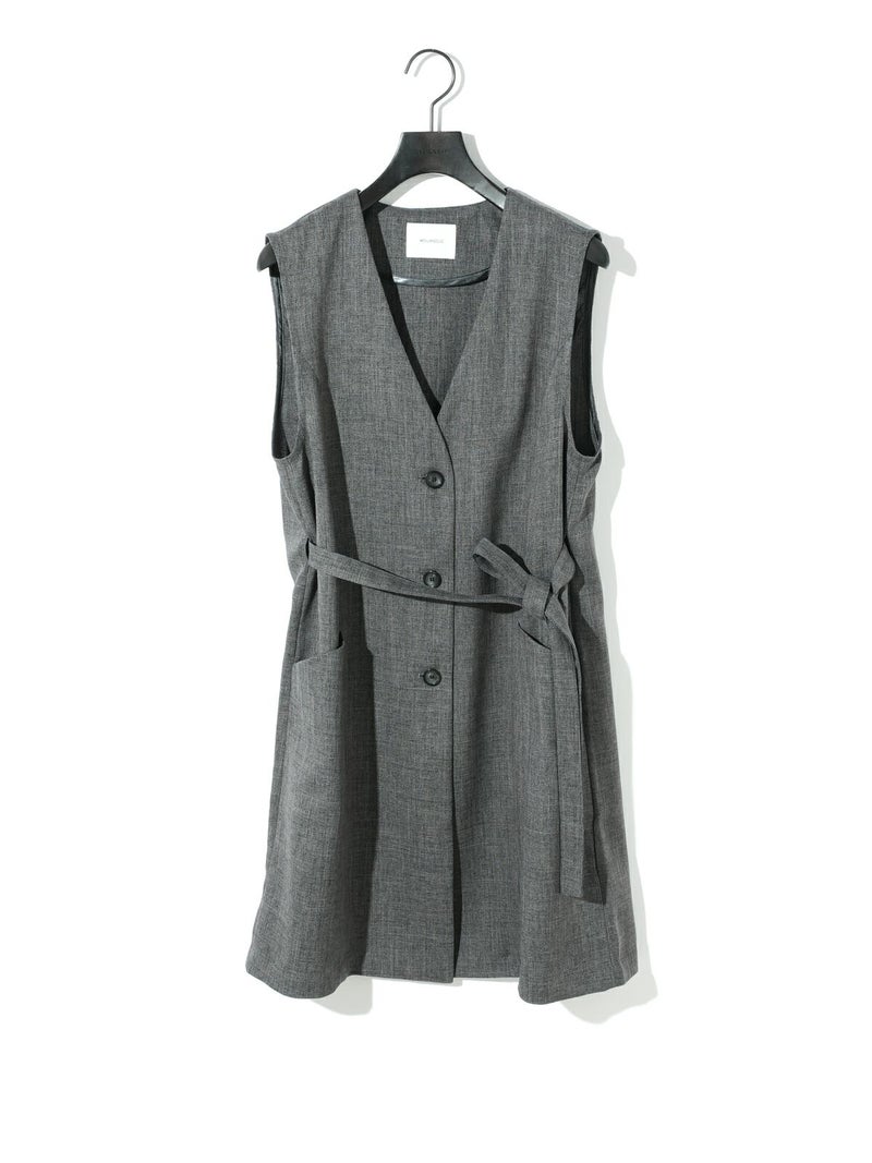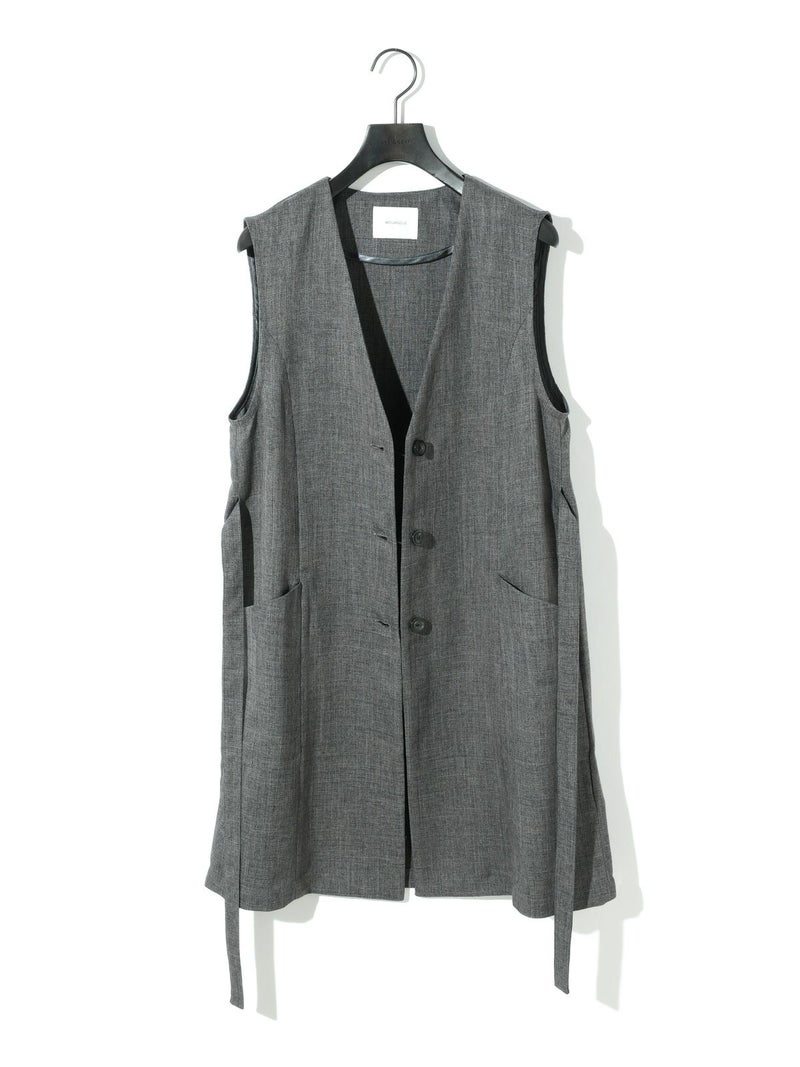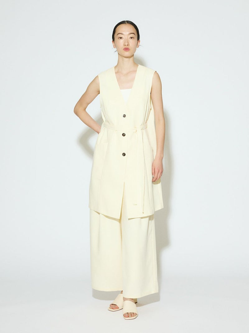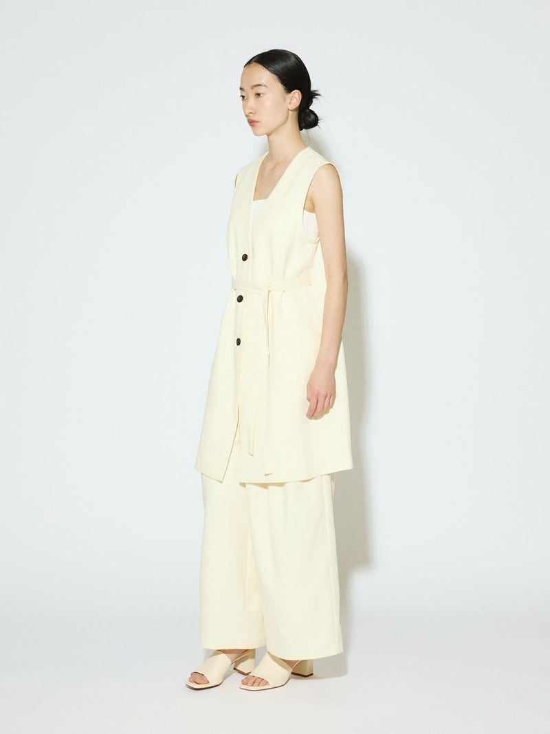メランジ調ツイード風の表情のある素材感が特徴のAラインノーカラーロングジレです。上品な雰囲気と肌離れがよく軽やかな着心地を体感していただけます。ミドル丈でボトムスに合わせやすいデザインです。ベルトの結び方でスタイルチェンジをしていただけます。アイボリーのみボタンを配色使いにしています。同シリーズの2-162182/タックスラックスも展開しておりボトムスとのセットアップで正装着にもおすすめです。