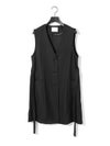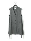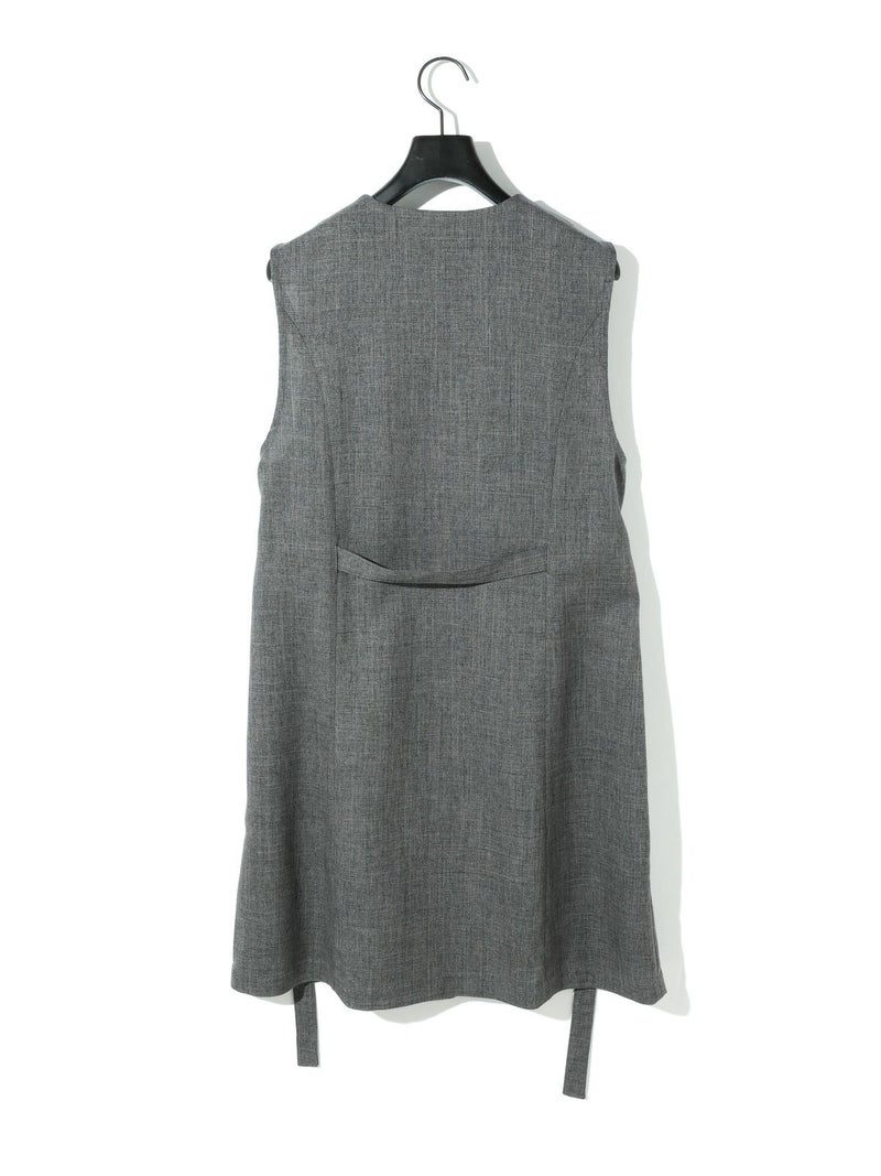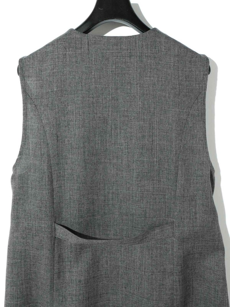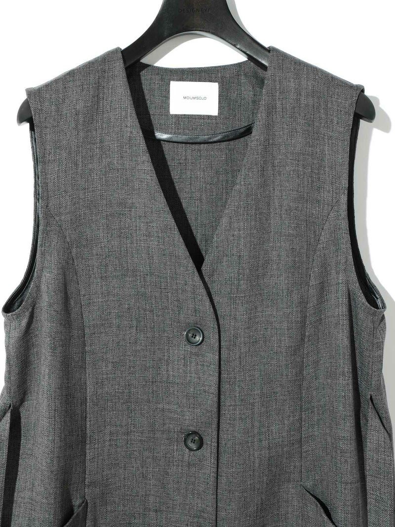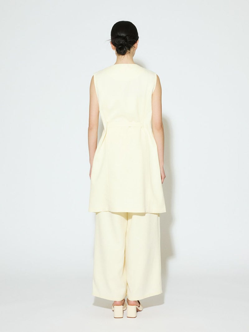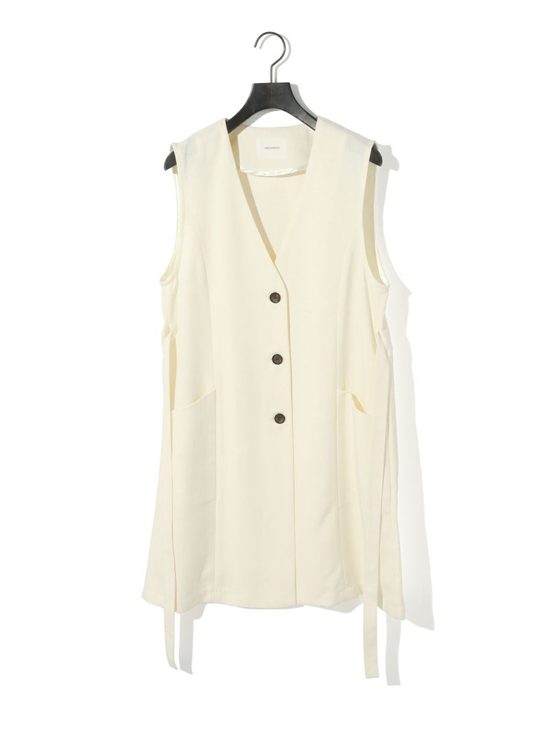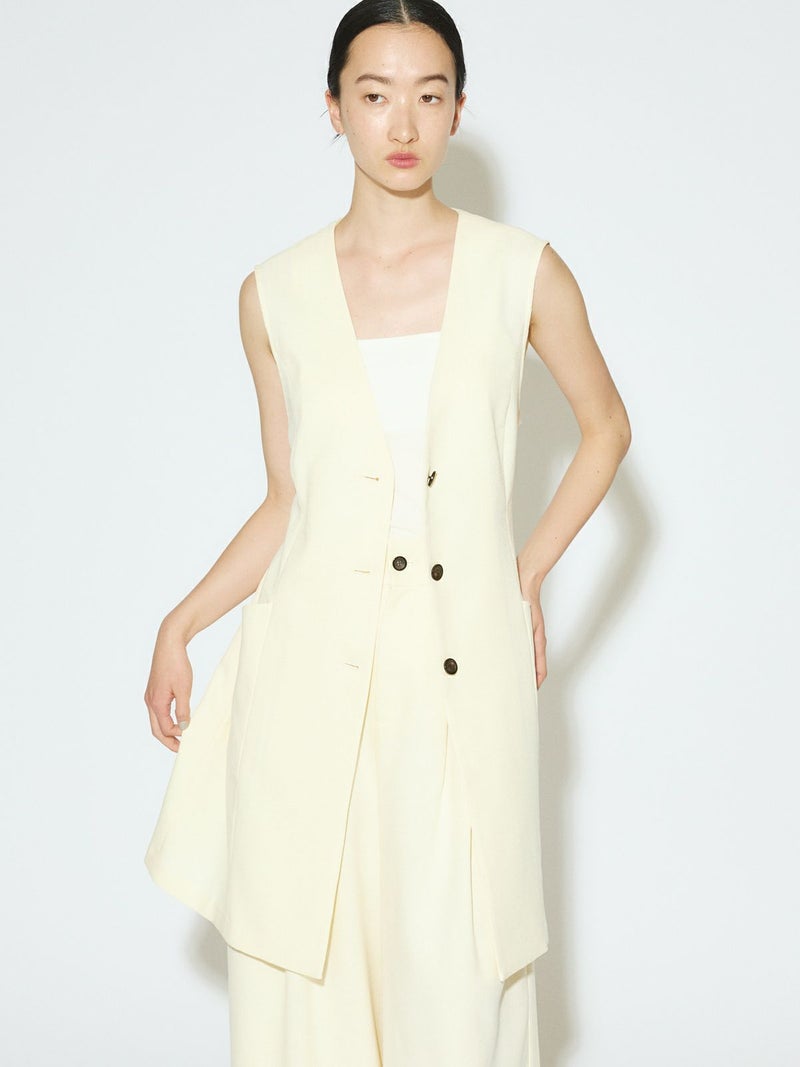 メランジ調ツイード風の表情のある素材感が特徴のAラインノーカラーロングジレです。上品な雰囲気と肌離れがよく軽やかな着心地を体感していただけます。ミドル丈でボトムスに合わせやすいデザインです。ベルトの結び方でスタイルチェンジをしていただけます。アイボリーのみボタンを配色使いにしています。同シリーズの2-162182/タックスラックスも展開しておりボトムスとのセットアップで正装着にもおすすめです。