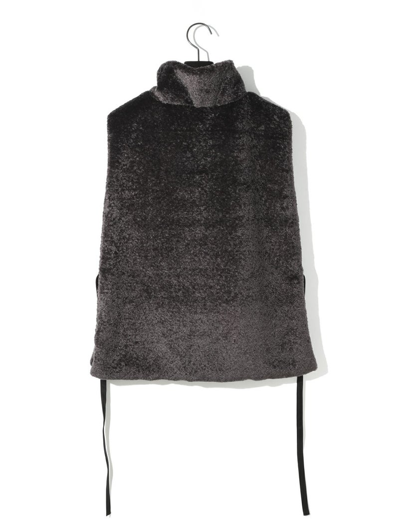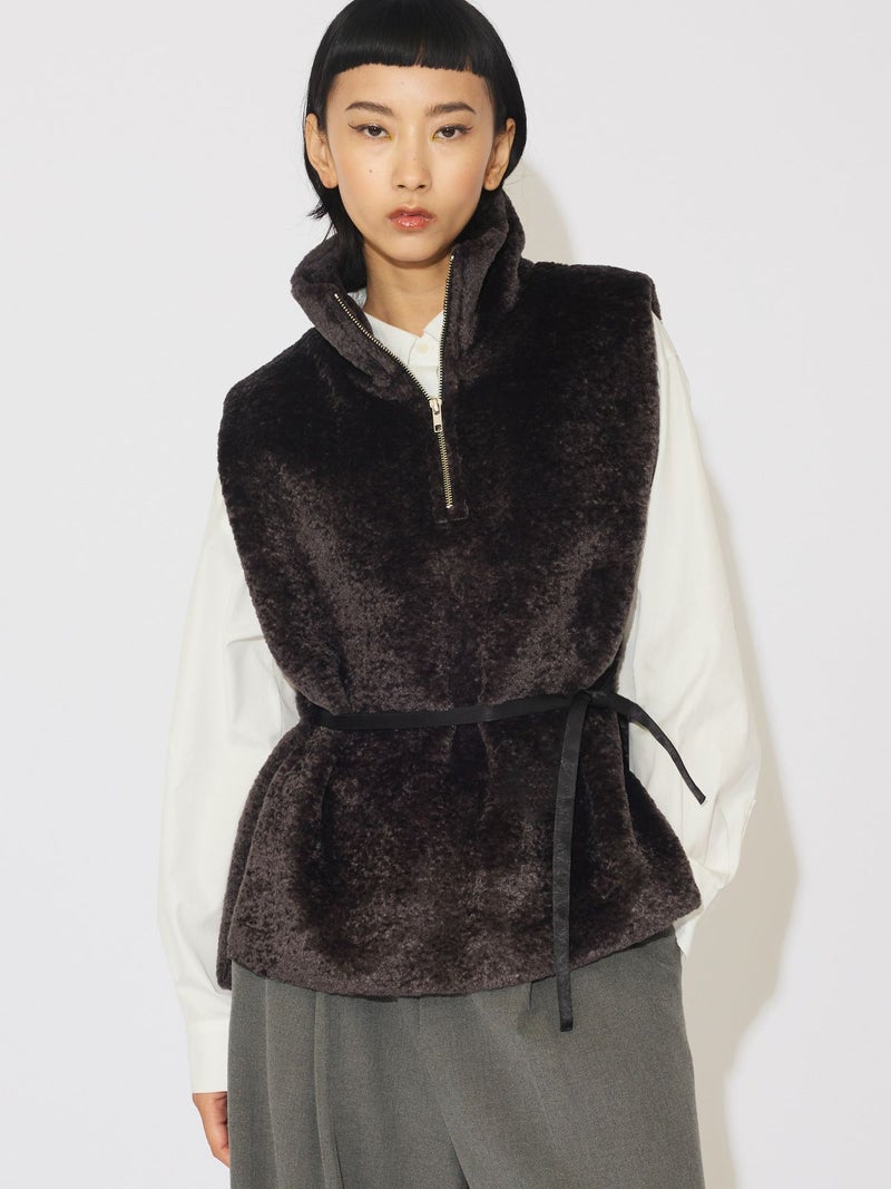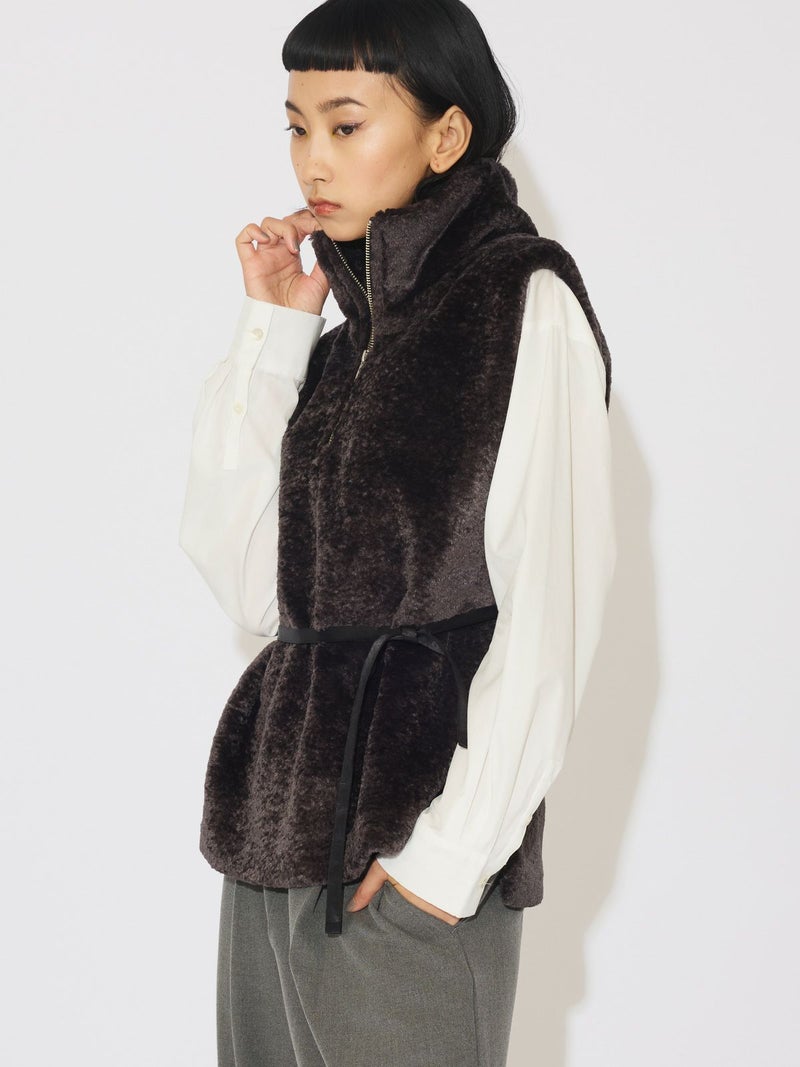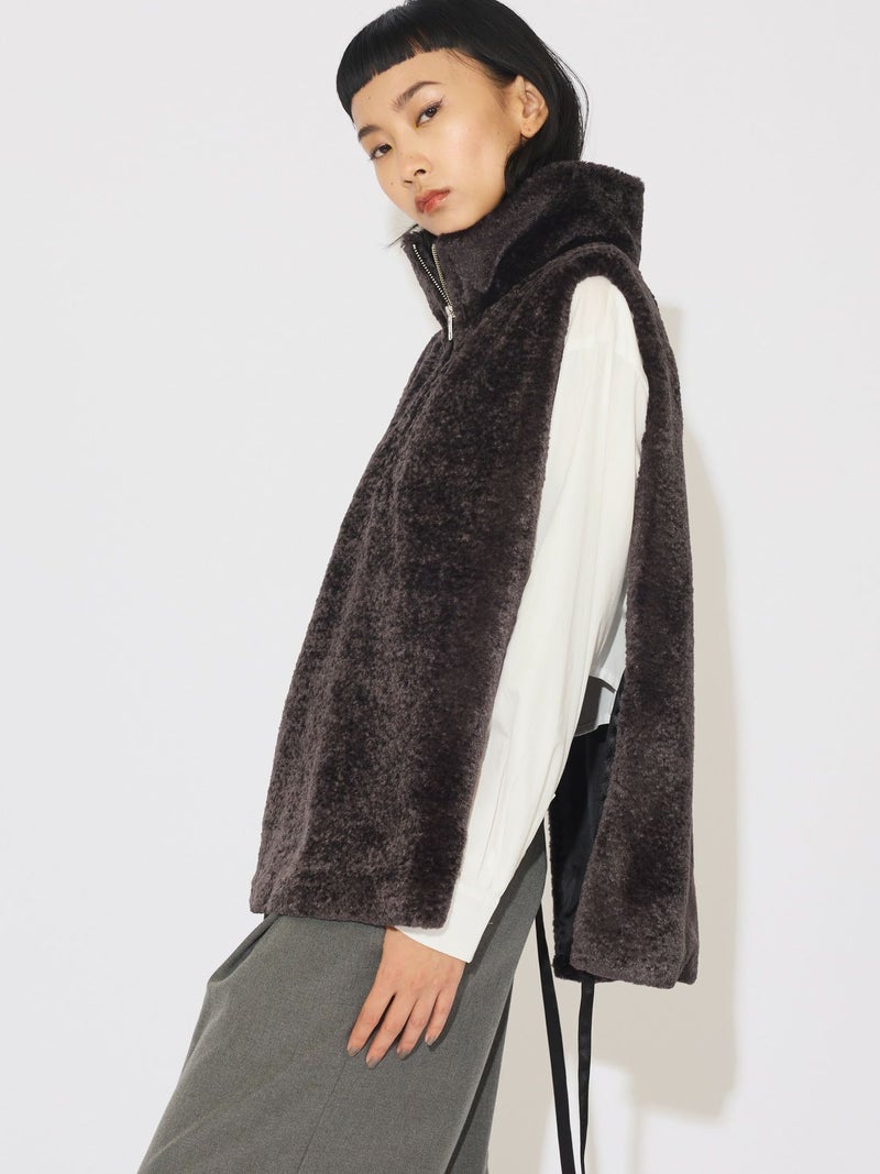 カジュアルに見えがちなボアをモードに演出したハーフジップボアベストです。光沢感がありきれいに見える上質で心地よいボアを使用しました。脇が完全に開いていてアイテム問わず合わせやすいベストです。ヴィンテージ風サテンリボンを使用。前でも横でも絞って着用していただけるアレンジのきく1枚です。同シリーズ3-172077/ボア切替ブルゾンも展開。