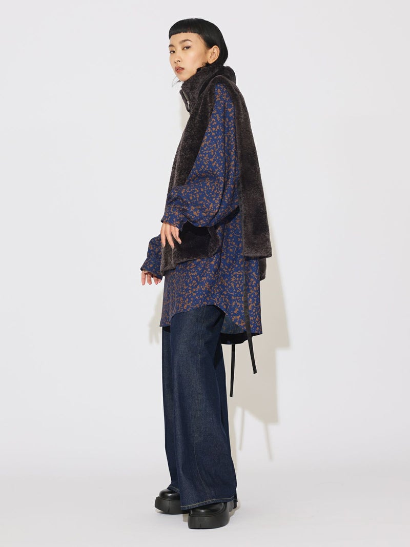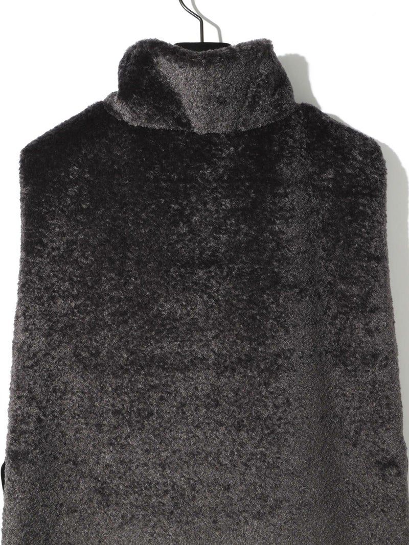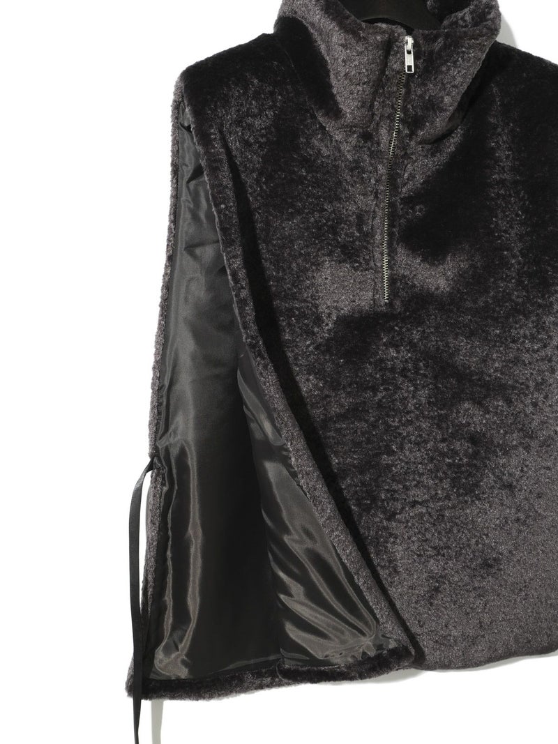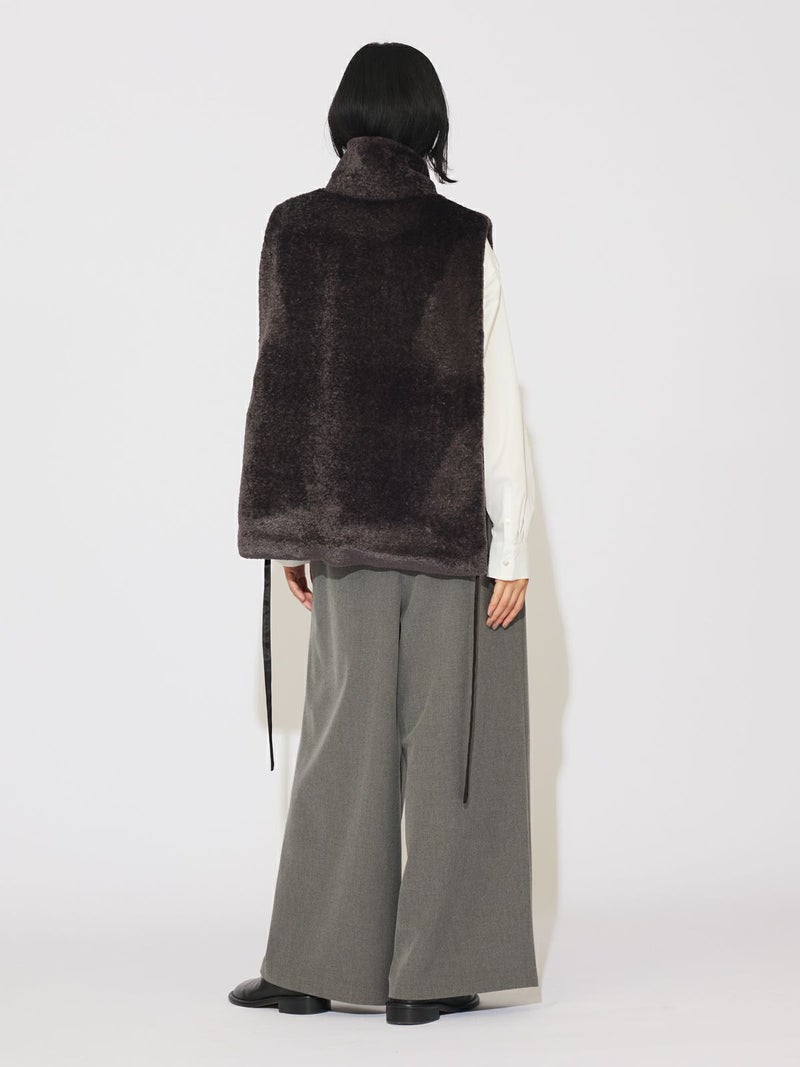 カジュアルに見えがちなボアをモードに演出したハーフジップボアベストです。光沢感がありきれいに見える上質で心地よいボアを使用しました。脇が完全に開いていてアイテム問わず合わせやすいベストです。ヴィンテージ風サテンリボンを使用。前でも横でも絞って着用していただけるアレンジのきく1枚です。同シリーズ3-172077/ボア切替ブルゾンも展開。