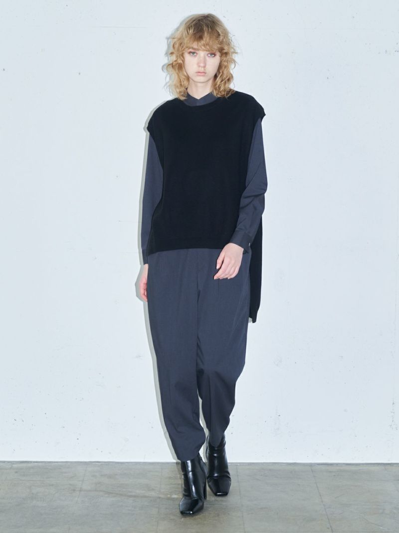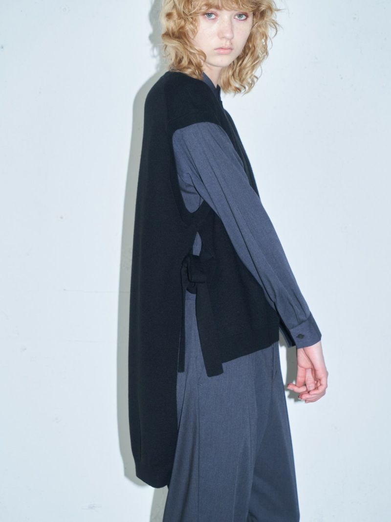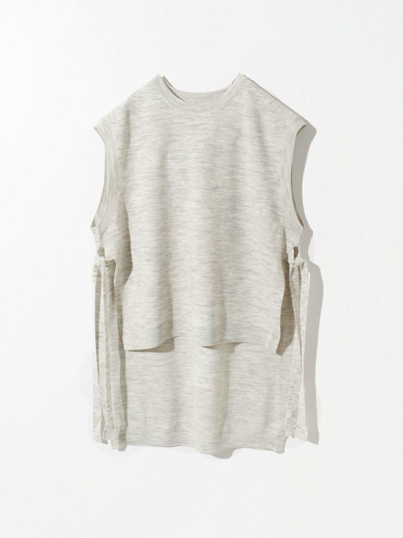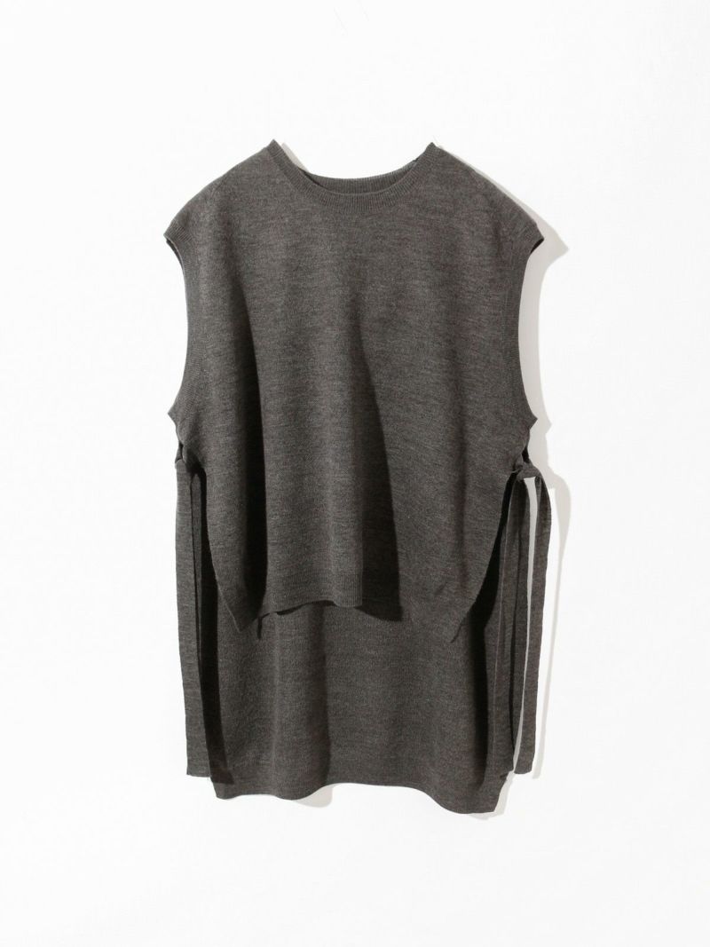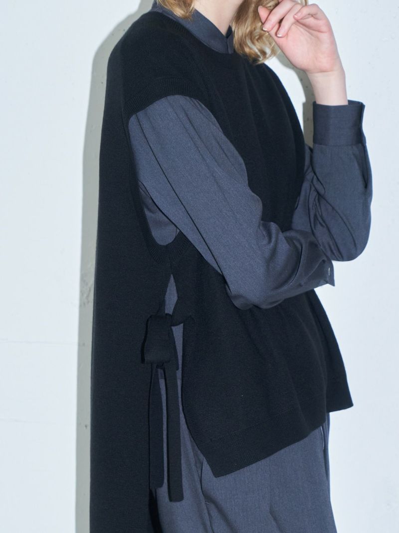 MIDIUMISOLID定番のサイドリボンニットベストです。実績のあるデザインで前後差を大きく付けた動きのあるシルエットが特長的。袖を通しやすいアームで着やすいのはもちろん、サイドのリボンが女性らしい雰囲気を印象付けた魅力的なベストです。ワンピースやシャツ、色々なアイテムにレイヤードができるお勧めの1枚。アクセントになる差し色のライトブルーの鮮やかさに加えベーシックにコーディネートができる3色で揃えています。