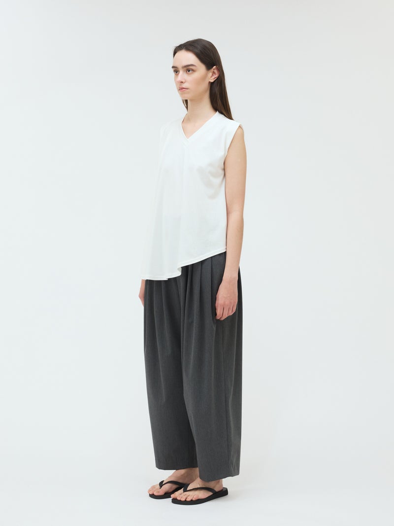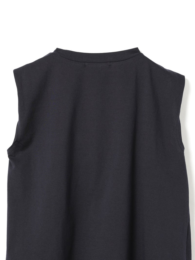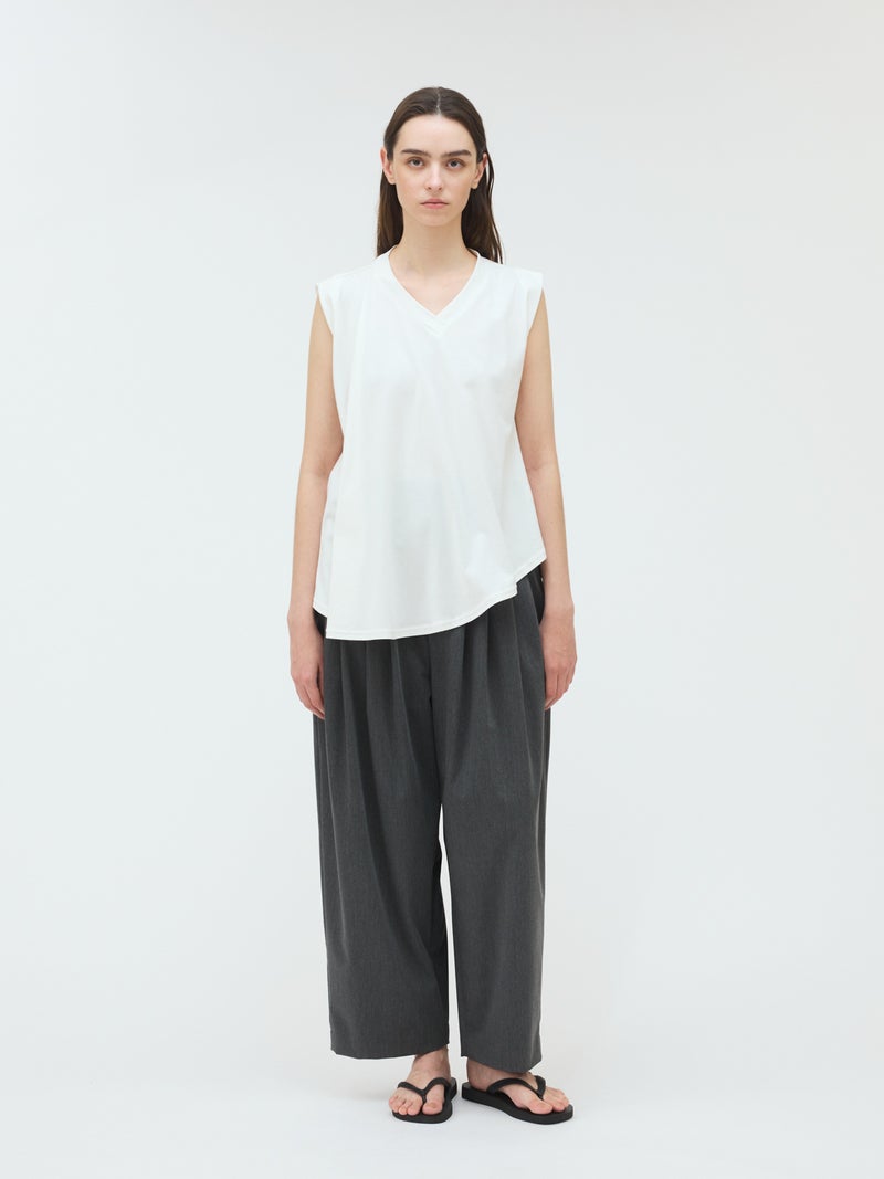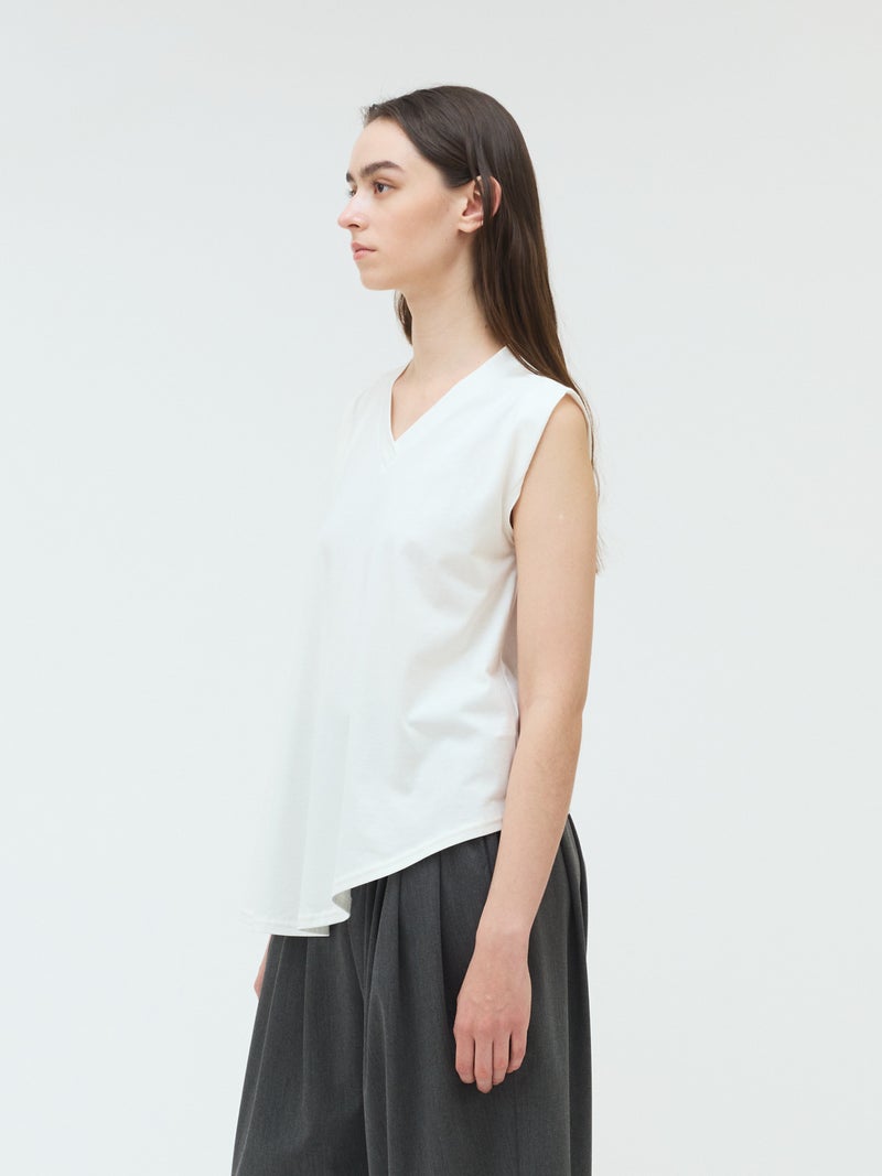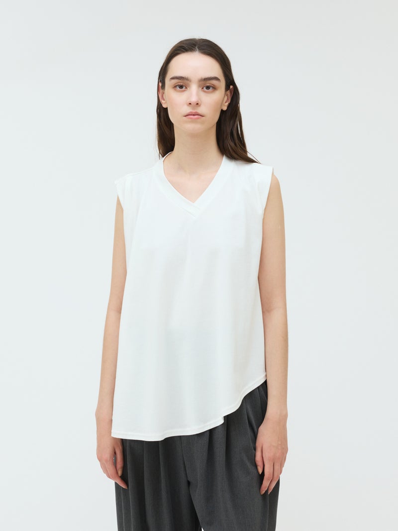 60天竺を使用したVネックアシンメトリーノースリーブプルオーバーが再入荷しました。今季はベーシックな2色に絞って展開。透け感のないややハリのある素材が特徴。脇が見えない袖ぐりに仕上げたことで1枚での着用も可能。斜めに動きのあるシルエットは右に長いアシンメトリーのシルエットが印象的。清涼感があり爽やかで気軽に着こなせる着回しアイテムです。