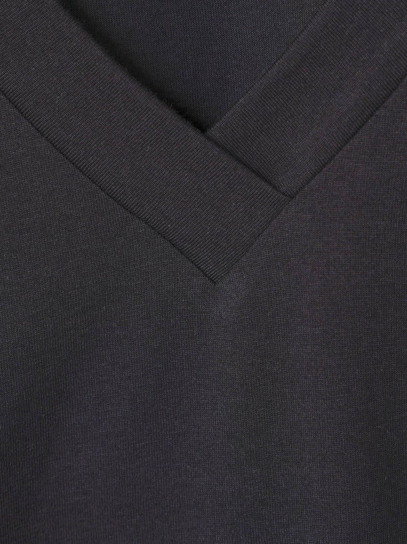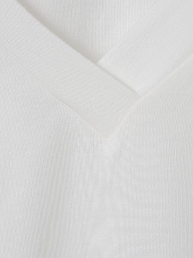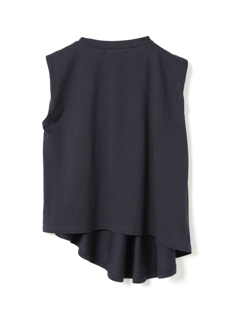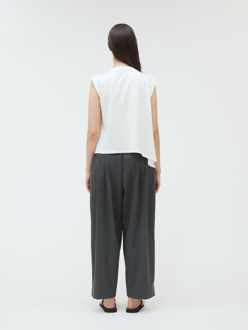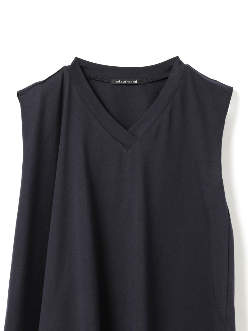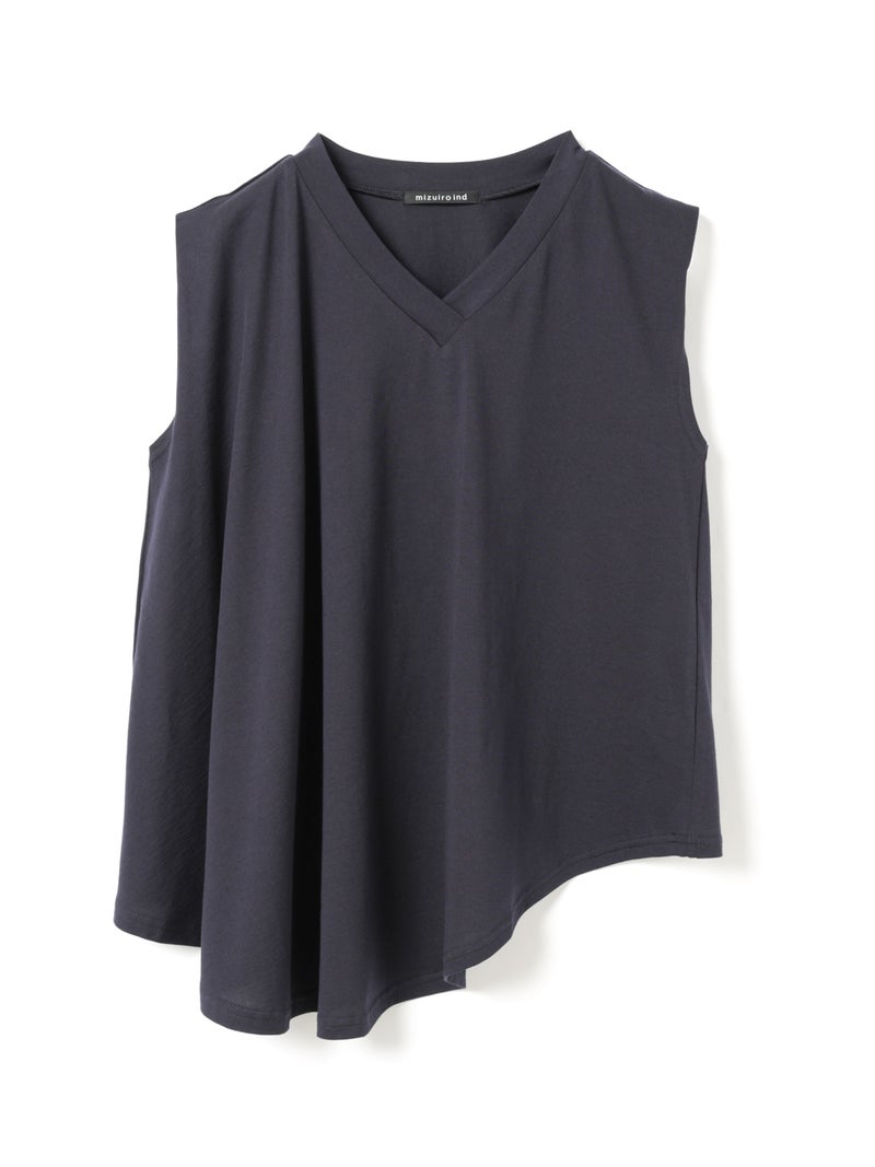 60天竺を使用したVネックアシンメトリーノースリーブプルオーバーが再入荷しました。今季はベーシックな2色に絞って展開。透け感のないややハリのある素材が特徴。脇が見えない袖ぐりに仕上げたことで1枚での着用も可能。斜めに動きのあるシルエットは右に長いアシンメトリーのシルエットが印象的。清涼感があり爽やかで気軽に着こなせる着回しアイテムです。