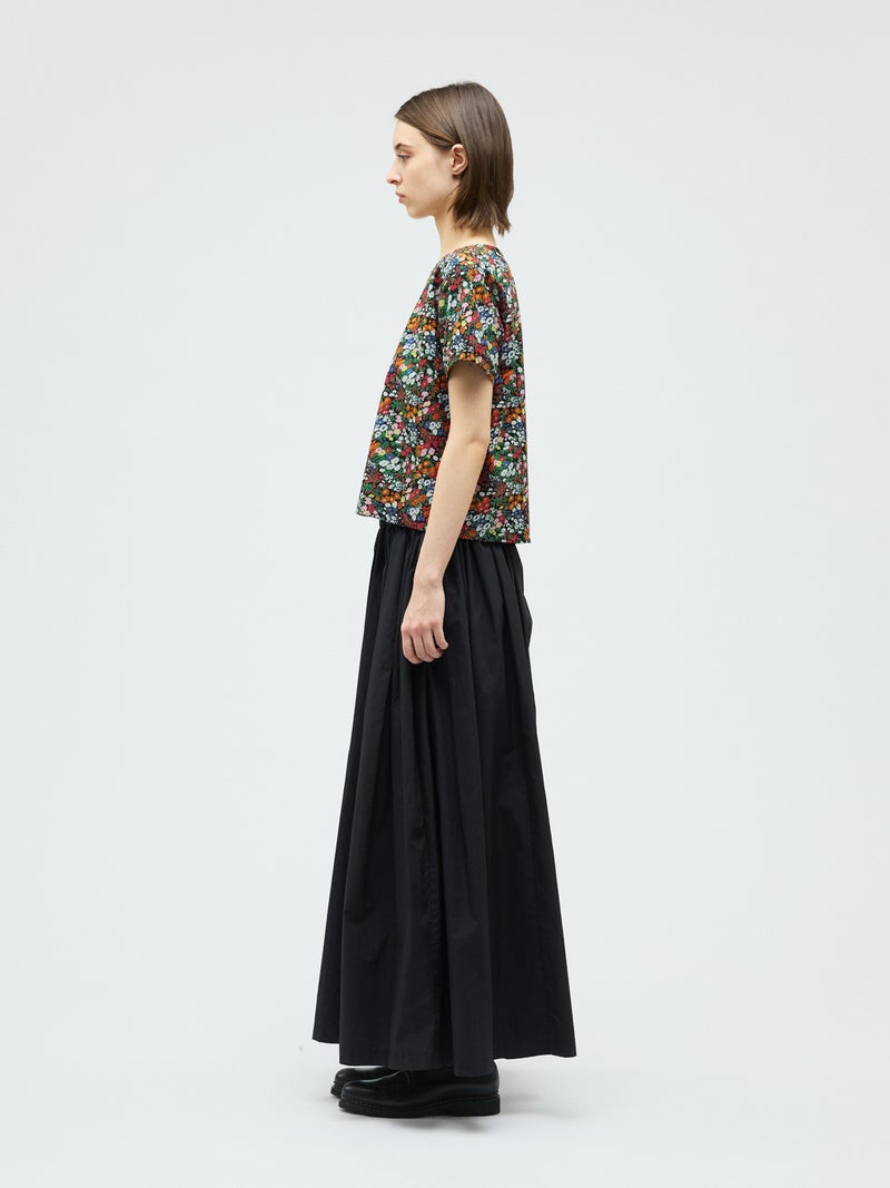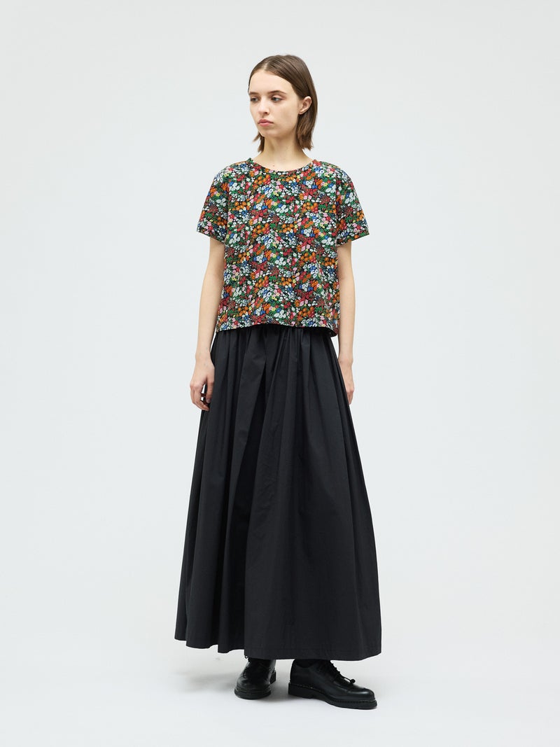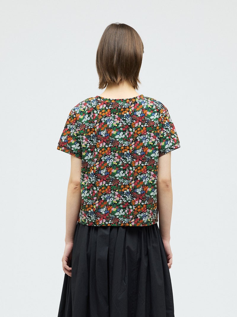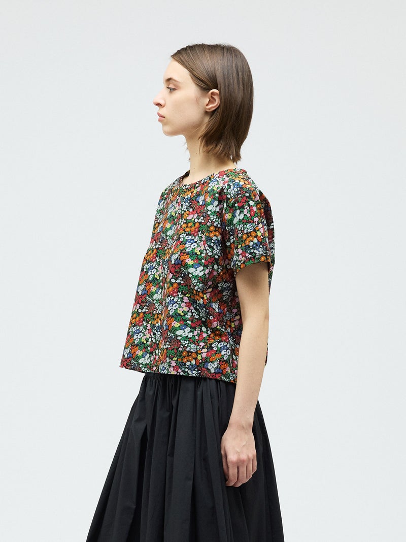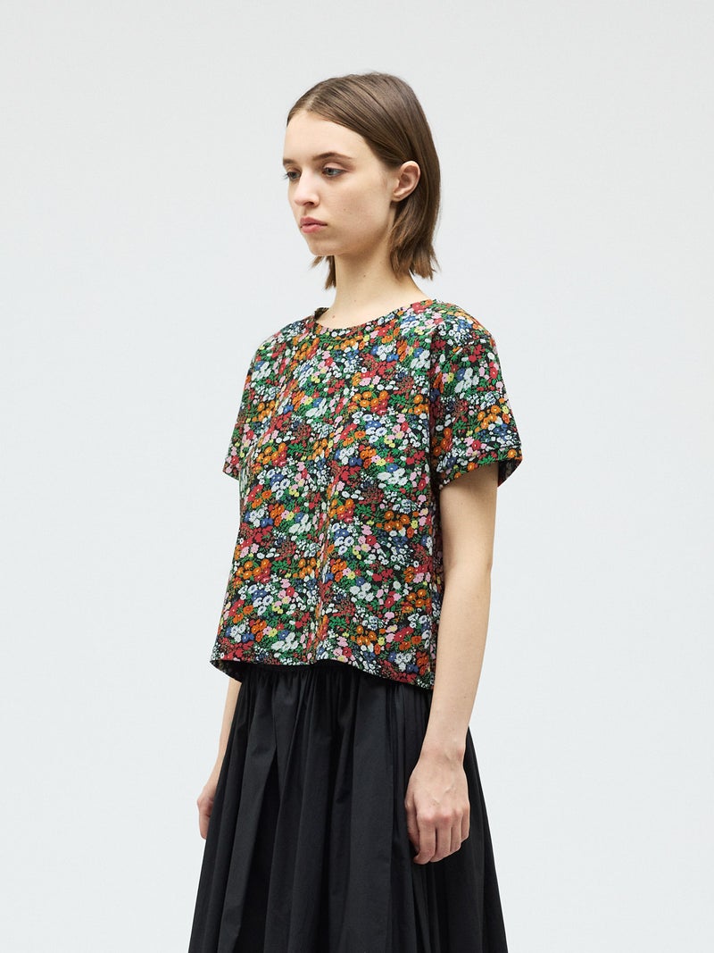 カットソーにビビッドな花柄をプリントしたフラワープリントTシャツです。ポリエステル素材なので毛羽立ちが少なく、さらっとした肌当たりを体感していただけます。ネイビーとブラックの2色展開ですが、花柄の配色が全く異なっており、どちらもヴィンテージ感のある魅力的な着こなしを演出します。コンパクトなサイズ感でスッキリとしたシンプルなシルエットを表現。ボリュームのあるボトムにもバランスよくコーディネートしていただけます。ベストに合わせたりインナー使いにもお勧め。花柄の配色がたくさんあるので着こなしの幅も広く愛用していただけます。同シリーズ1-210084/フラワープリントラウンドカラーカーディガンと1-210086/フラワープリントフレンチスリーブプルオーバーも展開。