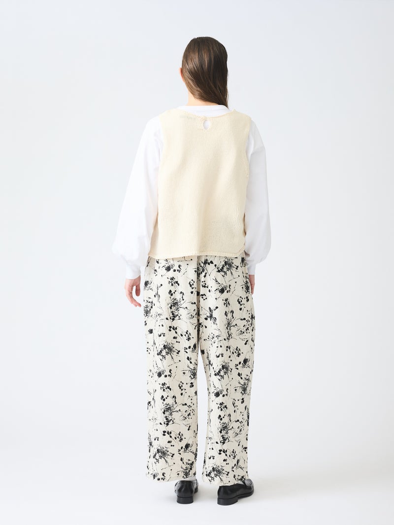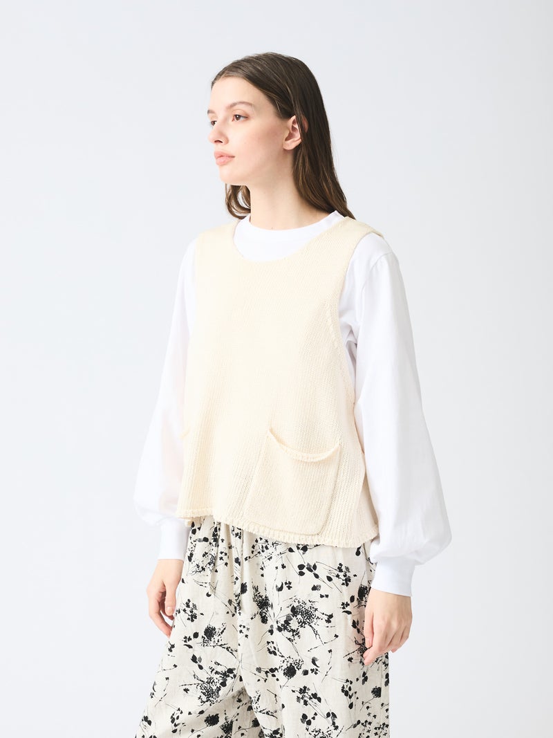 mizuiro ind人気のベストアイテム、テープヤーンショートベストが再入荷しました。ザックリとしたローゲージニットで軽さがあり季節の変わり目にお勧めの春ニットです。アームは広めなので重ね着がしやすいデザイン仕上げ。フロントポケットが二つ付いたも魅力的なベストです。お洗濯もご自宅で可能。バックネック部分にボタンが付いているので着脱のしやすい1枚です。カラー展開は以前と変更して展開しています。コーディネートに困らないベーシックな3色展開です。