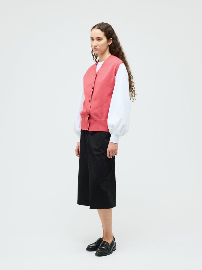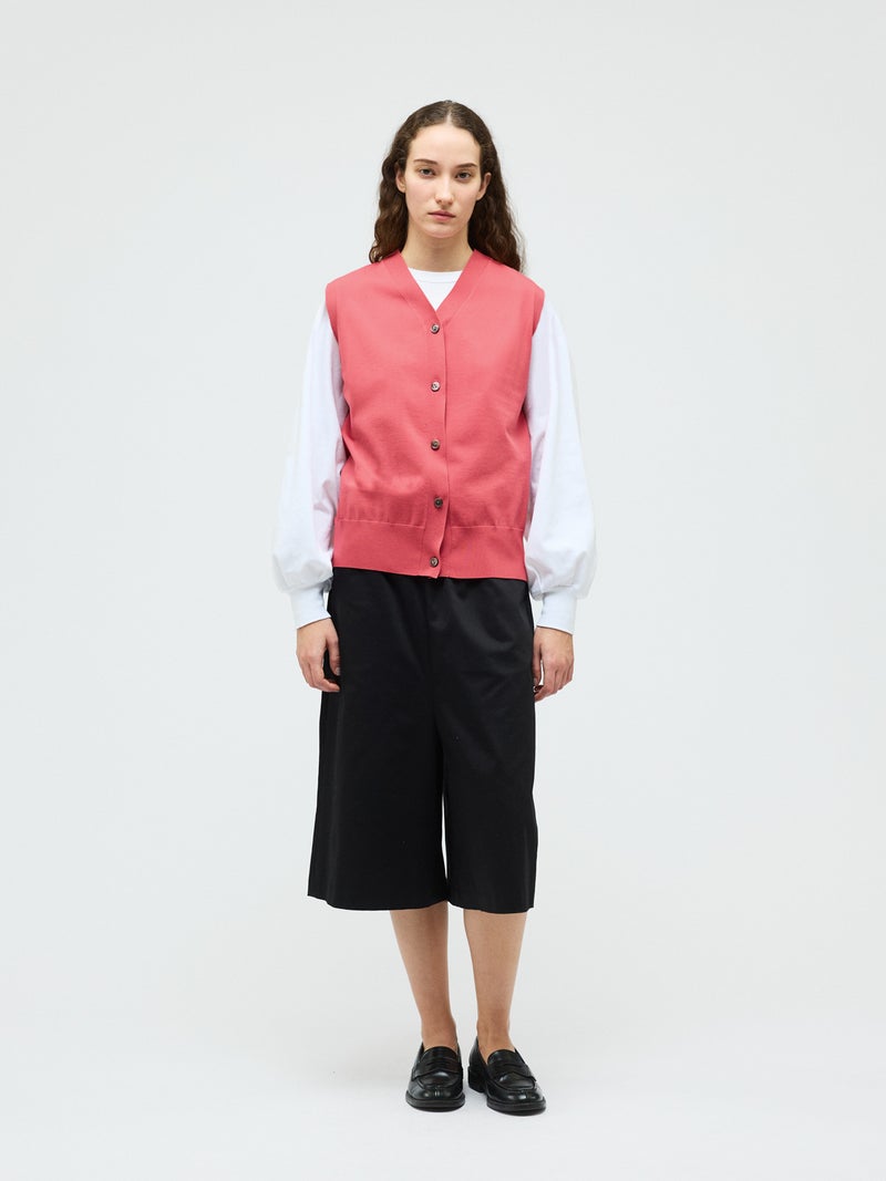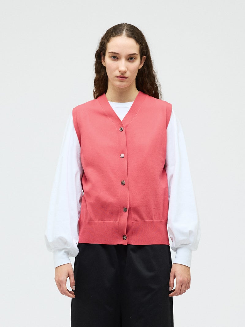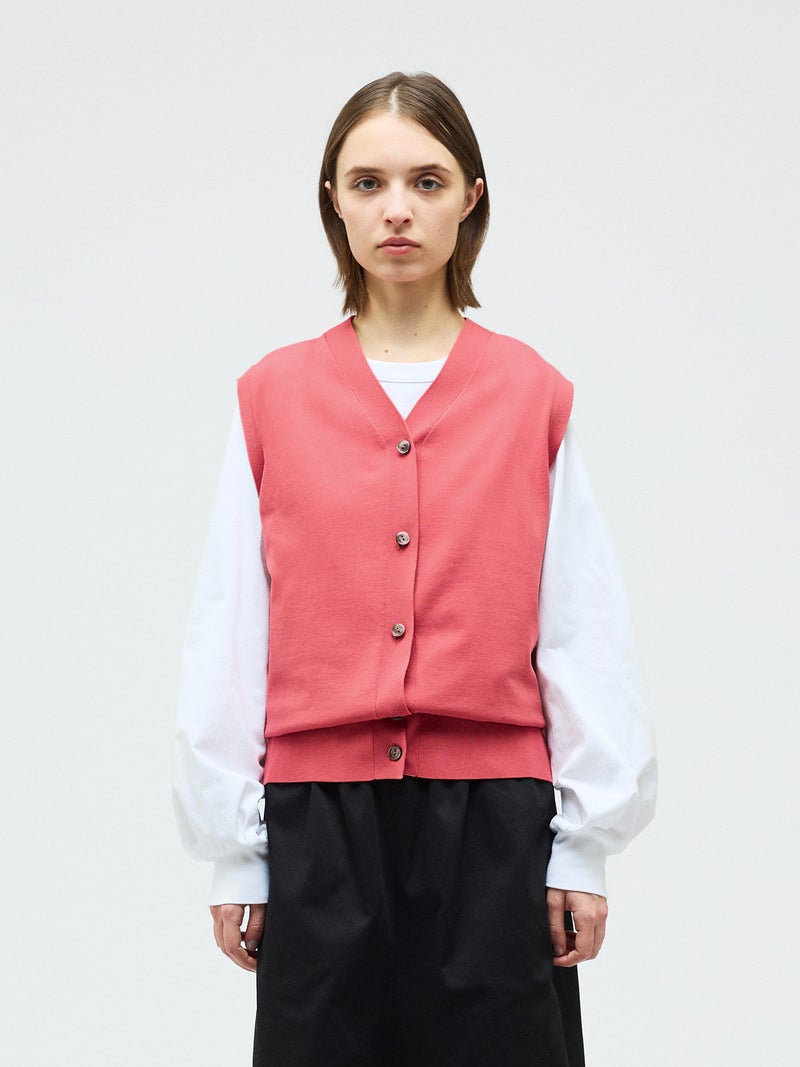 メンズライクな雰囲気を印象付けたVネックベストです。シンプルでクラシックな表情が特徴。腰位置で身丈を自然な緩さで着こなすイメージのベストです。Vネックの開きは大きくなく、胸元を気にせず着用していただけます。フロントボタンを使用。肩を包んだシルエットを表現しています。重ね着もでき、夏場はノースリーブ感覚でのコーディネートも素敵です。ベーシックに合わせやすい1枚です。5色の豊富な色展開もポイントです。