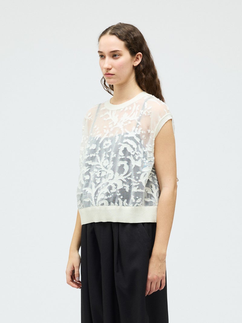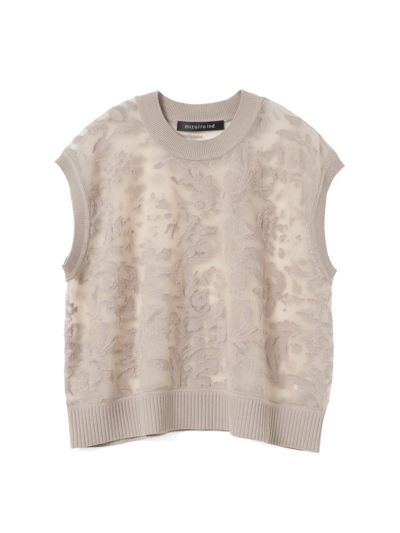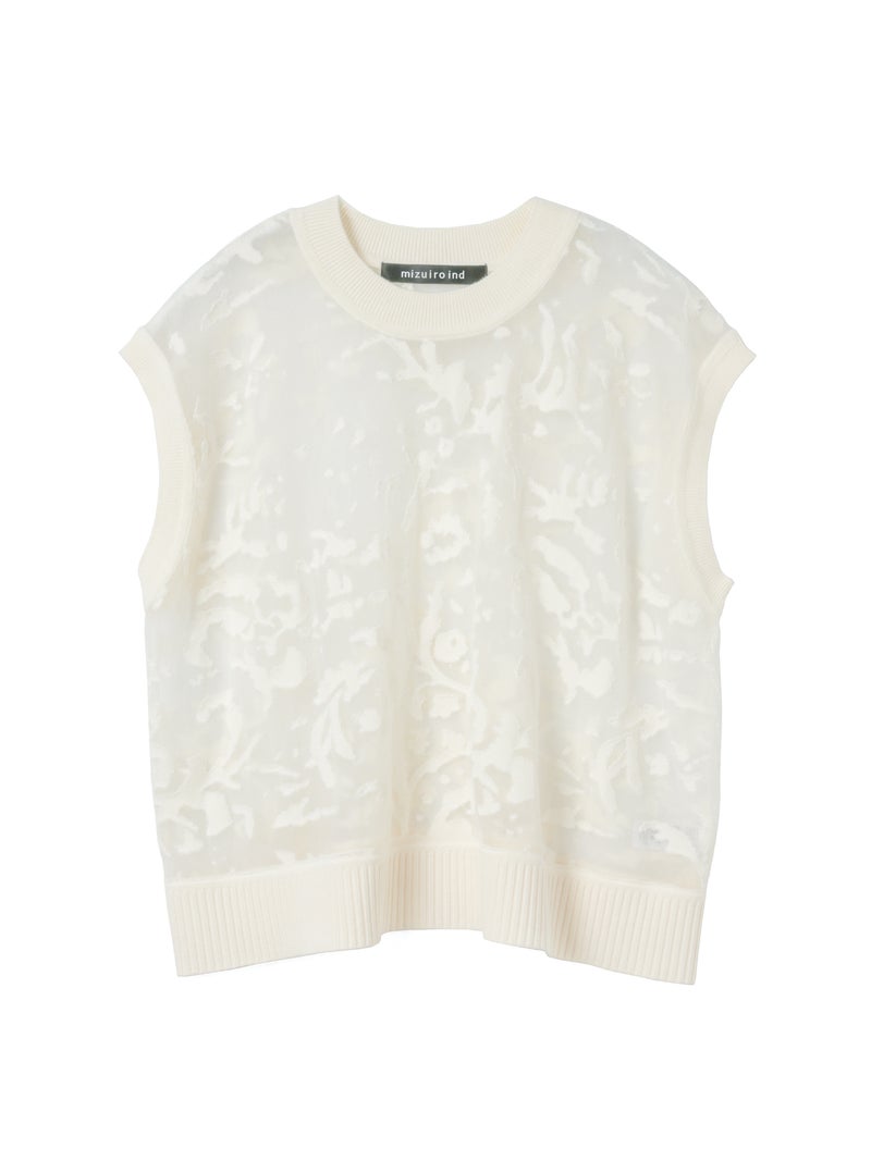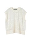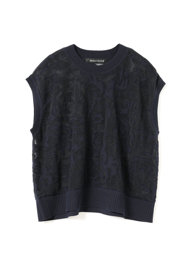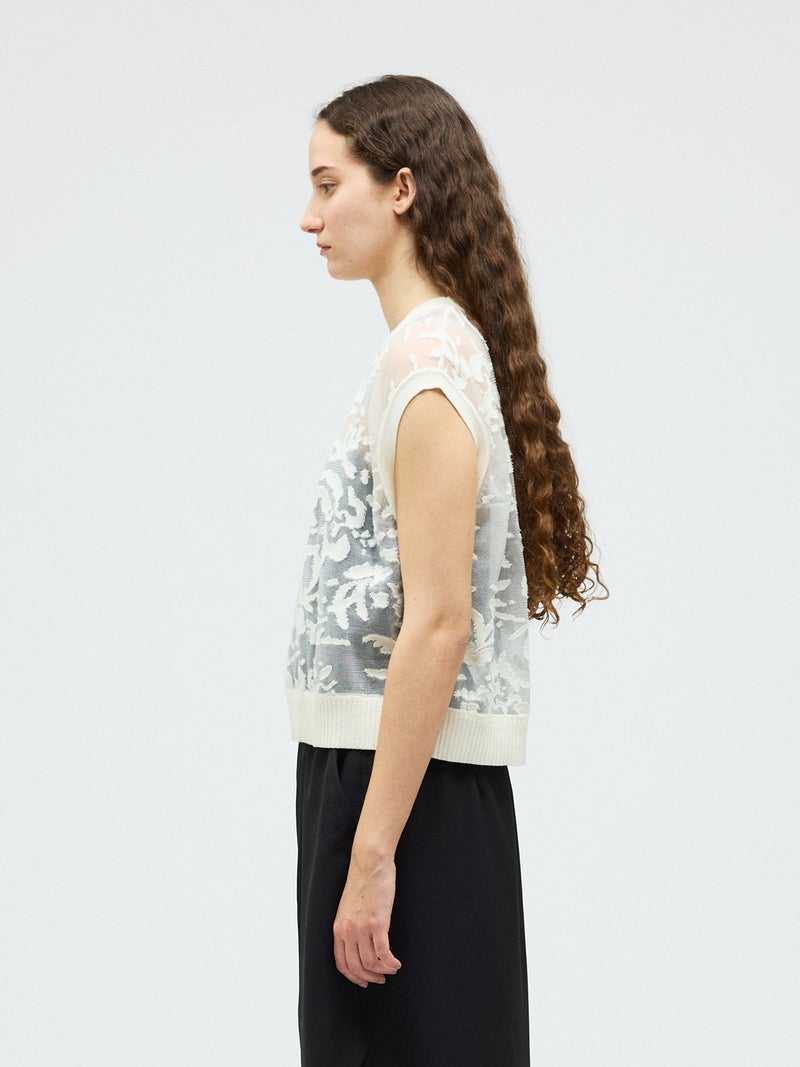 オパール加工(溶剤を使って編地の柄を残す技法)を施した柔らかい透け感が特徴的なメッシュ刺繍ショートベストです。いくつかの生地を使ってデザインすることで身頃全体に華やかな模様を表現します。生地が薄く通気性の良い軽い素材のため、春~夏の季節に大変お勧めです。インナーが程よく透け、メッシュの刺繍模様がレイヤードによってより際立つデザイン。上品で清楚な雰囲気を演出した魅力的なベストです。同シリーズ1-220073/メッシュ刺繍ポロプルオーバーと1-220074/メッシュ刺繍クルーカーディガンも展開。