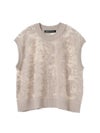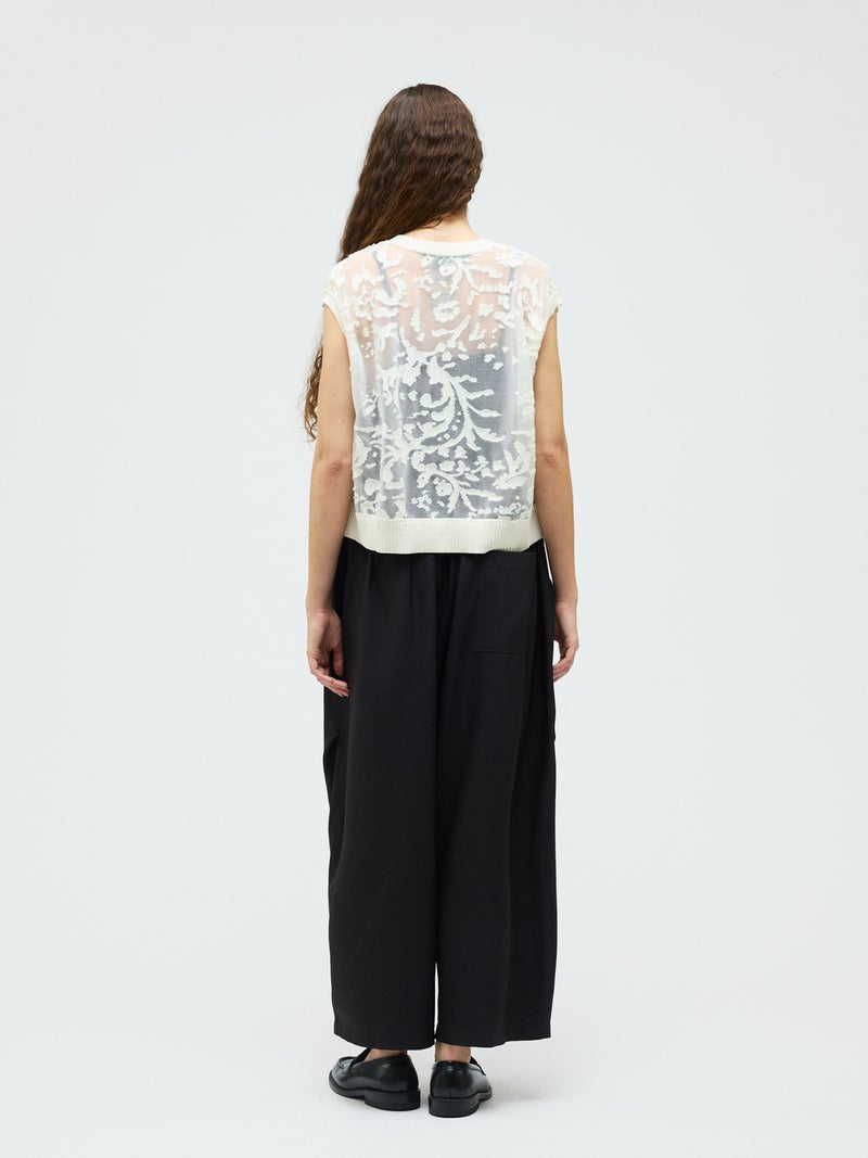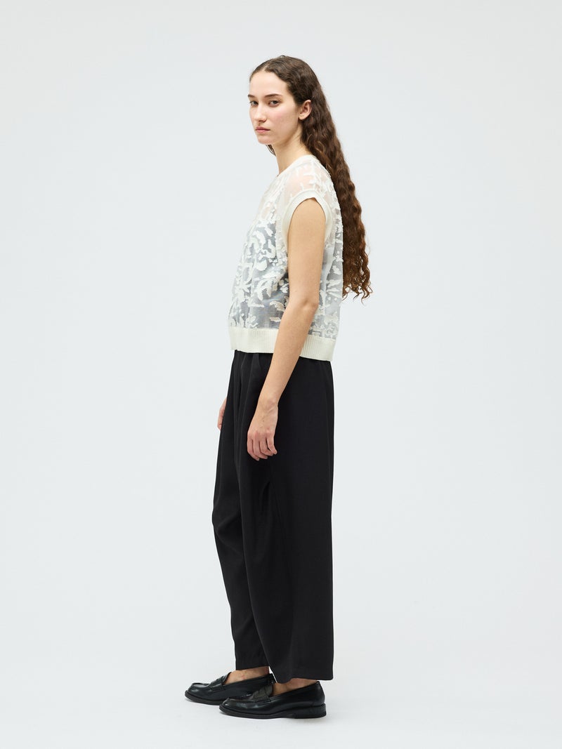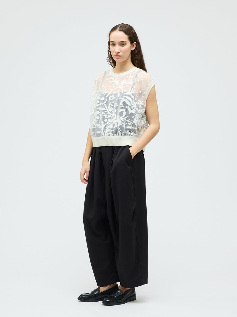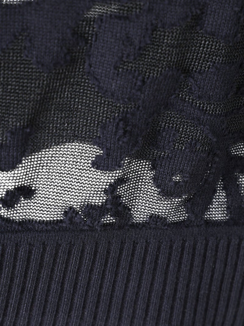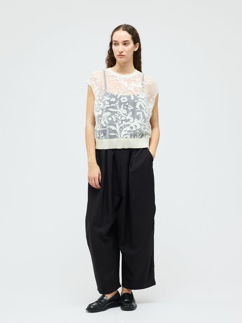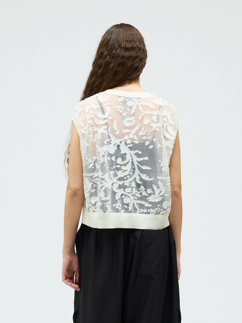 オパール加工(溶剤を使って編地の柄を残す技法)を施した柔らかい透け感が特徴的なメッシュ刺繍ショートベストです。いくつかの生地を使ってデザインすることで身頃全体に華やかな模様を表現します。生地が薄く通気性の良い軽い素材のため、春~夏の季節に大変お勧めです。インナーが程よく透け、メッシュの刺繍模様がレイヤードによってより際立つデザイン。上品で清楚な雰囲気を演出した魅力的なベストです。同シリーズ1-220073/メッシュ刺繍ポロプルオーバーと1-220074/メッシュ刺繍クルーカーディガンも展開。