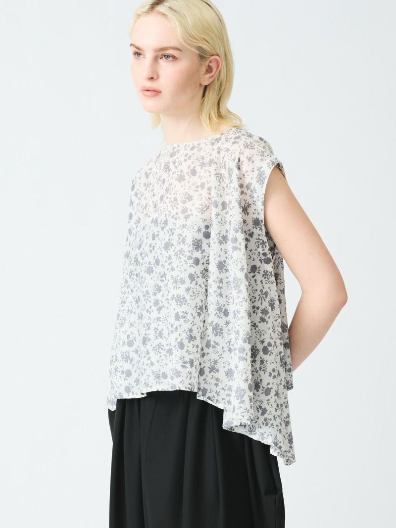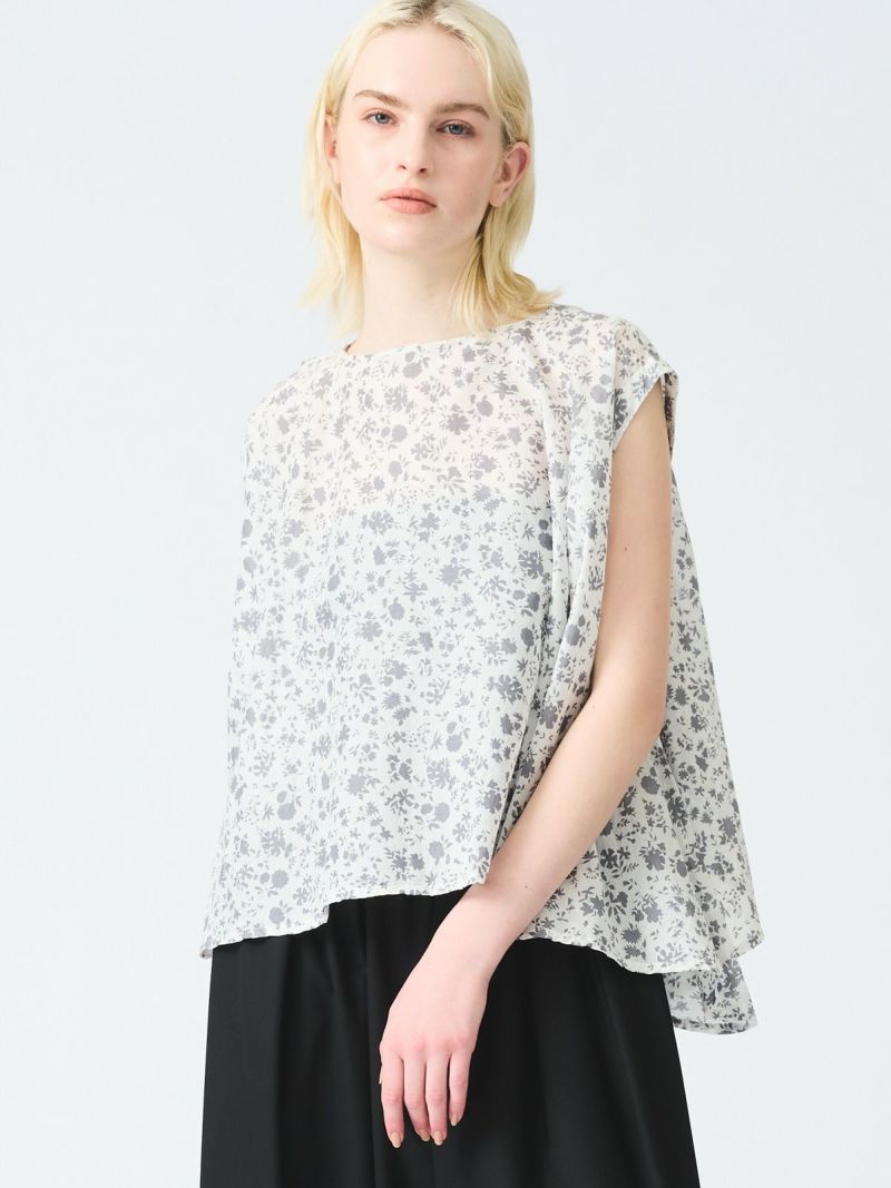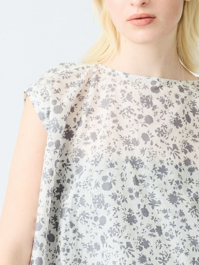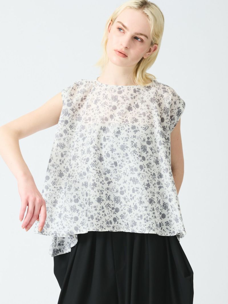 80ローンの素材にオリジナルプリントを使用したスモールフラワーノースリーブフレアプルオーバーです。印象の異なる2色のフラワー柄が上品な着こなしを印象付けます。ノースリーブのスッキリ感とサイドに落ち感のあるフレアラインのバランスの良いデザインが特徴的。バックネック部分にボタンが付いているので着脱もしやすいデザインです。ボリュームのあるボトムスとも相性よくコーディネートしていただけます。大変軽さもあり清涼感を感じていただける1枚です。同シリーズ1-230117/Vネックシャツと1-250070/ギャザーシャツワンピースも展開。
