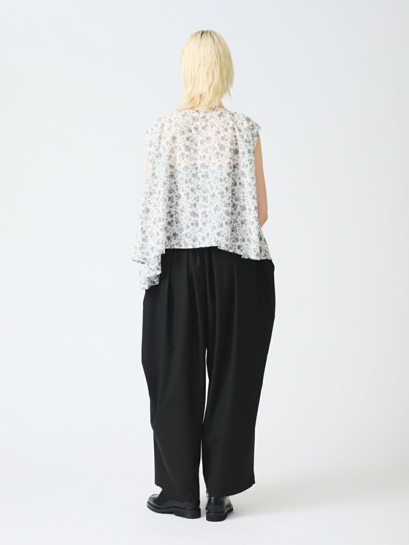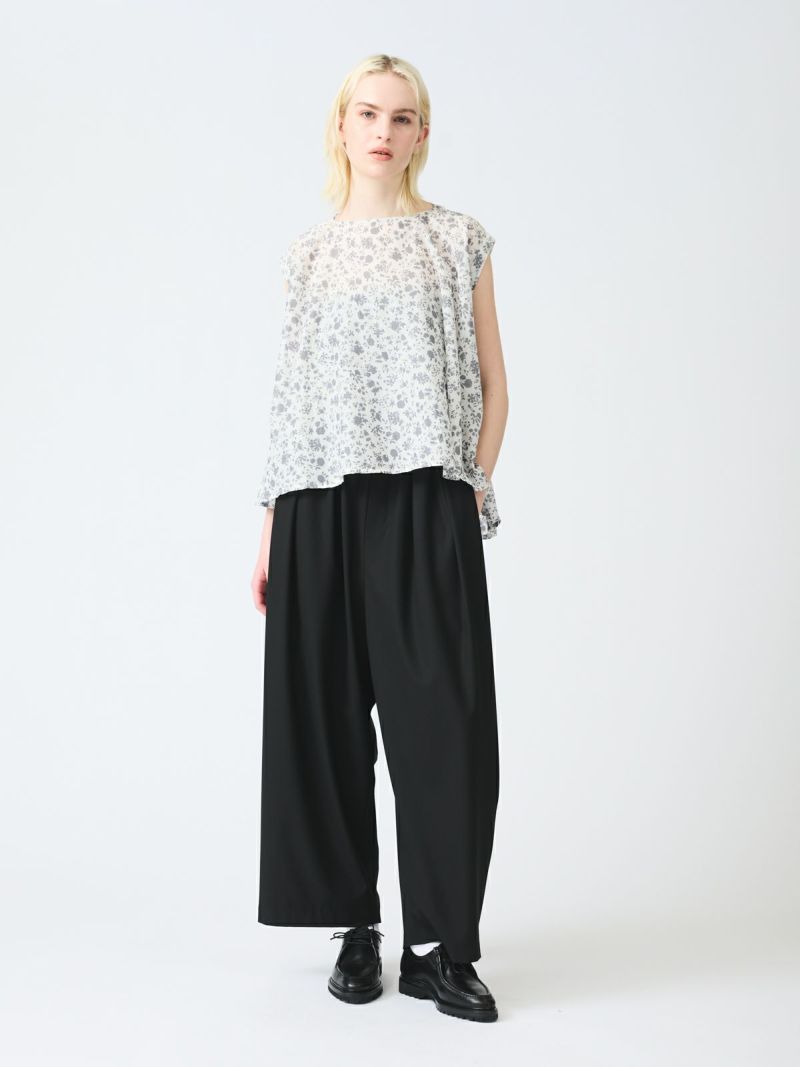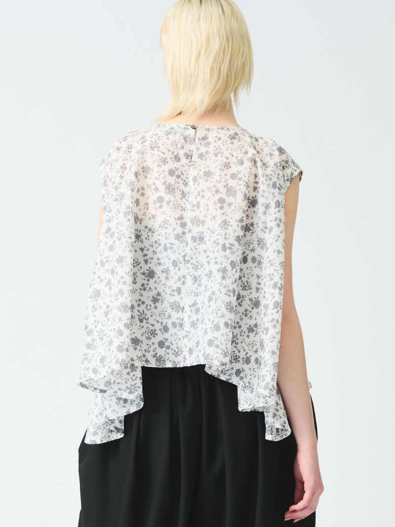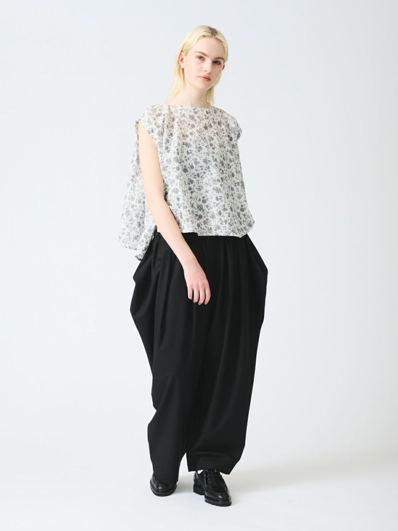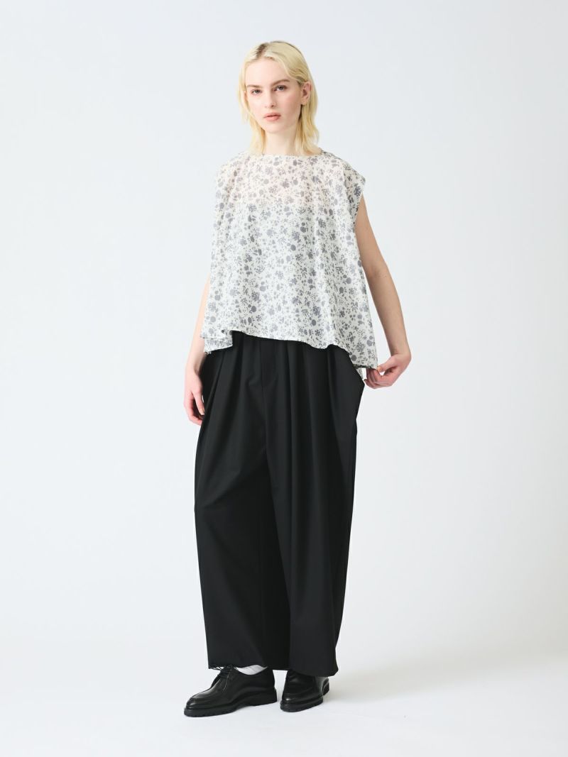 80ローンの素材にオリジナルプリントを使用したスモールフラワーノースリーブフレアプルオーバーです。印象の異なる2色のフラワー柄が上品な着こなしを印象付けます。ノースリーブのスッキリ感とサイドに落ち感のあるフレアラインのバランスの良いデザインが特徴的。バックネック部分にボタンが付いているので着脱もしやすいデザインです。ボリュームのあるボトムスとも相性よくコーディネートしていただけます。大変軽さもあり清涼感を感じていただける1枚です。同シリーズ1-230117/Vネックシャツと1-250070/ギャザーシャツワンピースも展開。