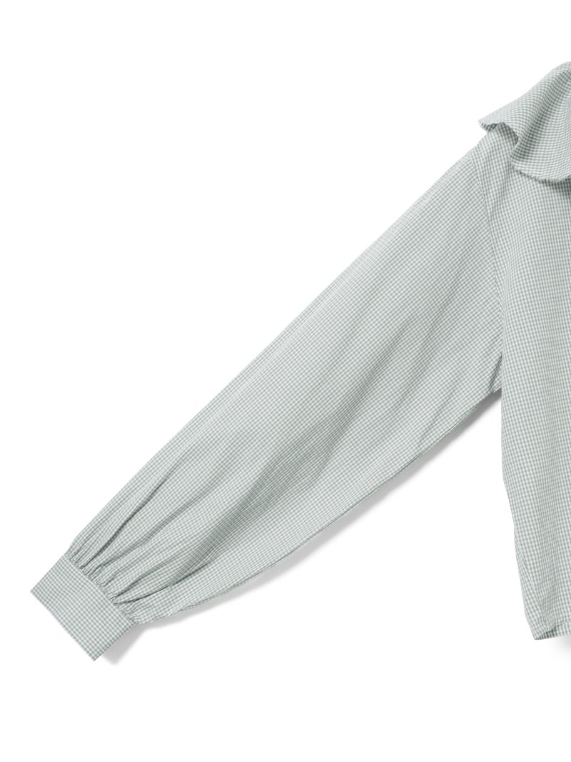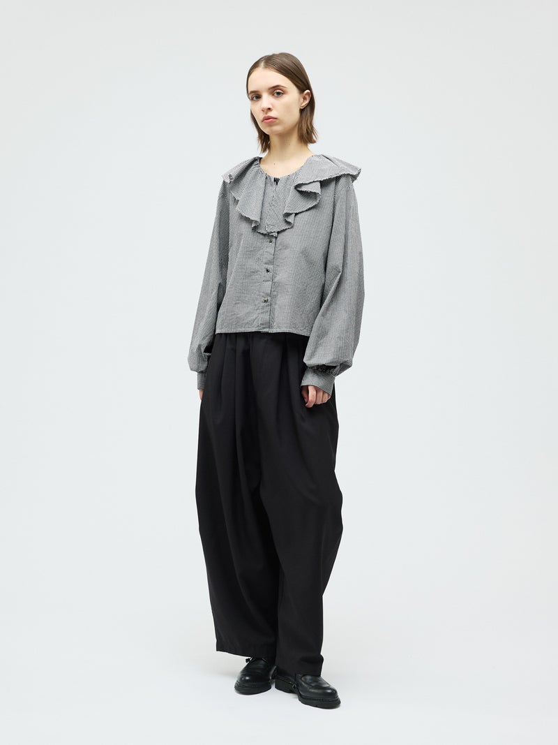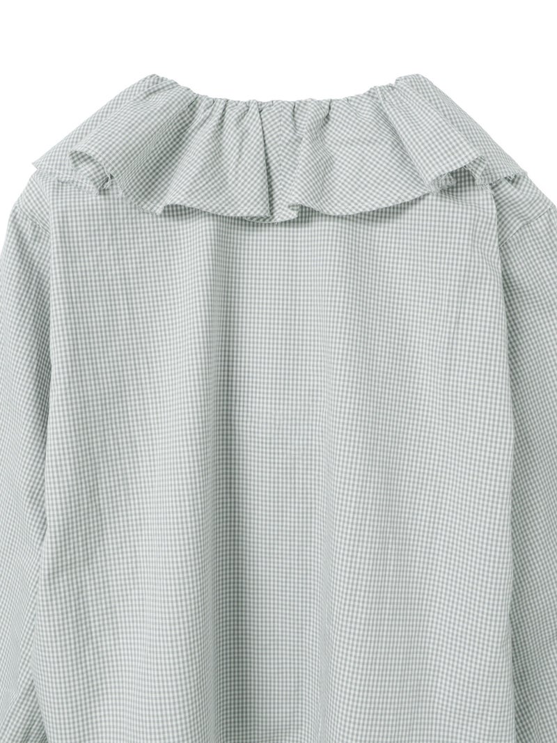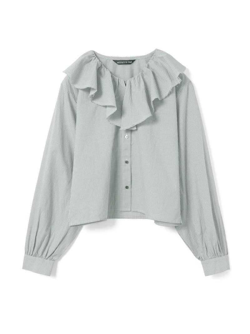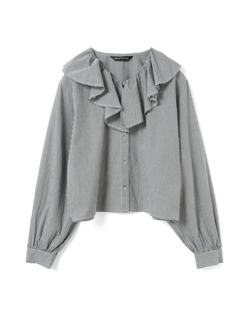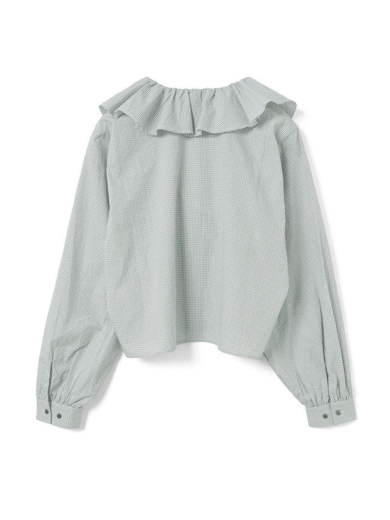 洗いをかけた粗野感のある生地を使用したチェックフリルギャザーカラーシャツです。小さく控えめなギンガムチェック柄にフリルの1枚襟をデザインした特徴的な1枚。フリル系アイテムは今季も継続して人気で、襟を出してインナー使いとしても重宝し、顔映りを華やかにしてくれるデザインです。落ち着きのある2色のカラー展開。すっきりとしたヒップ上の丈感で袖も軽くふんわりとしています。モノトーンのアイテムと相性よくコーディネートしていただけます。