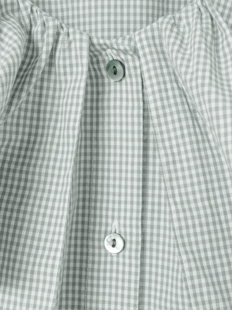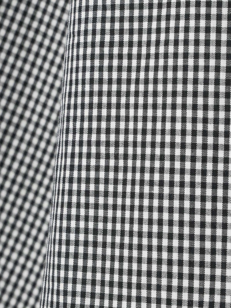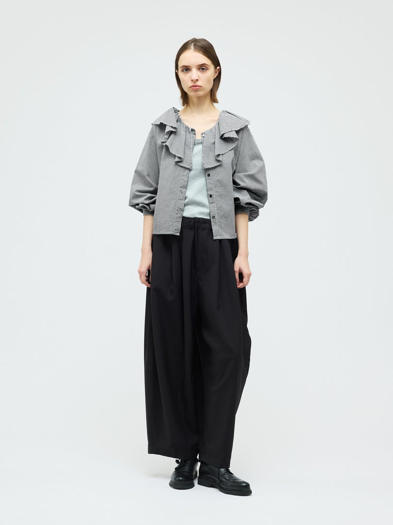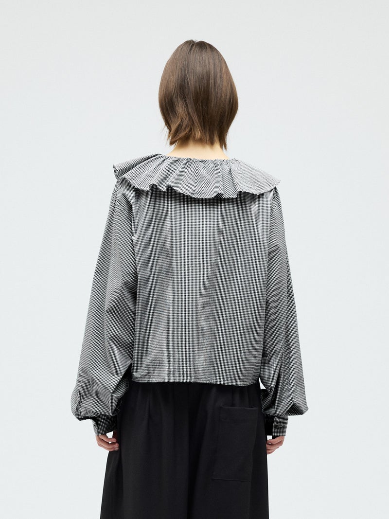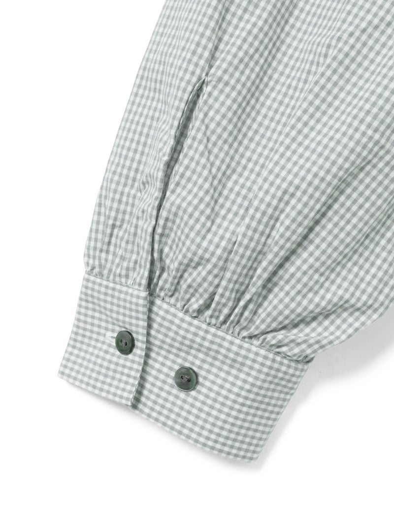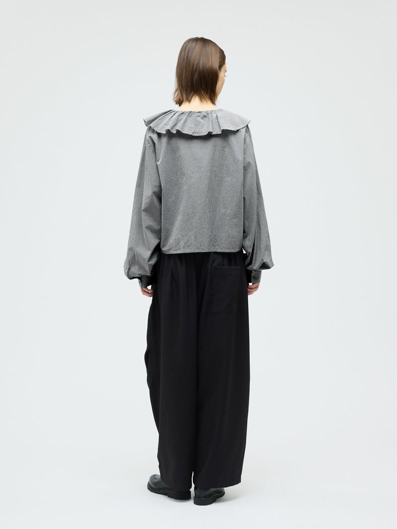洗いをかけた粗野感のある生地を使用したチェックフリルギャザーカラーシャツです。小さく控えめなギンガムチェック柄にフリルの1枚襟をデザインした特徴的な1枚。フリル系アイテムは今季も継続して人気で、襟を出してインナー使いとしても重宝し、顔映りを華やかにしてくれるデザインです。落ち着きのある2色のカラー展開。すっきりとしたヒップ上の丈感で袖も軽くふんわりとしています。モノトーンのアイテムと相性よくコーディネートしていただけます。