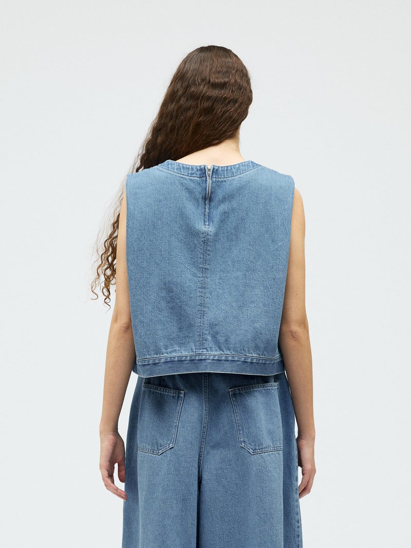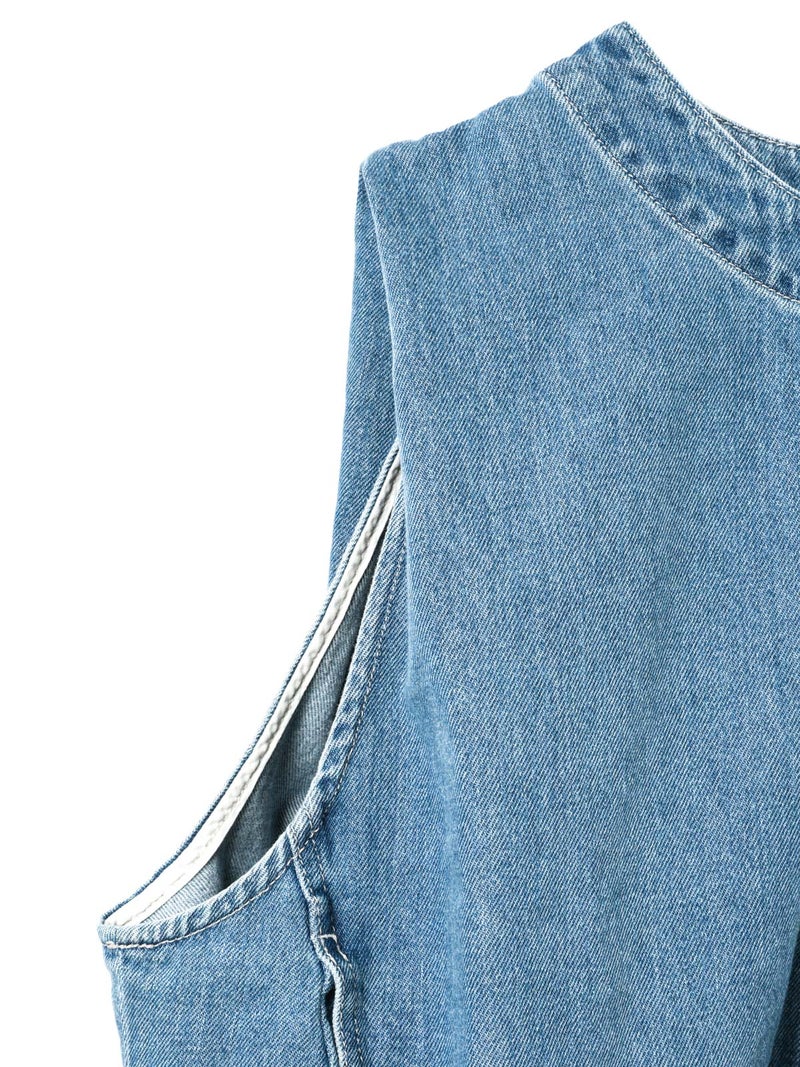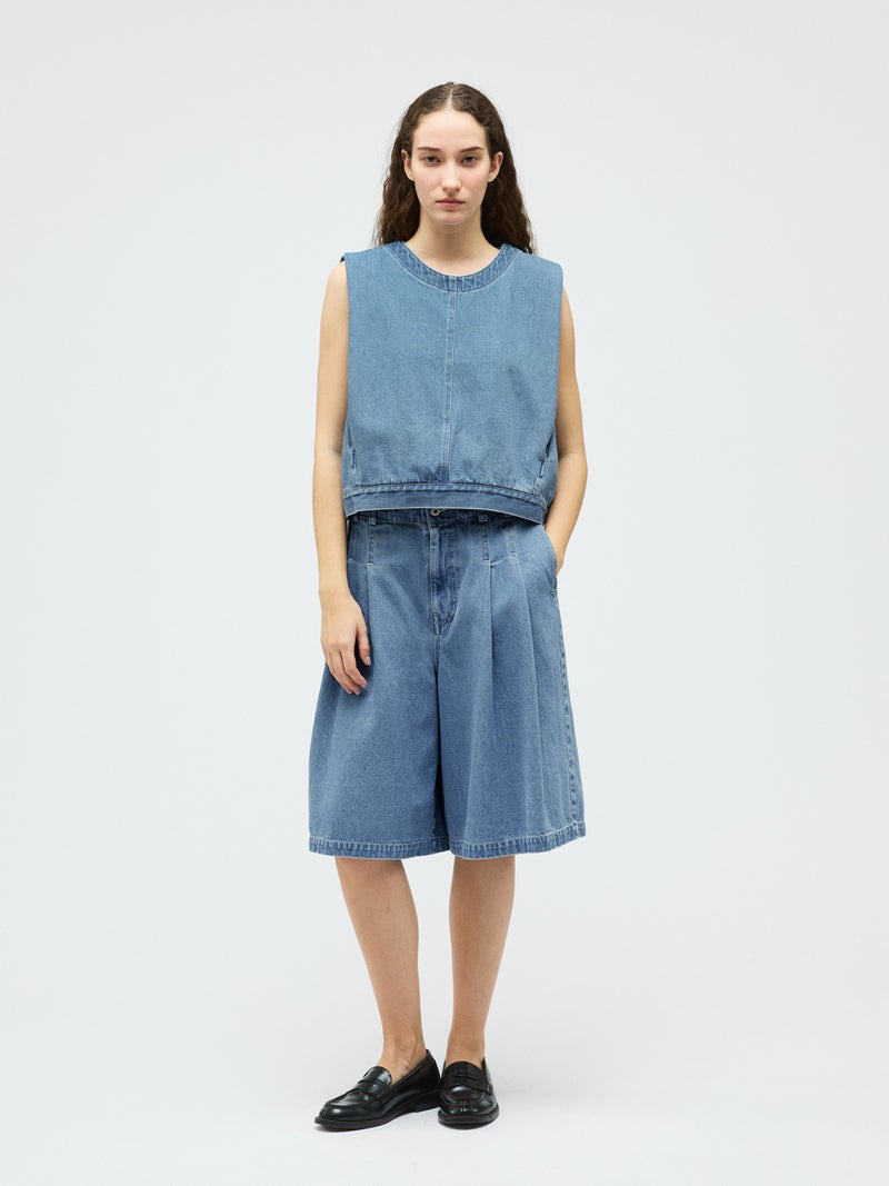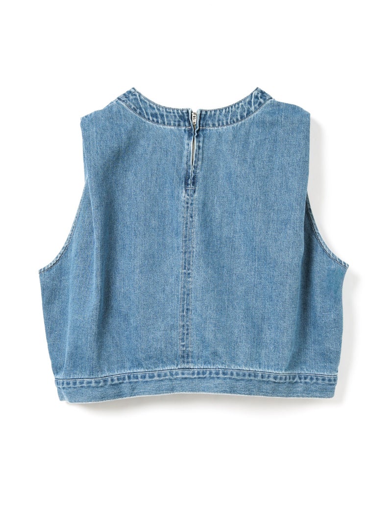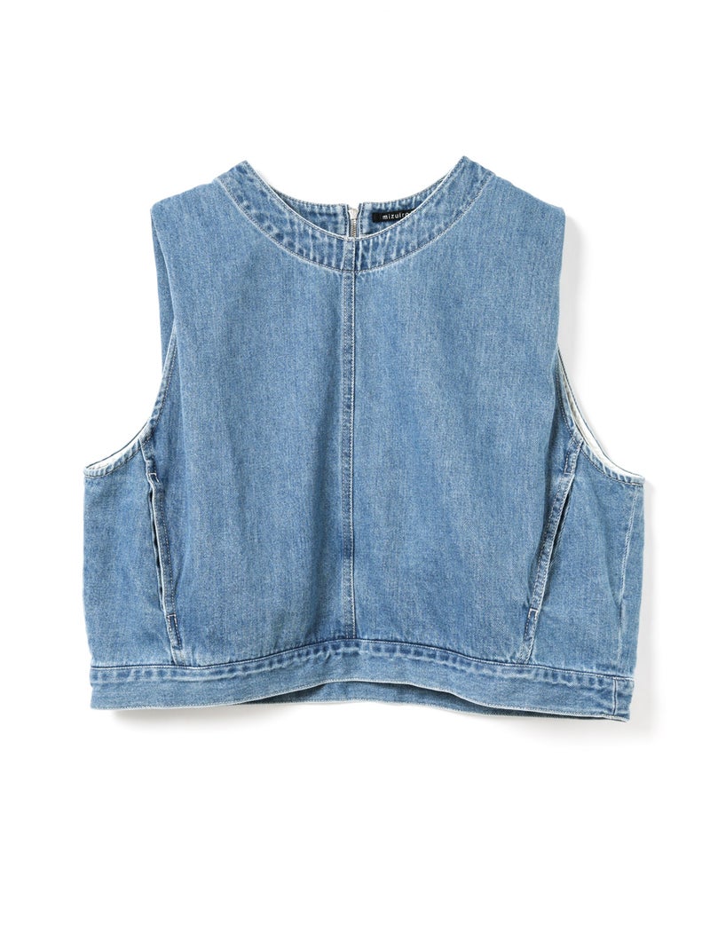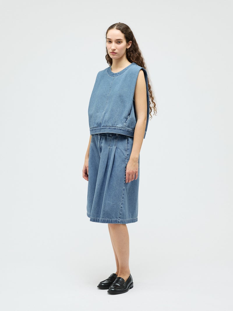10オンスのデニムを使用した程よい厚みと柔らかさが特徴のデニムベスト(BLEACH)です。アームと身頃幅が広く袖を通しやすく重ね着のしやすいデザインがポイント。肩部分の生地を内側に折り込むことで肩幅をすっきりと見せ、立体感のあるシルエットに仕上げました。すっきりとしたショート丈はサイドにポケット付。身頃をセンターで縫い合わせ、裾幅があることでベストのデザイン性が光った1枚。バックネックにはジップが付いているので着脱しやすいデザインに仕上がっています。色褪せで味のあるBLEACH生地以外にベーシックカラーで仕上げた1-230157OW/デニムベスト(ONEWASH)も展開。雰囲気の異なるベストアイテムとしてお勧めです。