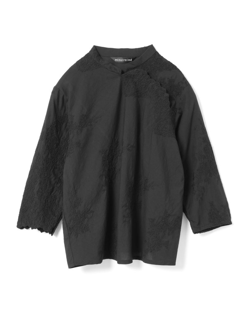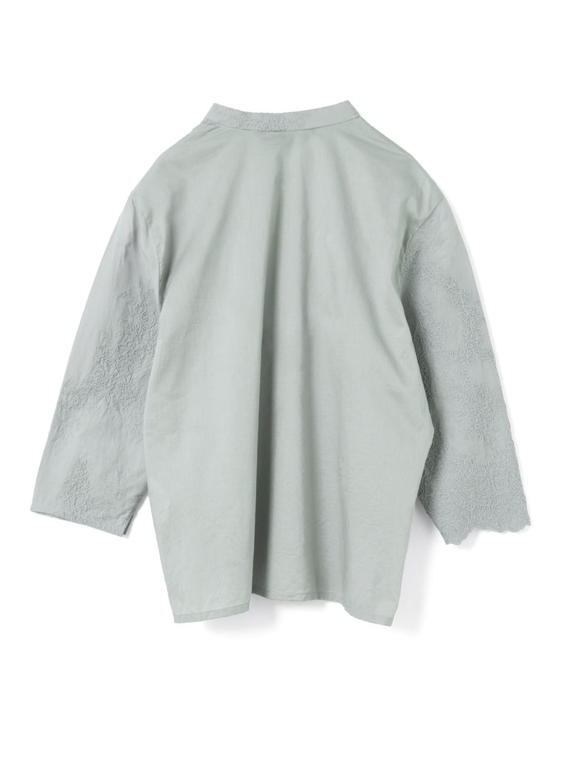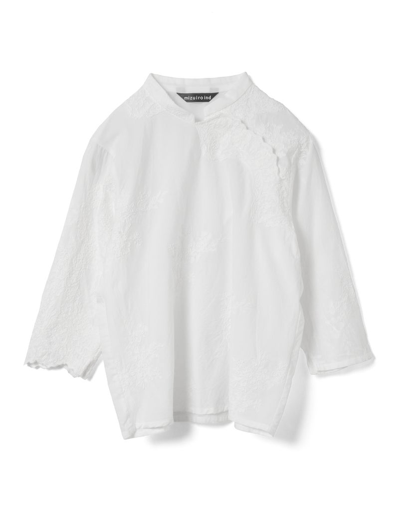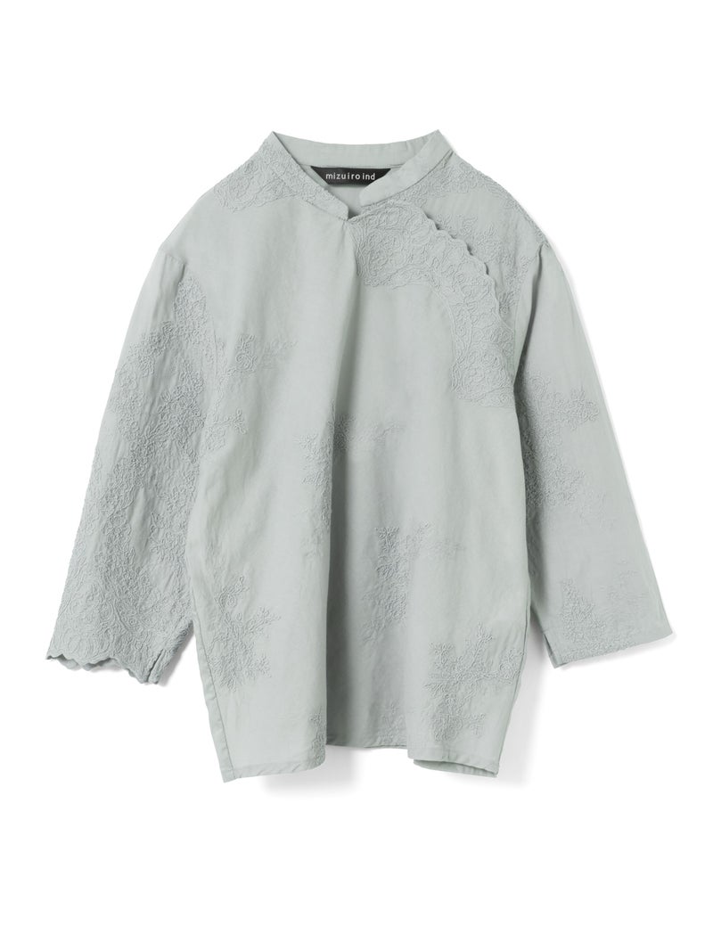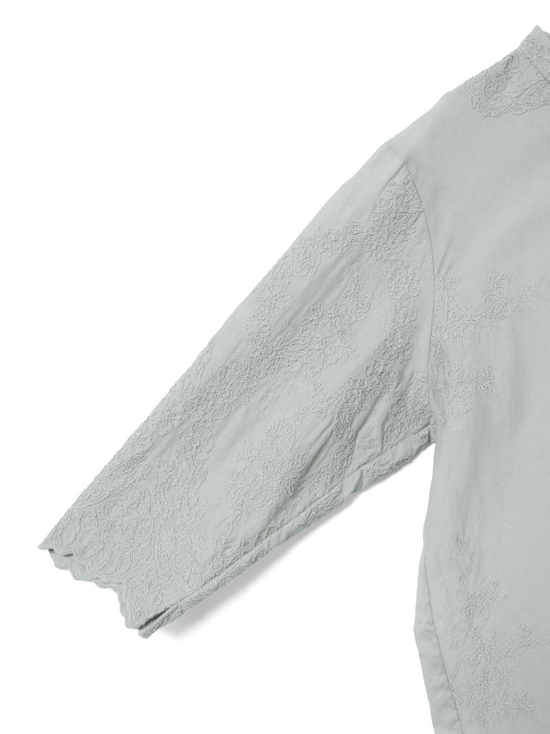 アンティーク調のレース地を使用してデザインしたレースシノワズリシャツです。チャイナシャツ風デザインに落とし込み、右袖はスカラップデザインを生かした袖口が特徴的。左ネックに隠れボタンが付いており、留め外しのしやすいデザインがポイント。バックの身頃面のみレースの無い無地で仕上げています。ヒップにかかるほどの丈感で程よくゆとりのあるサイズ感となっています。シンプルなデザインですがレースの華やかさと上品な雰囲気を印象付けた1枚です。