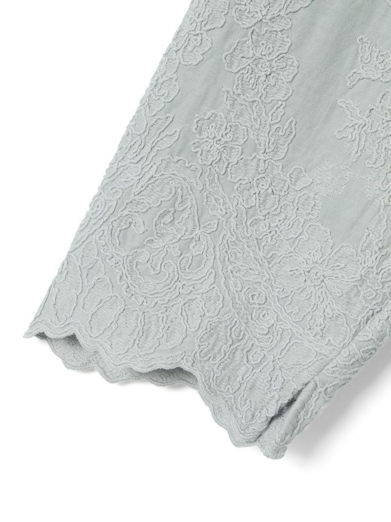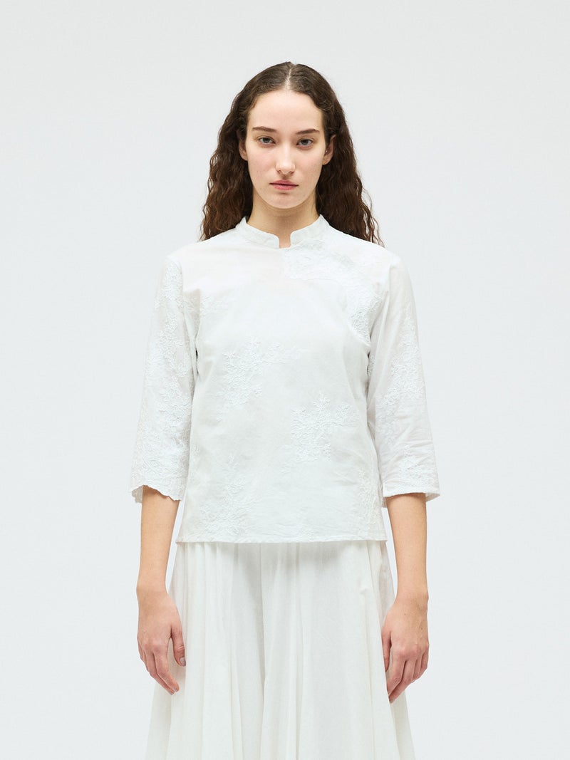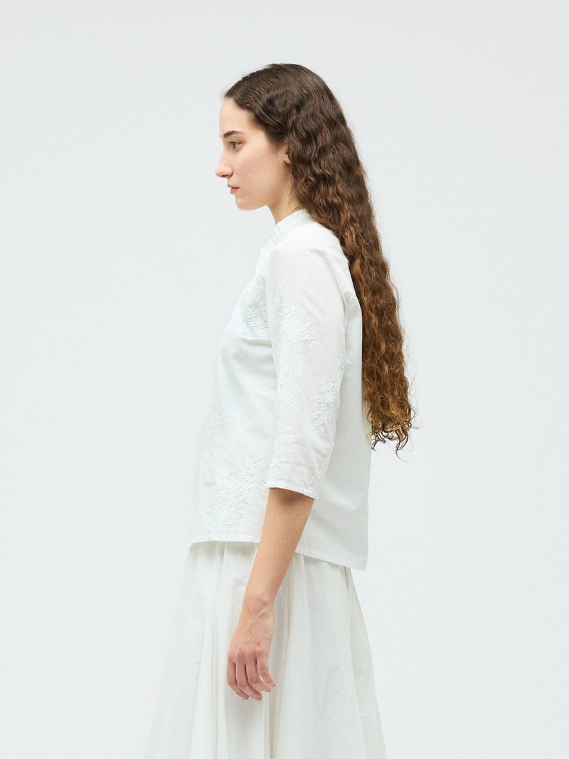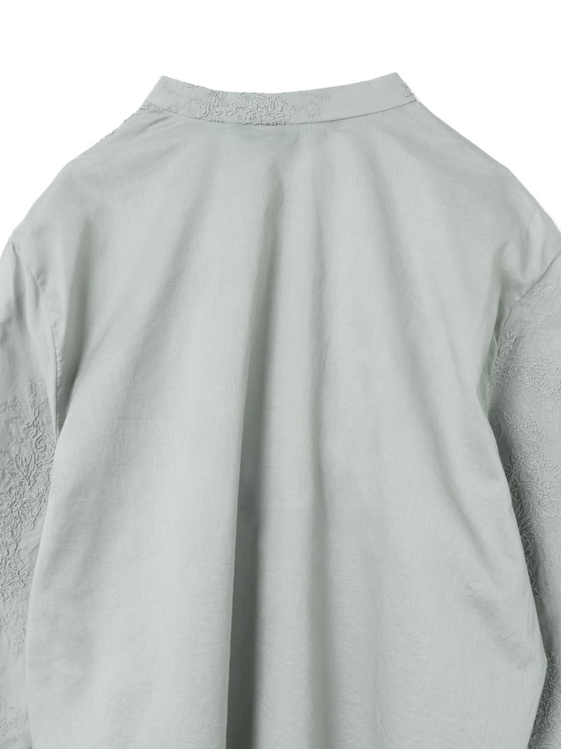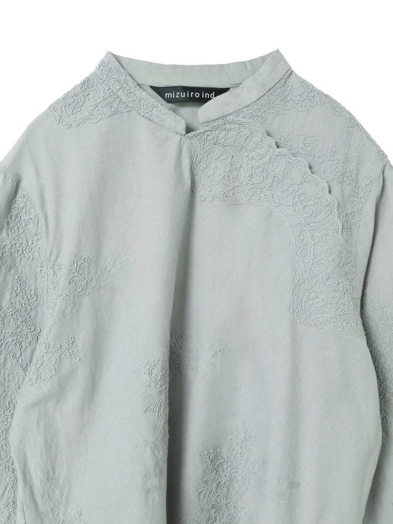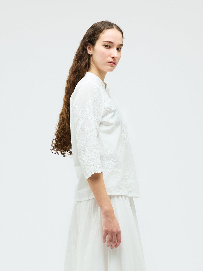 アンティーク調のレース地を使用してデザインしたレースシノワズリシャツです。チャイナシャツ風デザインに落とし込み、右袖はスカラップデザインを生かした袖口が特徴的。左ネックに隠れボタンが付いており、留め外しのしやすいデザインがポイント。バックの身頃面のみレースの無い無地で仕上げています。ヒップにかかるほどの丈感で程よくゆとりのあるサイズ感となっています。シンプルなデザインですがレースの華やかさと上品な雰囲気を印象付けた1枚です。