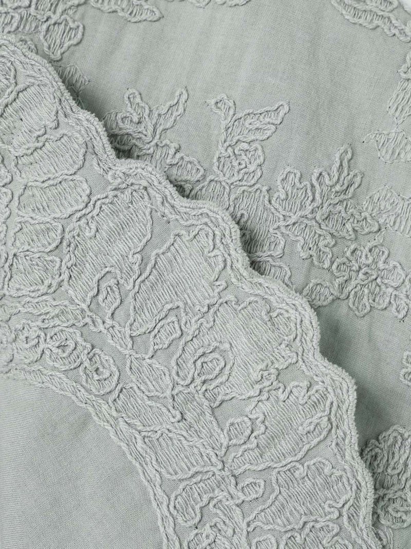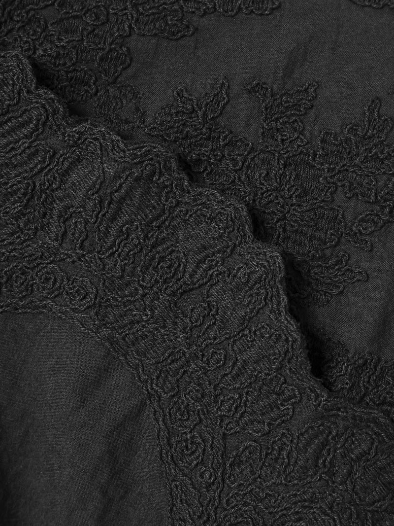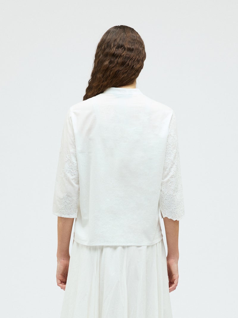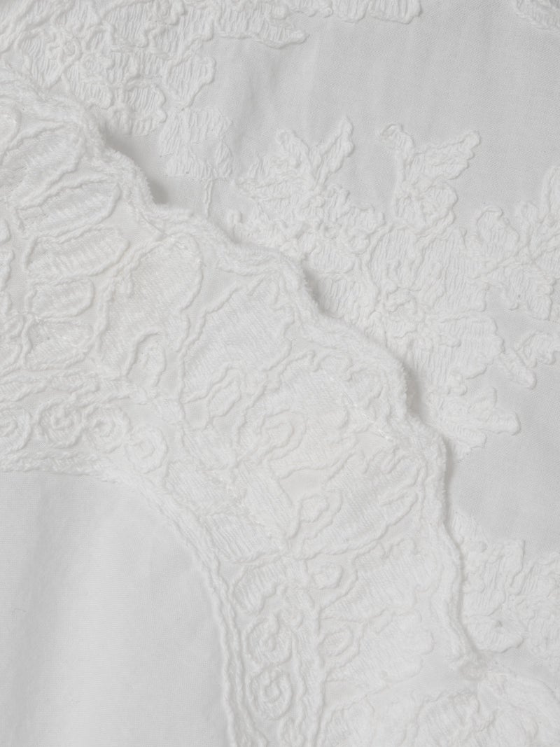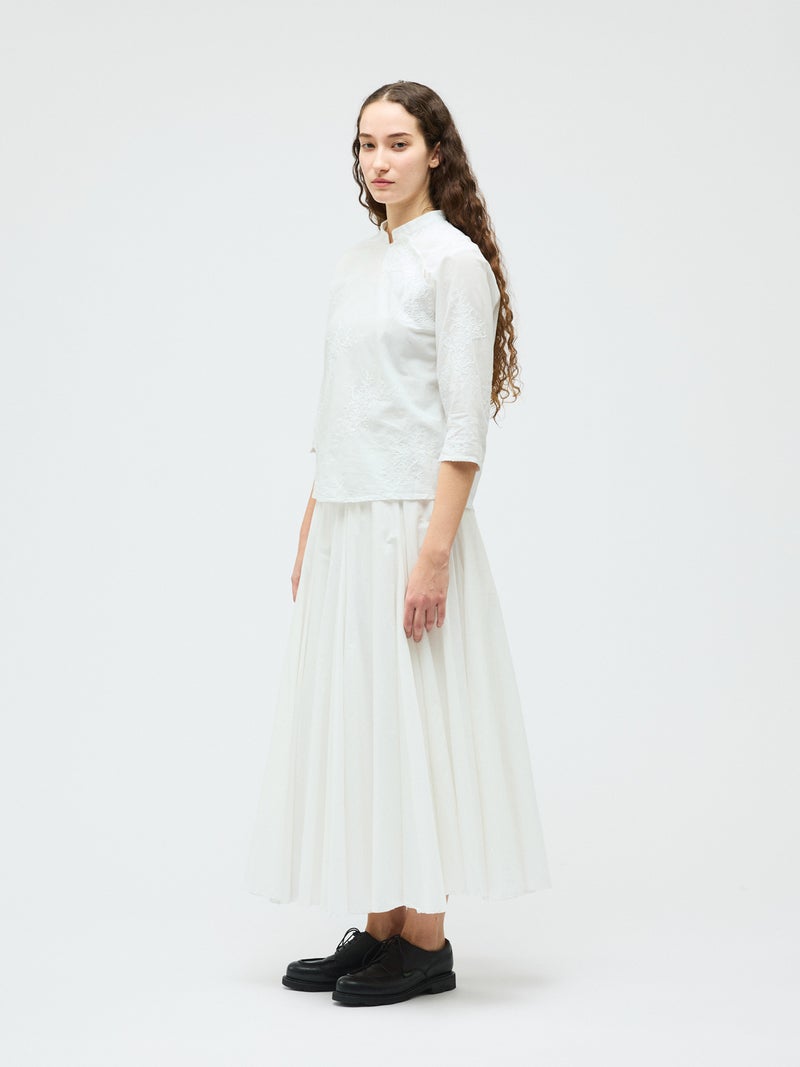 アンティーク調のレース地を使用してデザインしたレースシノワズリシャツです。チャイナシャツ風デザインに落とし込み、右袖はスカラップデザインを生かした袖口が特徴的。左ネックに隠れボタンが付いており、留め外しのしやすいデザインがポイント。バックの身頃面のみレースの無い無地で仕上げています。ヒップにかかるほどの丈感で程よくゆとりのあるサイズ感となっています。シンプルなデザインですがレースの華やかさと上品な雰囲気を印象付けた1枚です。