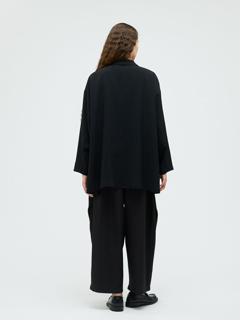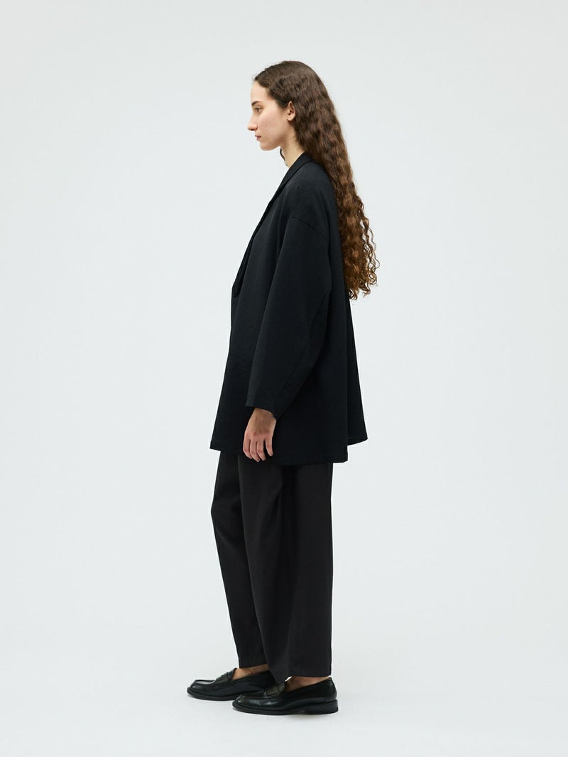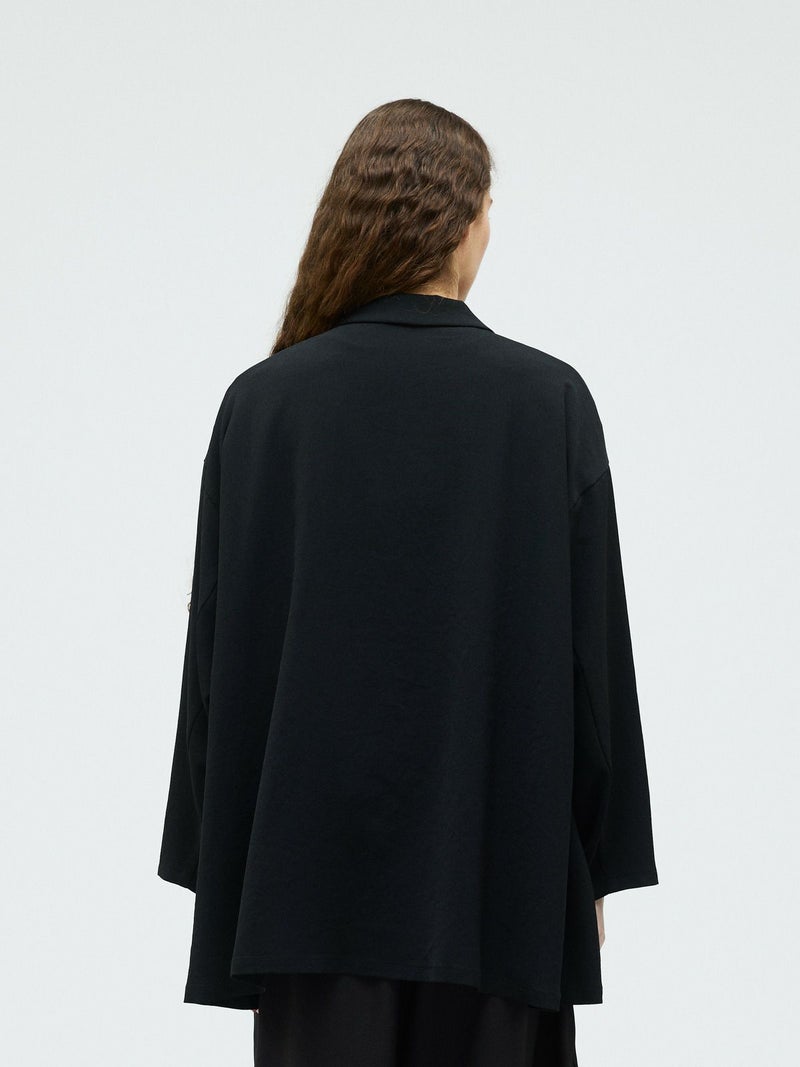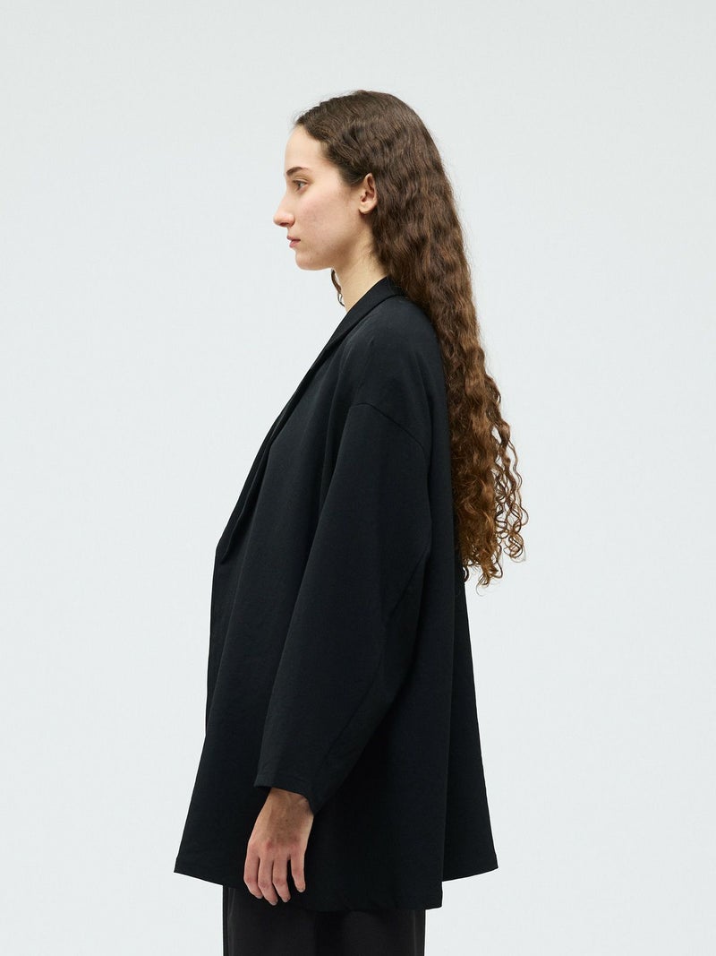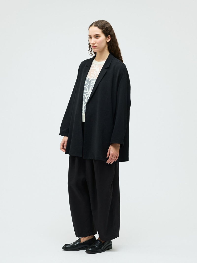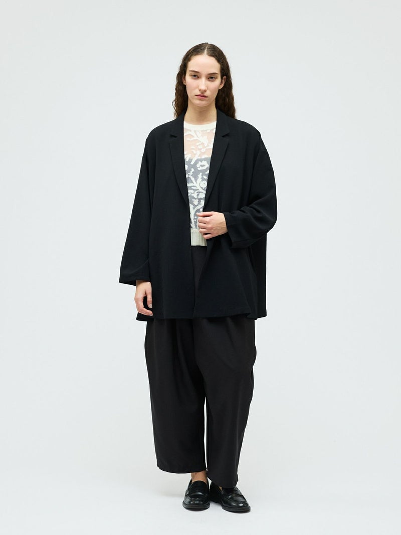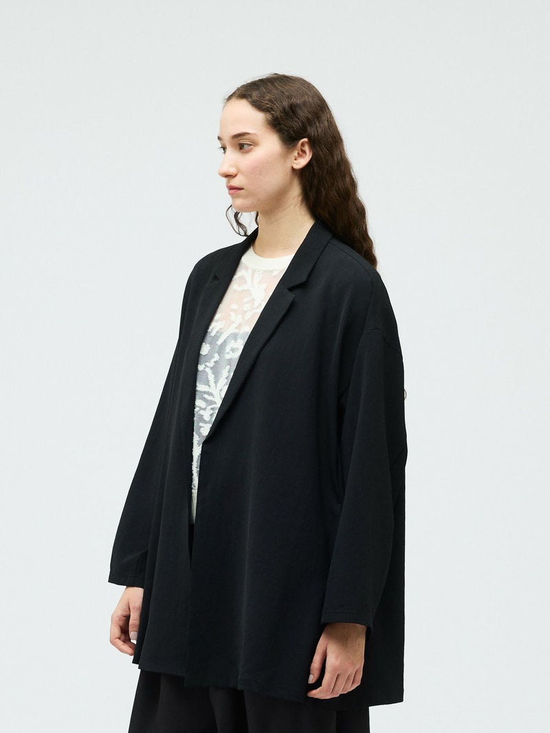 mizuiro ind定番のデザインで、ドライツイルワッシャー素材で仕上げたテーラードシャツジャケットです。さらっとした肌触りが特徴。ボタンはなくすっきりとしたヒップの隠れる少し長めのデザインを表現。上品に広がりのあるフレアラインが印象的でしなやかに動きのあるシルエットを演出します。上下セットアップでお勧めで、1-260109/ラップライクイージーパンツと春のオケージョン対応に活躍していただけます。