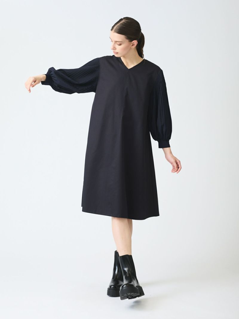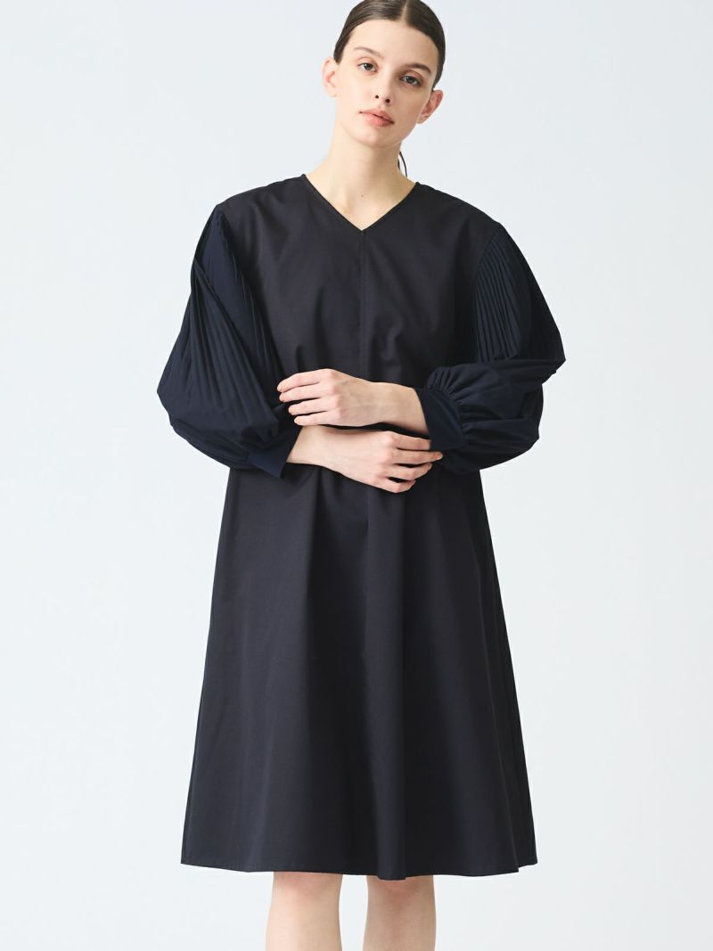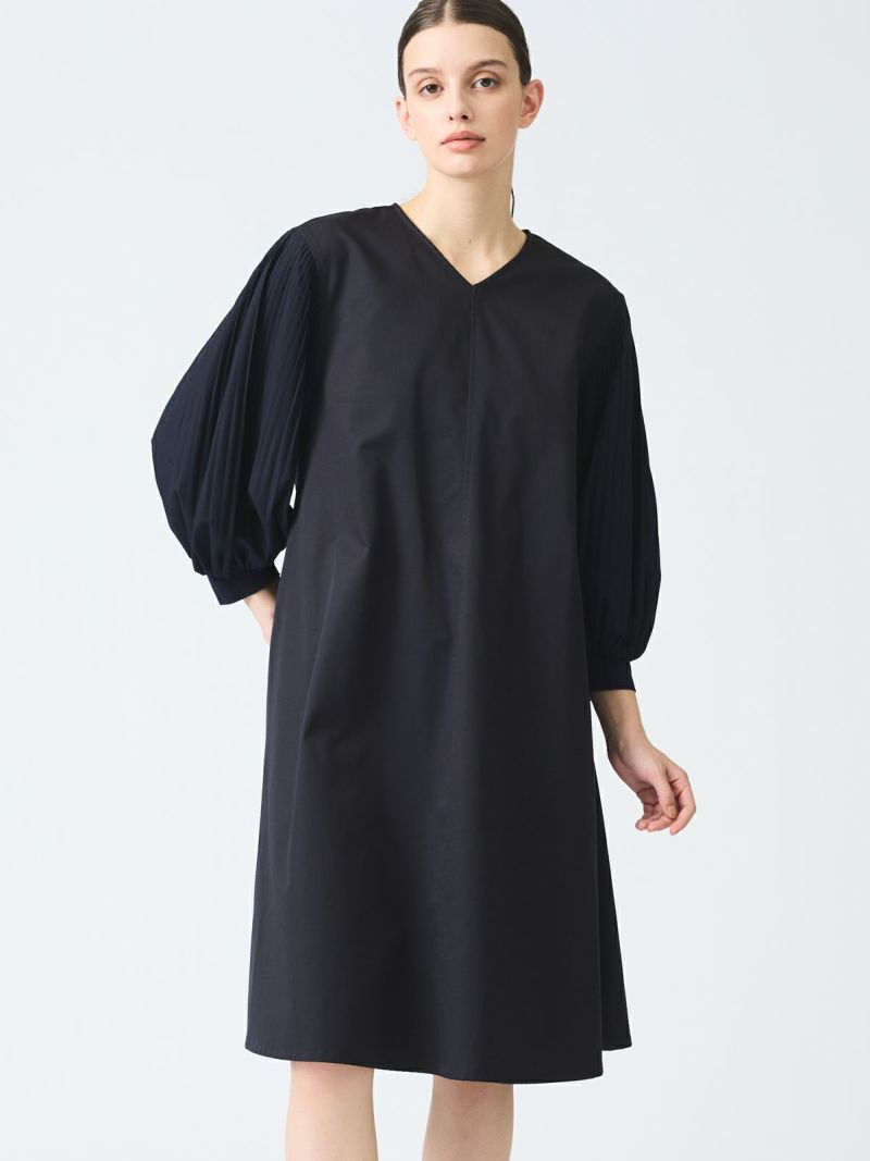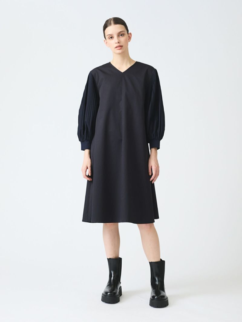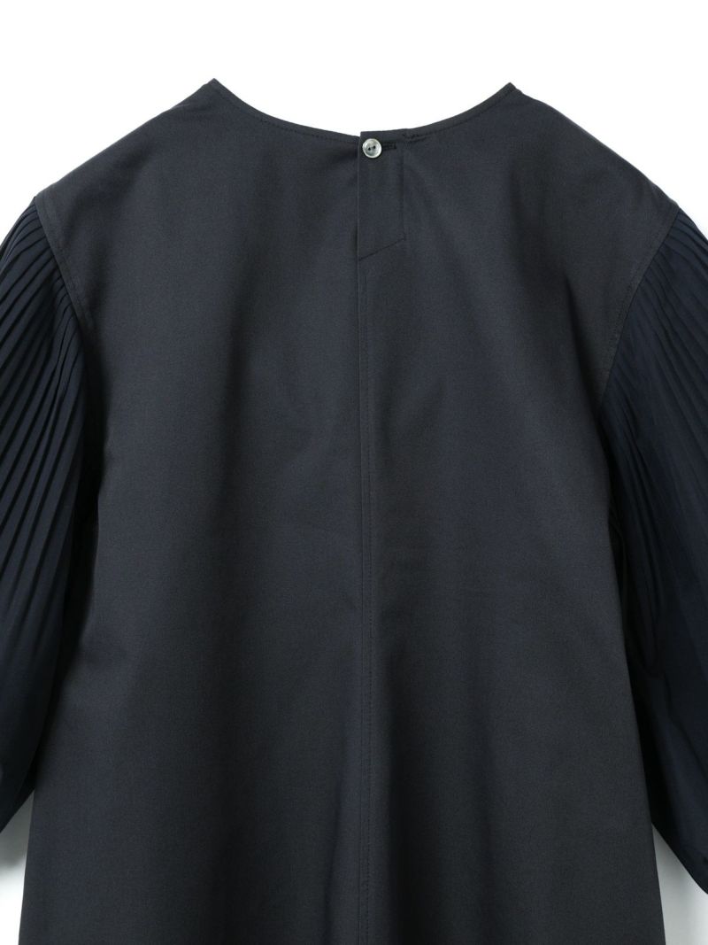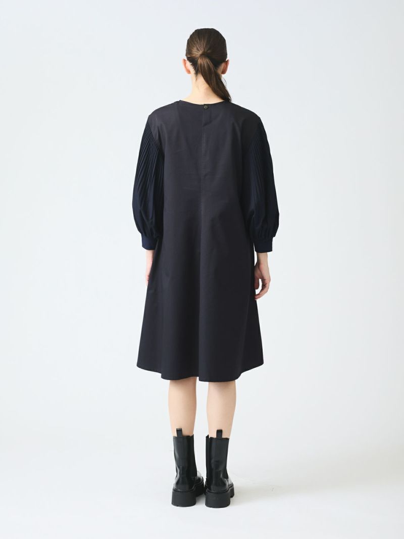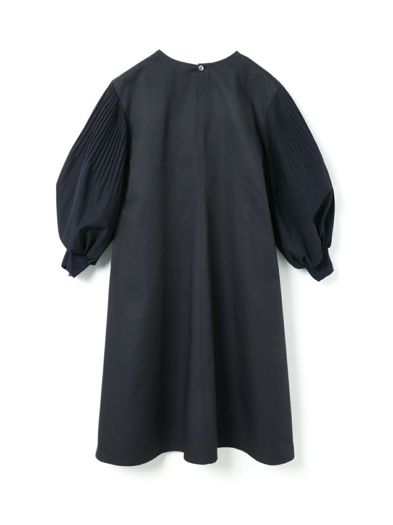 マットな表情とソフトな風合いが特徴の23sTCツイルを使用したプリーツパフスリーブワンピースです。上品な光沢感のある生地です。プリーツを施したふんわり感のある袖部分はTCブロードを使用。バックネック部分にボタンが付いているので着脱のしやすいワンピースです。 膝下丈の清楚なシルエットが魅力的でオケージョン対応にもお勧めです。同シリーズ1-230103/プリーツパフスリーブプルオーバーも展開。