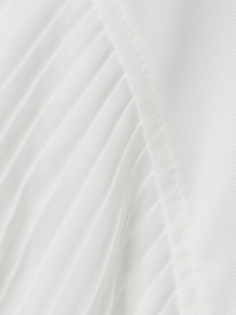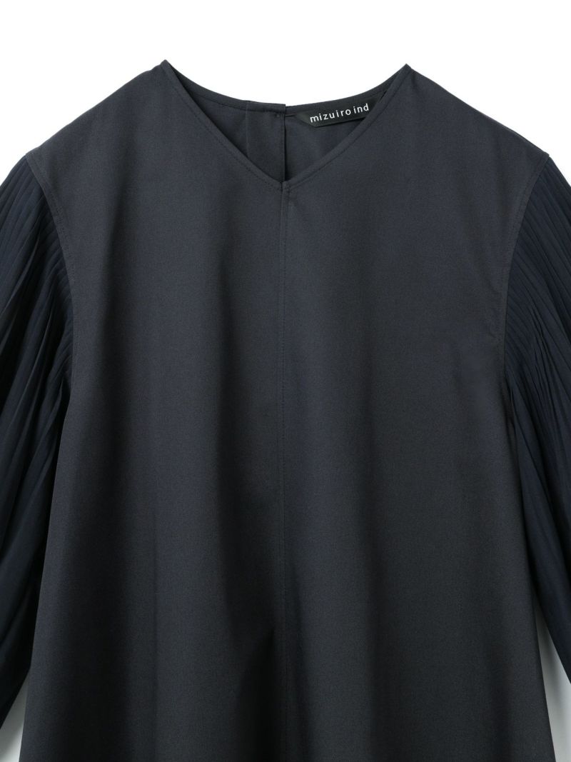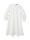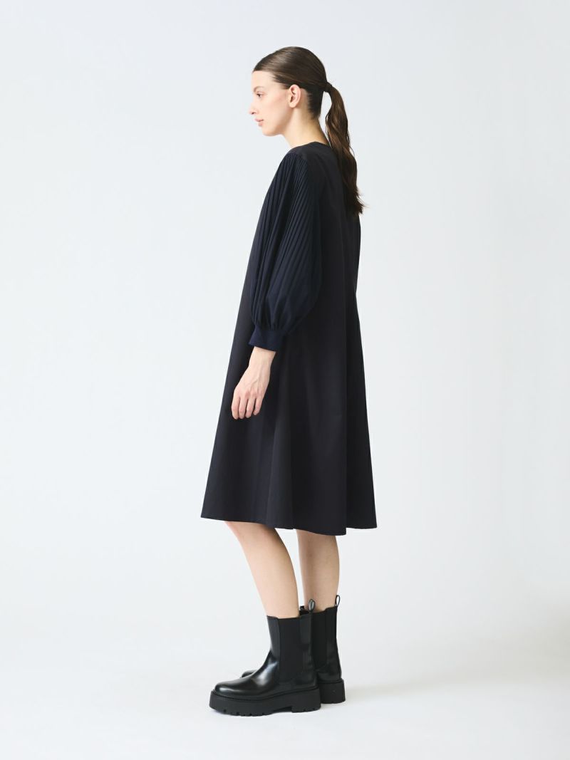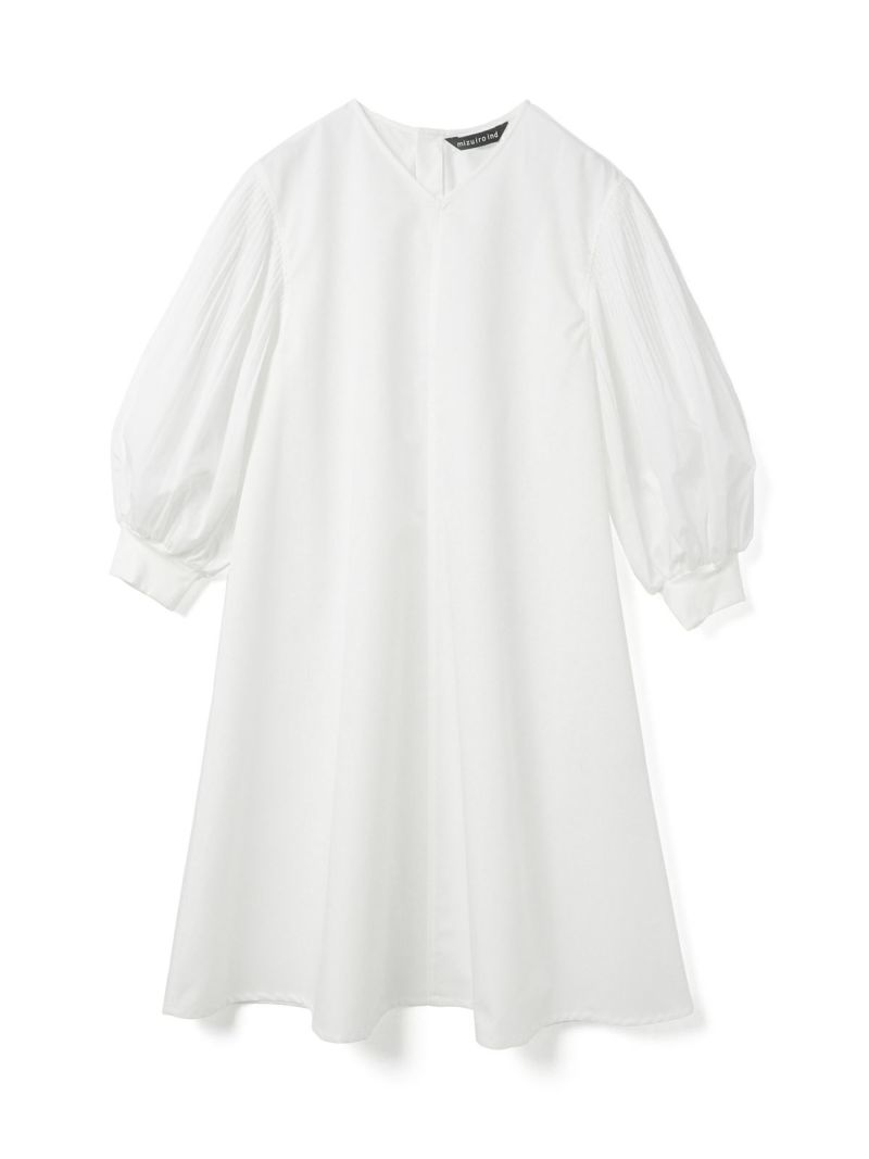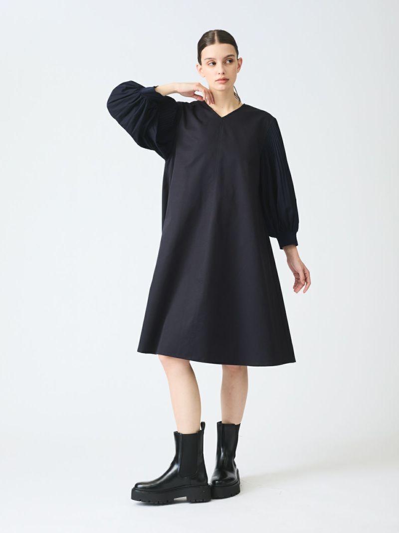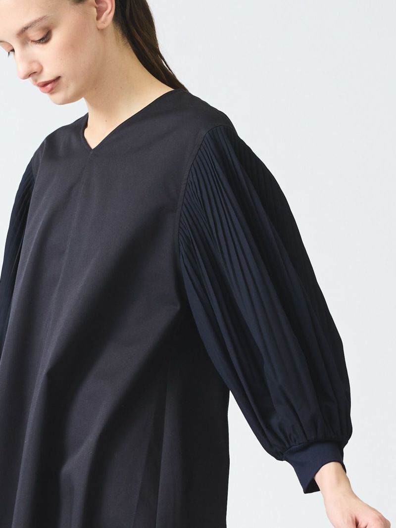 マットな表情とソフトな風合いが特徴の23sTCツイルを使用したプリーツパフスリーブワンピースです。上品な光沢感のある生地です。プリーツを施したふんわり感のある袖部分はTCブロードを使用。バックネック部分にボタンが付いているので着脱のしやすいワンピースです。 膝下丈の清楚なシルエットが魅力的でオケージョン対応にもお勧めです。同シリーズ1-230103/プリーツパフスリーブプルオーバーも展開。