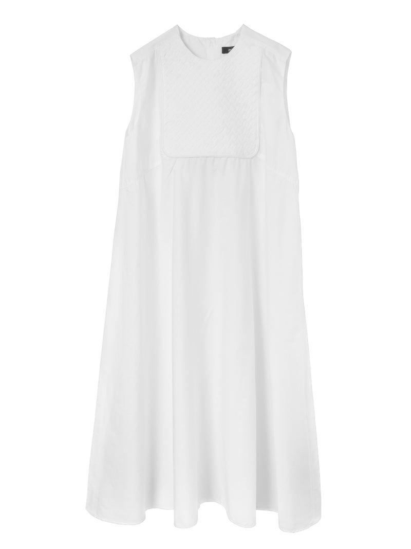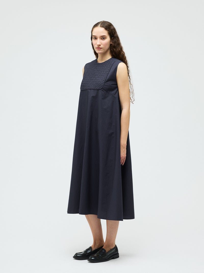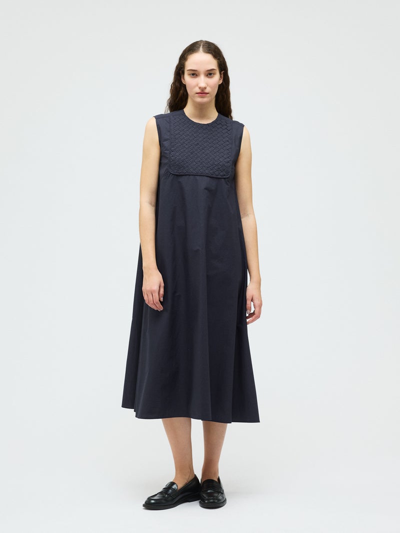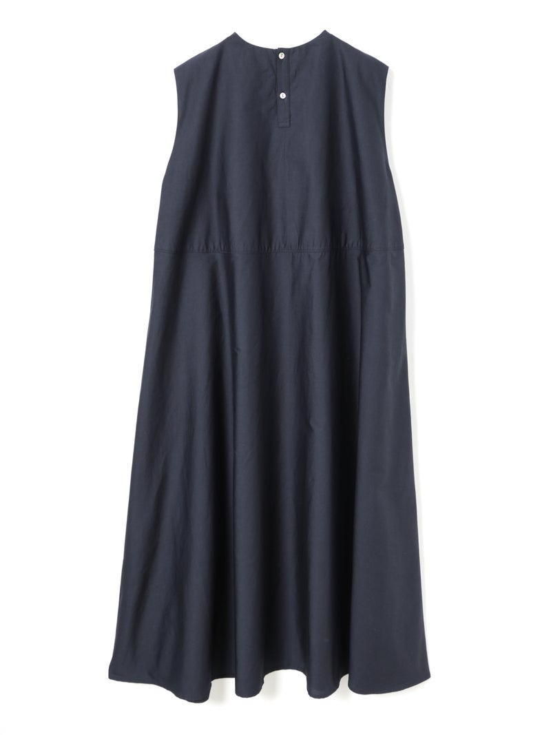 ハリのあるコットン生地にバイヤスにカットした共布を筒状にし、手仕事で斜めに編み込んだ特徴的な肩胸のデザインが魅力のブランディングクロスフレアワンピースです。胸下で切り替えたクロス部分と上品なフレアのきいたロング丈の清楚なワンピースに仕上げました。広がり過ぎないシルエットを表現。ハリのある生地感なので型崩れもしにくく、ワンピースのシンプルなデザインが長く保たれた1枚です。バックネックにボタンが付いているので着脱しやすいところもポイント。春先はカーディガンを羽織っていただいたり、夏場はノースリーブも素敵で、季節に合わせて長くコーディネートしていただける1枚です。同じデザインのクロスを使用した1-230145/ブランディングクロスシャツも展開。