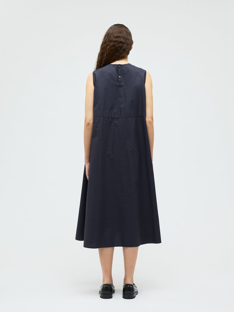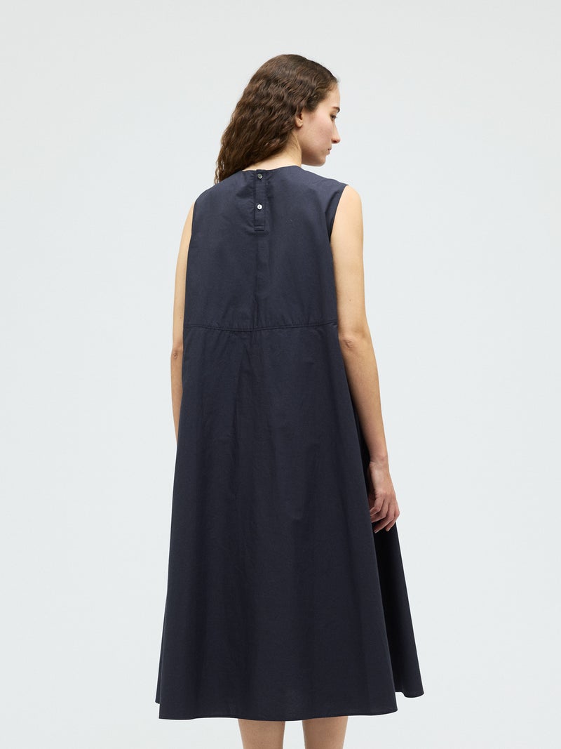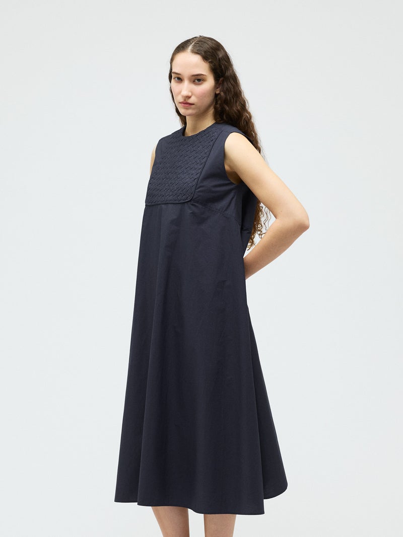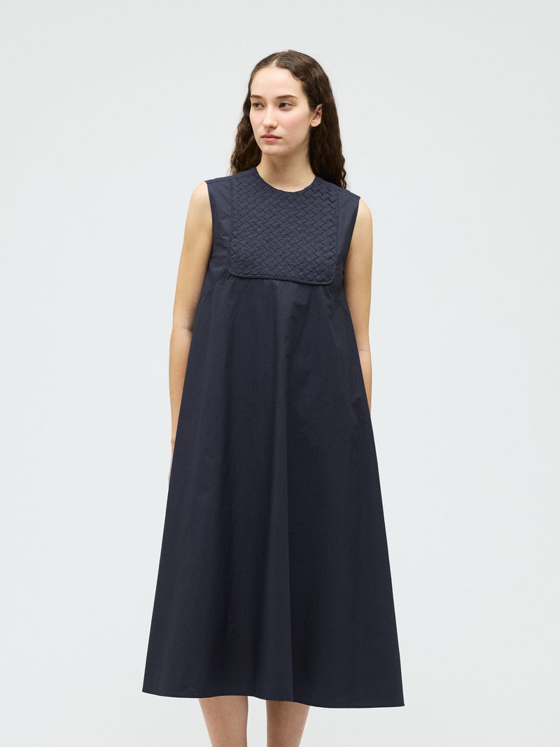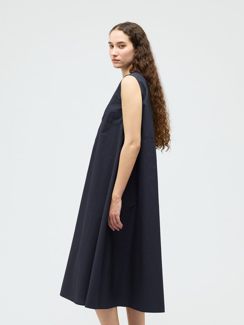 ハリのあるコットン生地にバイヤスにカットした共布を筒状にし、手仕事で斜めに編み込んだ特徴的な肩胸のデザインが魅力のブランディングクロスフレアワンピースです。胸下で切り替えたクロス部分と上品なフレアのきいたロング丈の清楚なワンピースに仕上げました。広がり過ぎないシルエットを表現。ハリのある生地感なので型崩れもしにくく、ワンピースのシンプルなデザインが長く保たれた1枚です。バックネックにボタンが付いているので着脱しやすいところもポイント。春先はカーディガンを羽織っていただいたり、夏場はノースリーブも素敵で、季節に合わせて長くコーディネートしていただける1枚です。同じデザインのクロスを使用した1-230145/ブランディングクロスシャツも展開。