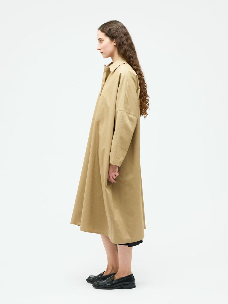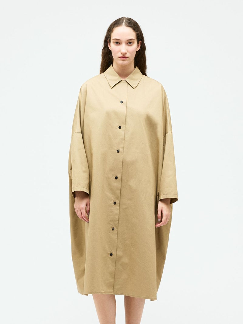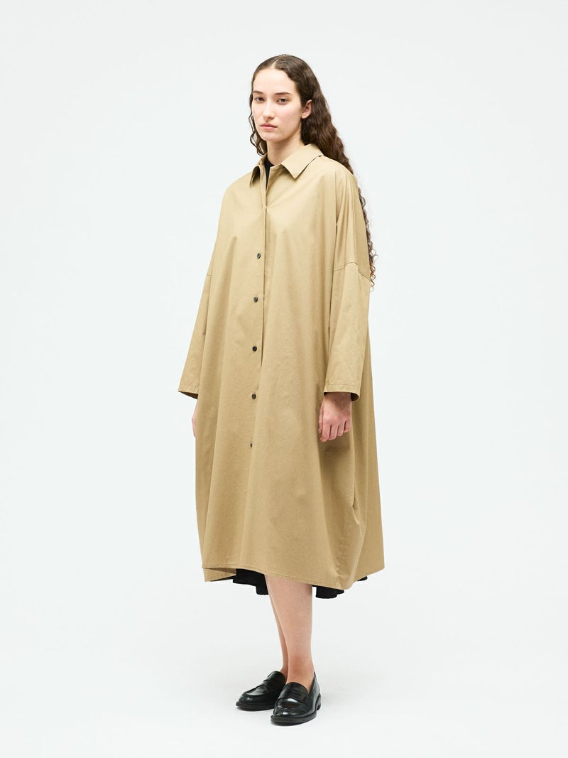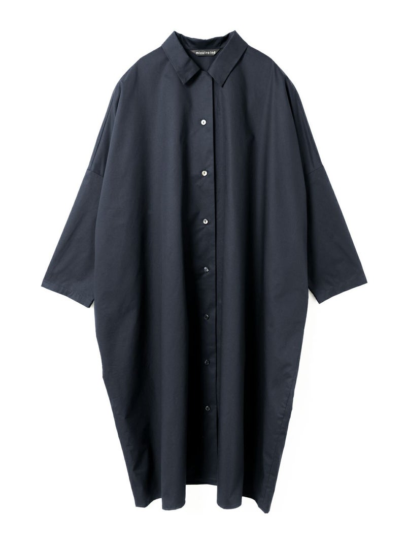 軽アウターとしても活躍するシャツワンピース。ゆったりと丸みのあるシルエットが印象的で、体のラインを拾いにくく、リラックス感のある着心地に仕上げました。前を閉じてワンピースとして、開けて羽織りとしても使えるためコーディネートの幅が広がる一枚です。素材には高密度コットンを使用し、程よいハリと上品さを兼ね備えたトラッドな雰囲気に。季節の変わり目には軽いコート感覚でも取り入れられ、長いシーズン活躍します。同型でデニムタイプ(1-250083)も展開。