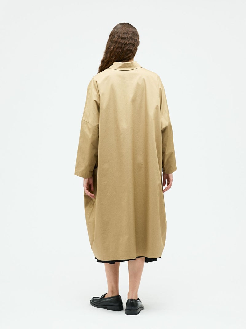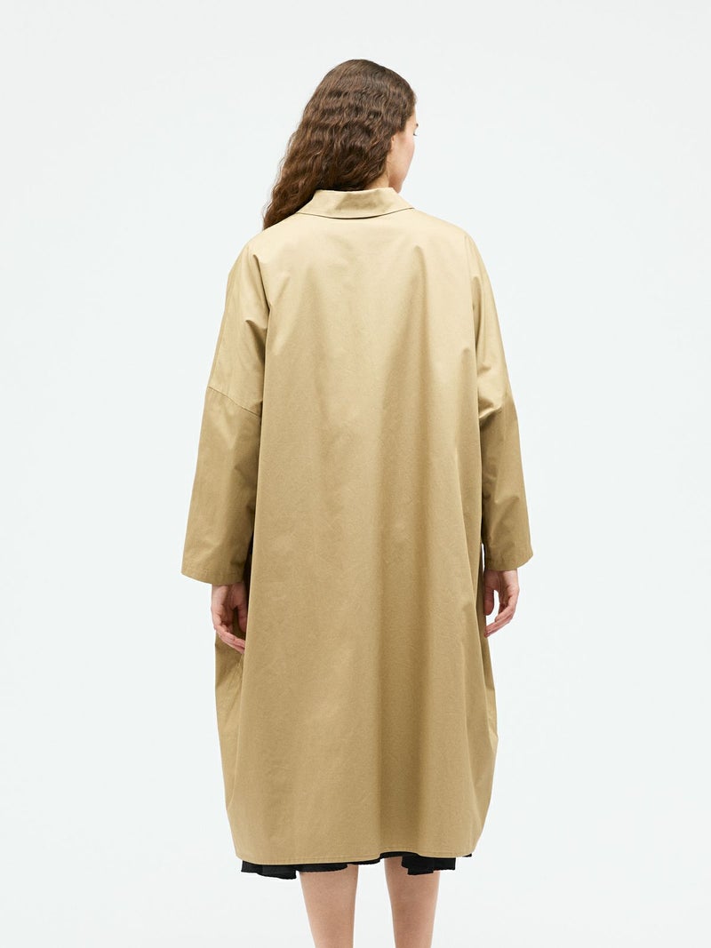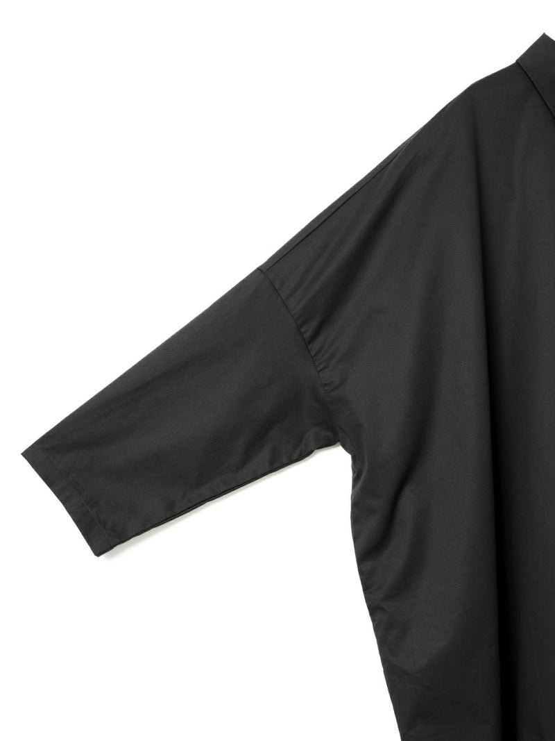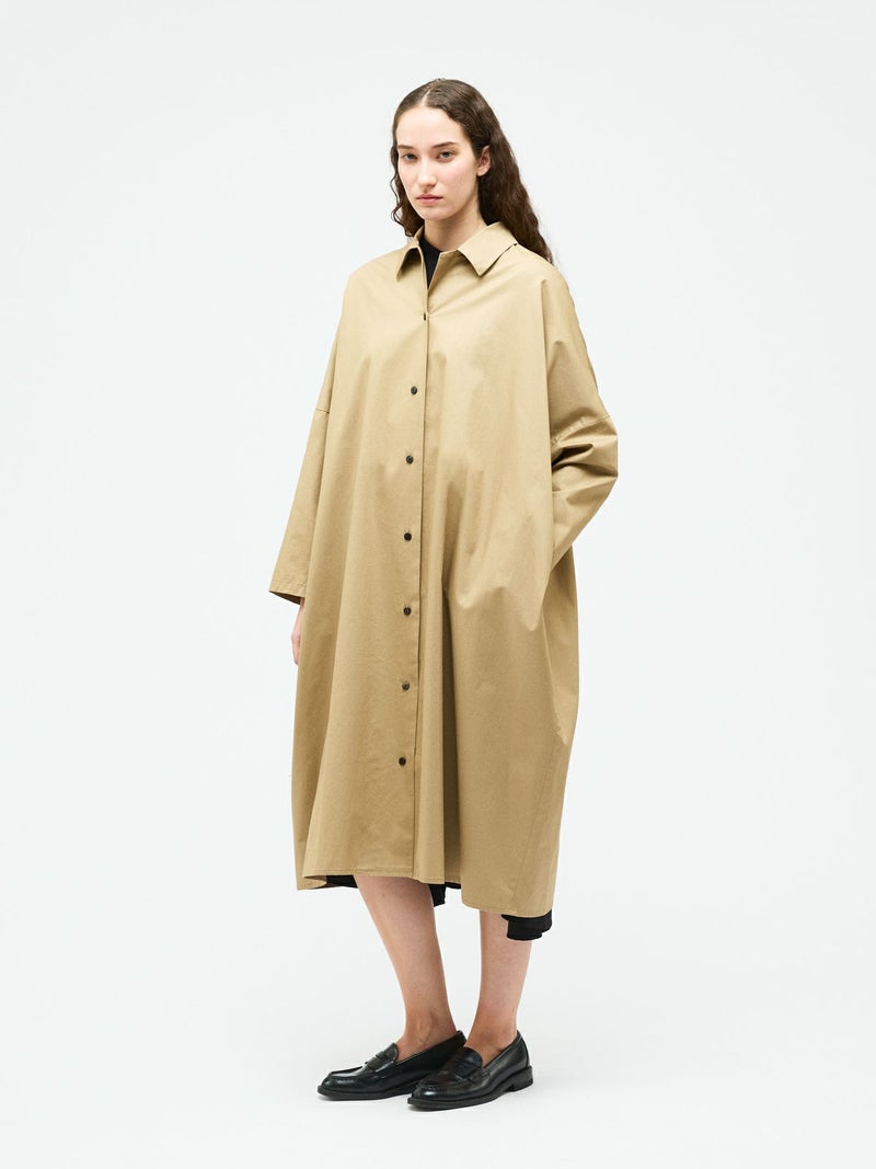 軽アウターとしても活躍するシャツワンピース。ゆったりと丸みのあるシルエットが印象的で、体のラインを拾いにくく、リラックス感のある着心地に仕上げました。前を閉じてワンピースとして、開けて羽織りとしても使えるためコーディネートの幅が広がる一枚です。素材には高密度コットンを使用し、程よいハリと上品さを兼ね備えたトラッドな雰囲気に。季節の変わり目には軽いコート感覚でも取り入れられ、長いシーズン活躍します。同型でデニムタイプ(1-250083)も展開。