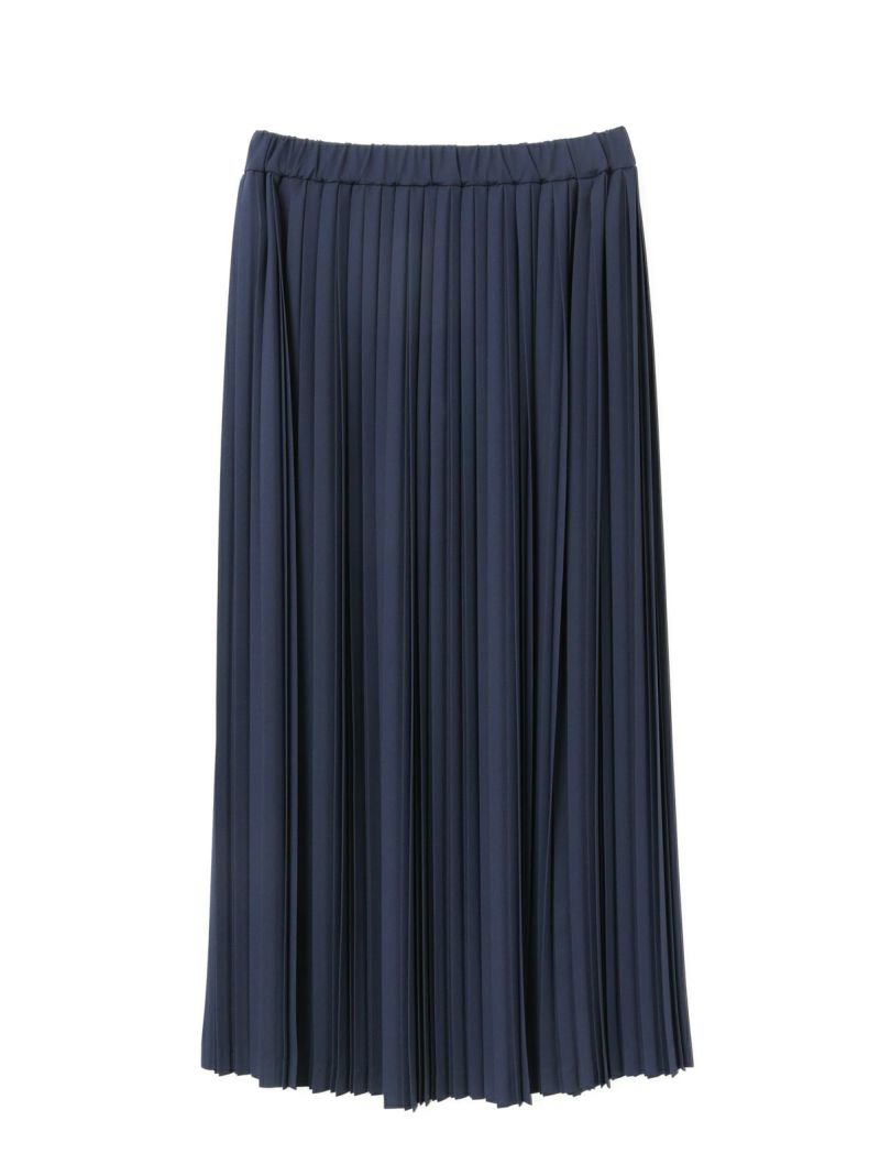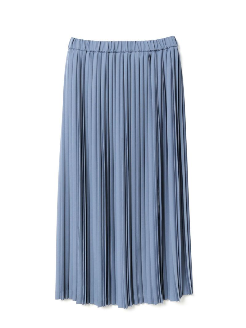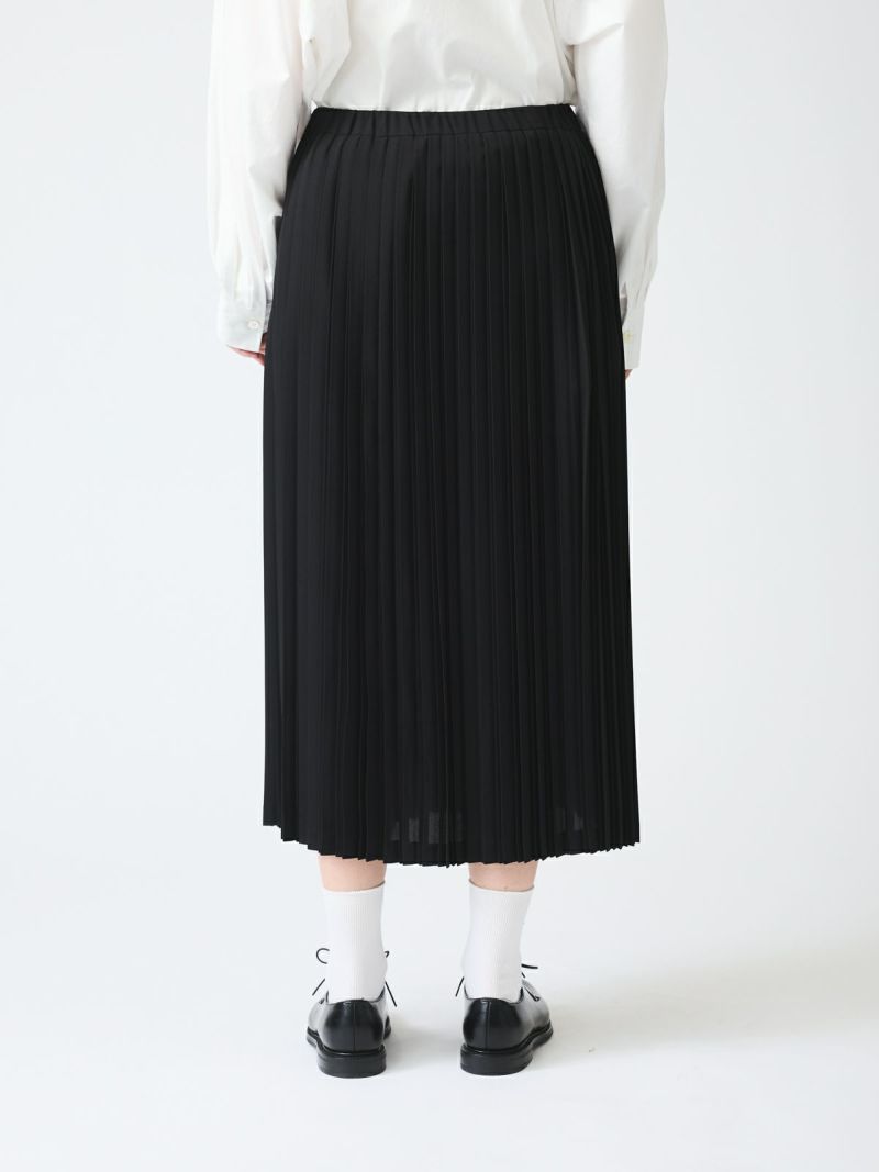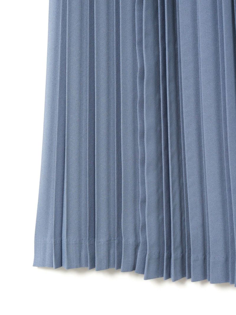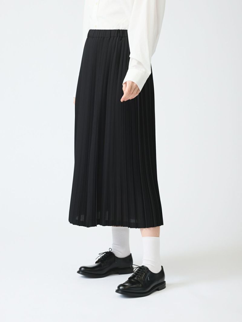 マットな表面感と上品な印象の薄手ジョーゼット素材を使用したプリーツスカートです。ダブルプリーツ加工で動くと生地の表情が綺麗です。見た目にはタイトなシルエットで広がりはなくスマートな印象。ウエストはリラックス感のあるゴム使用。膝下丈でソックスが見える丈感なので足元のオシャレを楽しんでいただけます。